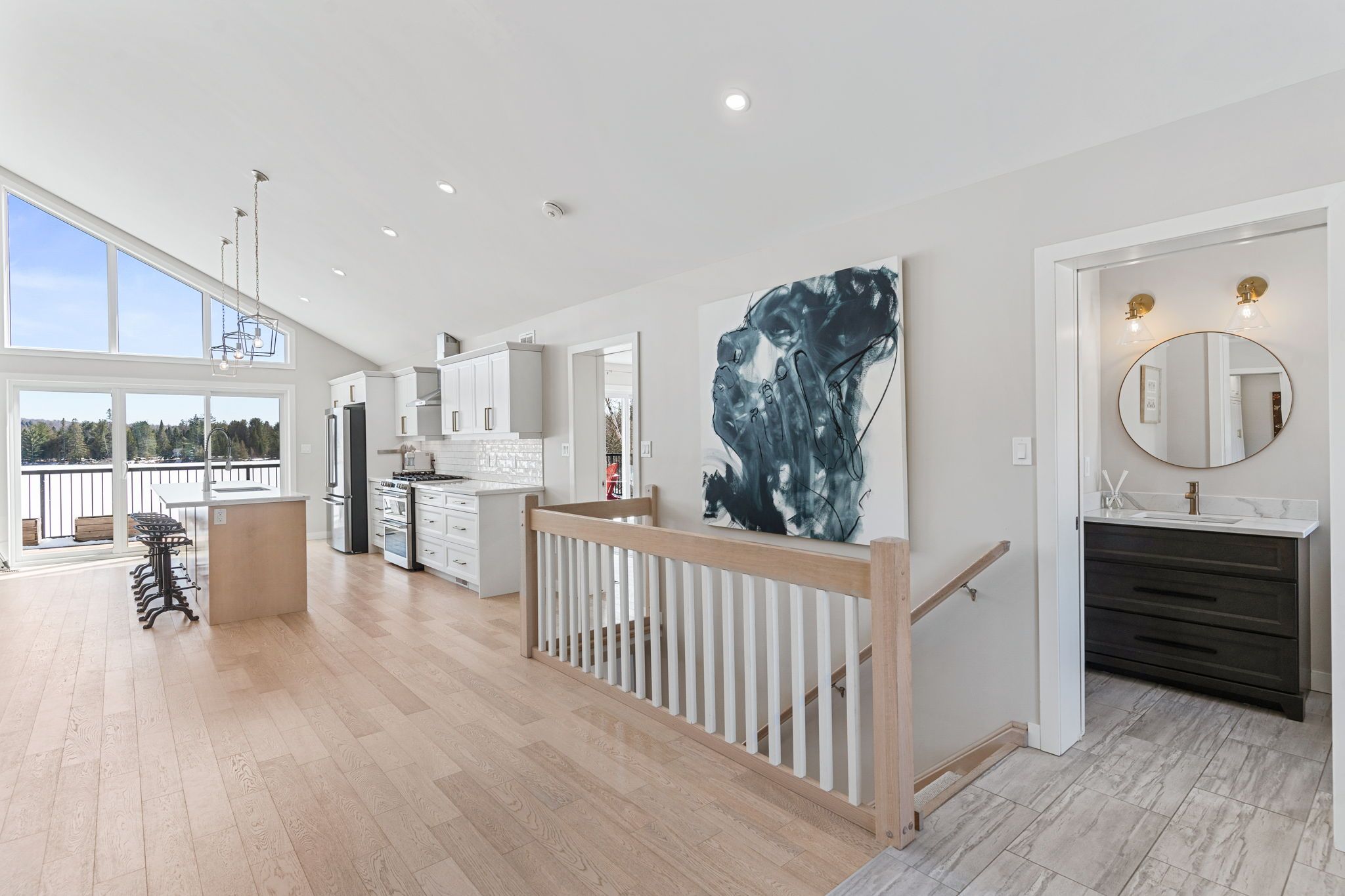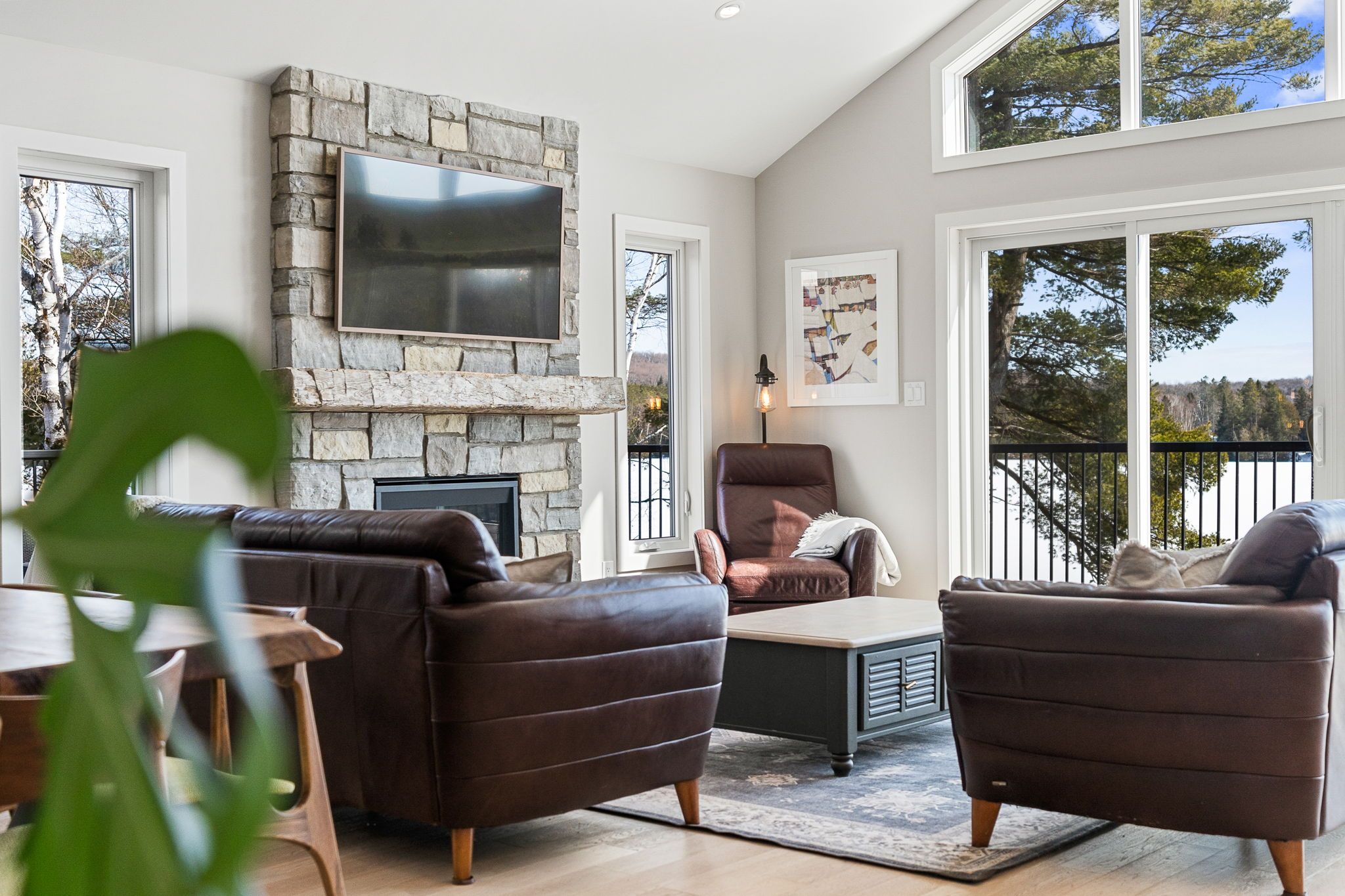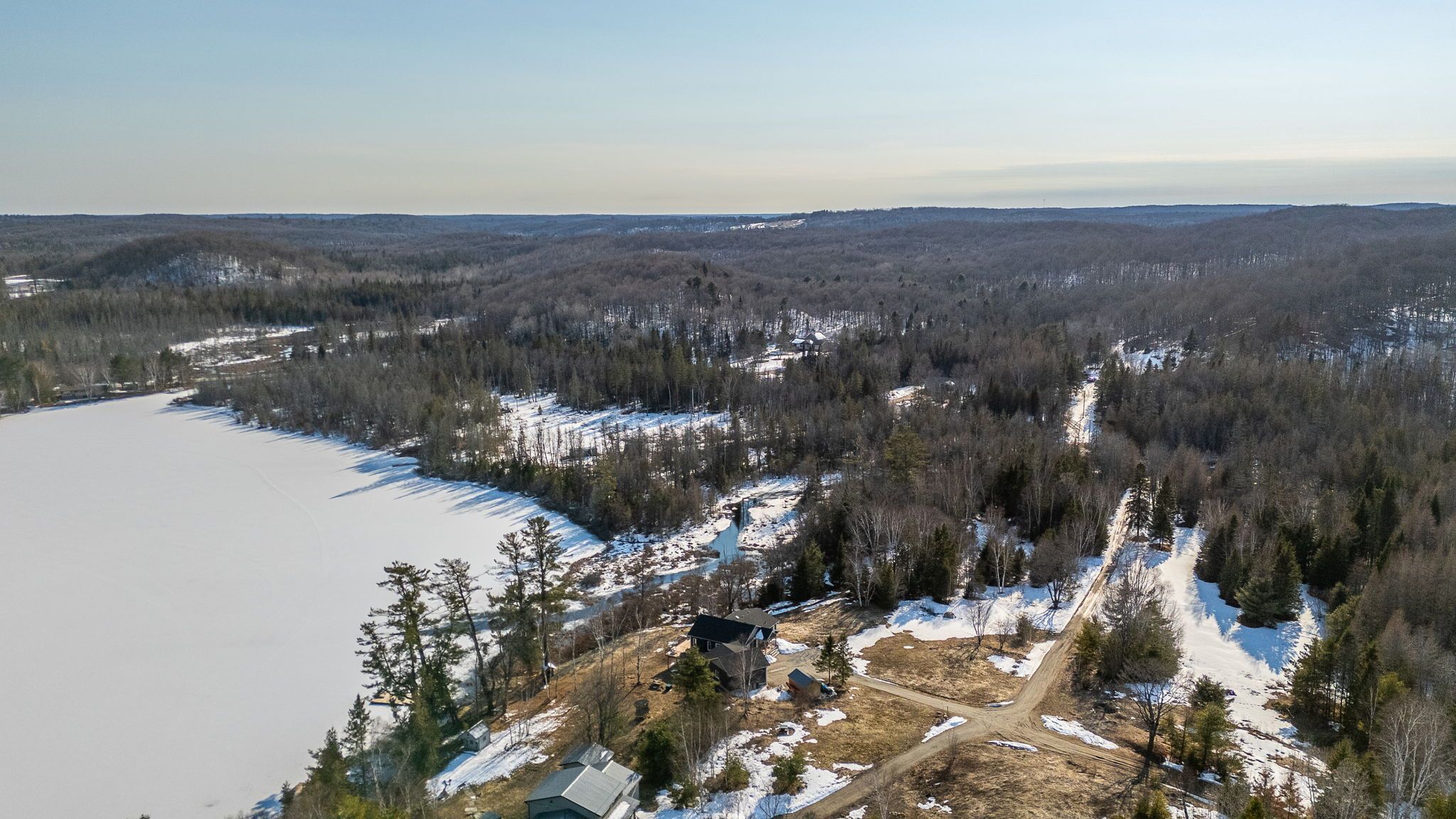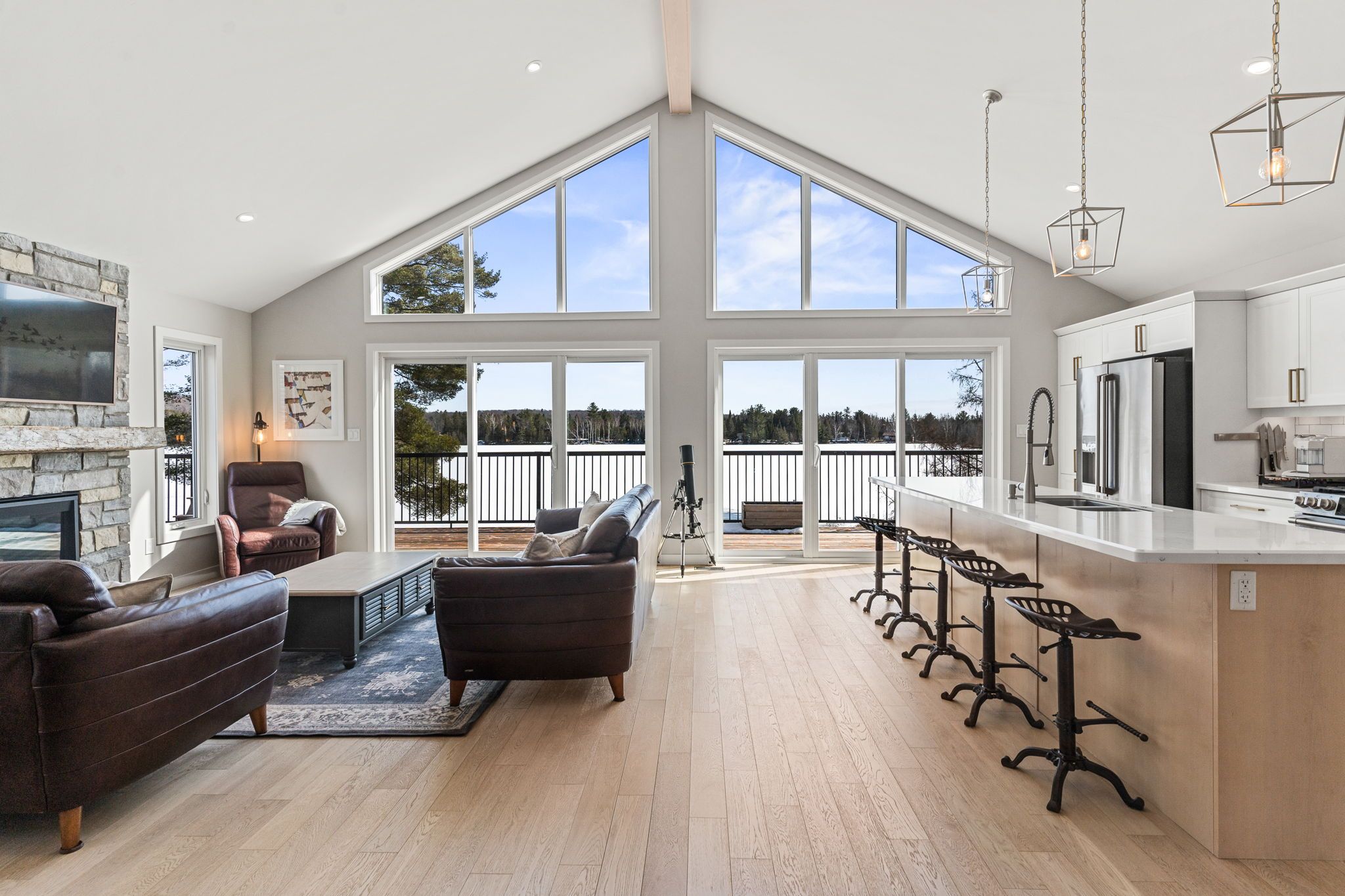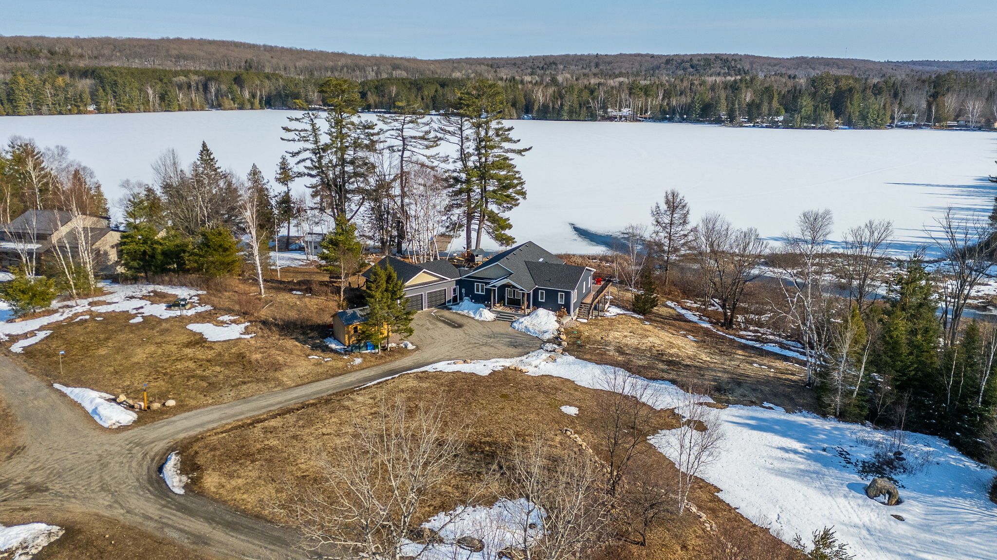 Rarely does an opportunity arise to own a 9-acre waterfront property offering such privacy just 5 minutes from downtown haliburton. This stunning modern home, completed in 2021, perfectly balances contemporary elegance with the raw beauty of the highlands. From the moment you enter, you are greeted by a breathtaking million-dollar view over haas lake, framed by soaring cathedral ceilings and a massive a-frame window that floods the open-concept space with light. The main floor blends refined style with effortless functionality, featuring white-washed oak floors, custom oak beam accents, and a gourmet chef's kitchen equipped with quartz countertops, a sprawling island, and premium stainless appliances. The primary bedroom and ensuite serves as a private retreat, offering a walk-in closet and a spa-inspired bathroom with a soaking tub positioned to capture serene wooded views. Both the primary bedroom and the great room feature walk-outs to an expansive deck-perfect for morning coffee with the sunrise or evening cocktails over the water. Designed for hosting, the fully-finished lower level adds three generous bedrooms, a contemporary bathroom with heated floors, and a large recreation area with a walk-out leading directly to the lake. The property is a true nature lover's playground with 700+ feet of shoreline and a private dock for swimming, fishing, and boating. An offering of this calibre - balancing modern luxury with such vast acreage - is seldom seen. The land and adjacent creek are teeming with wildlife, providing a peaceful, 'tucked away' lifestyle without sacrificing proximity to shops and restaurants. Whether exploring your private woods or relaxing by the lake, this exceptionally rare property stands as the ultimate expression of modern lakefront luxury.