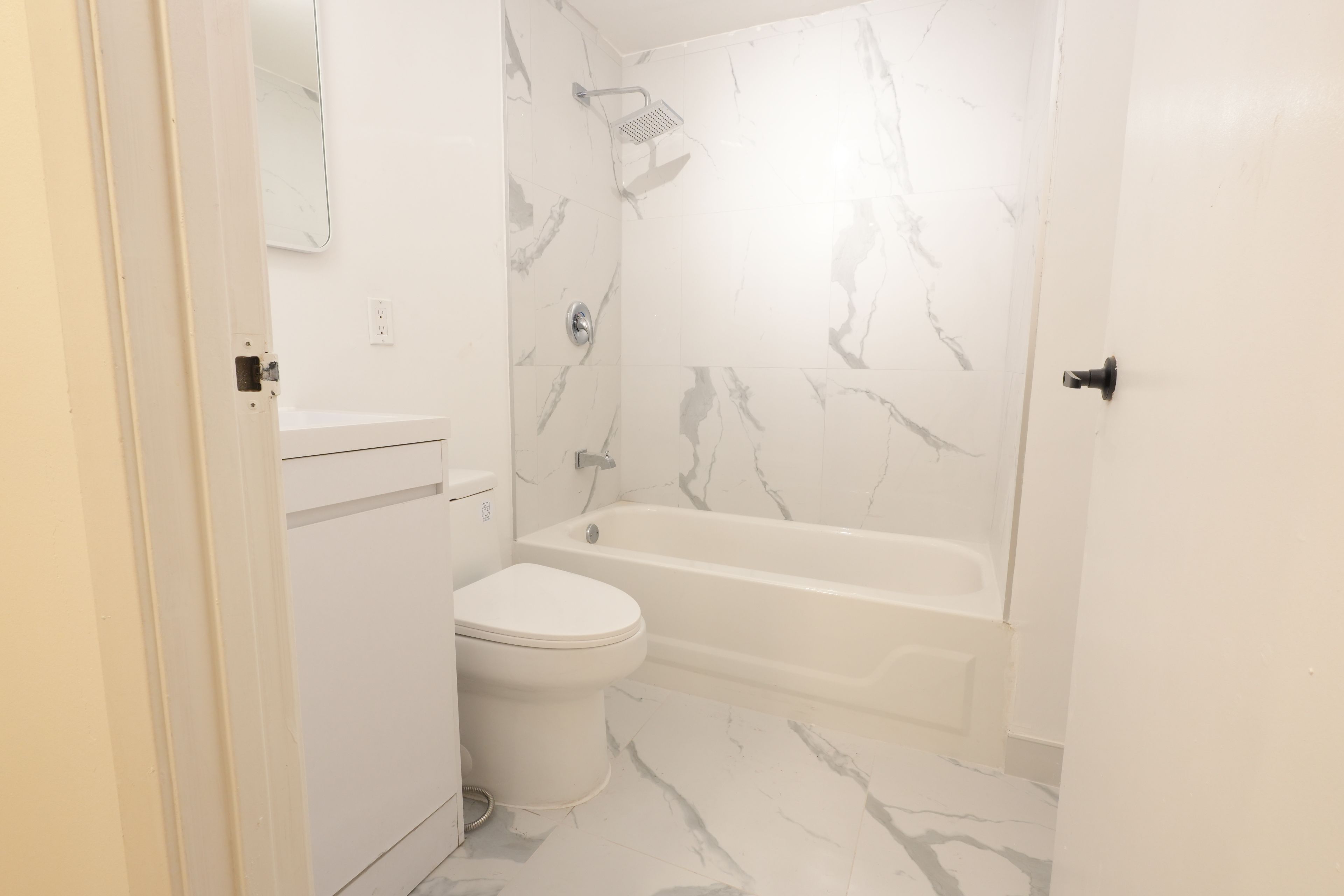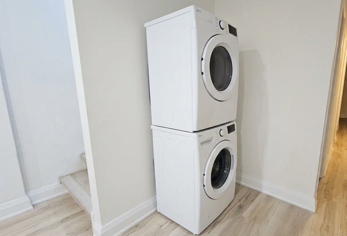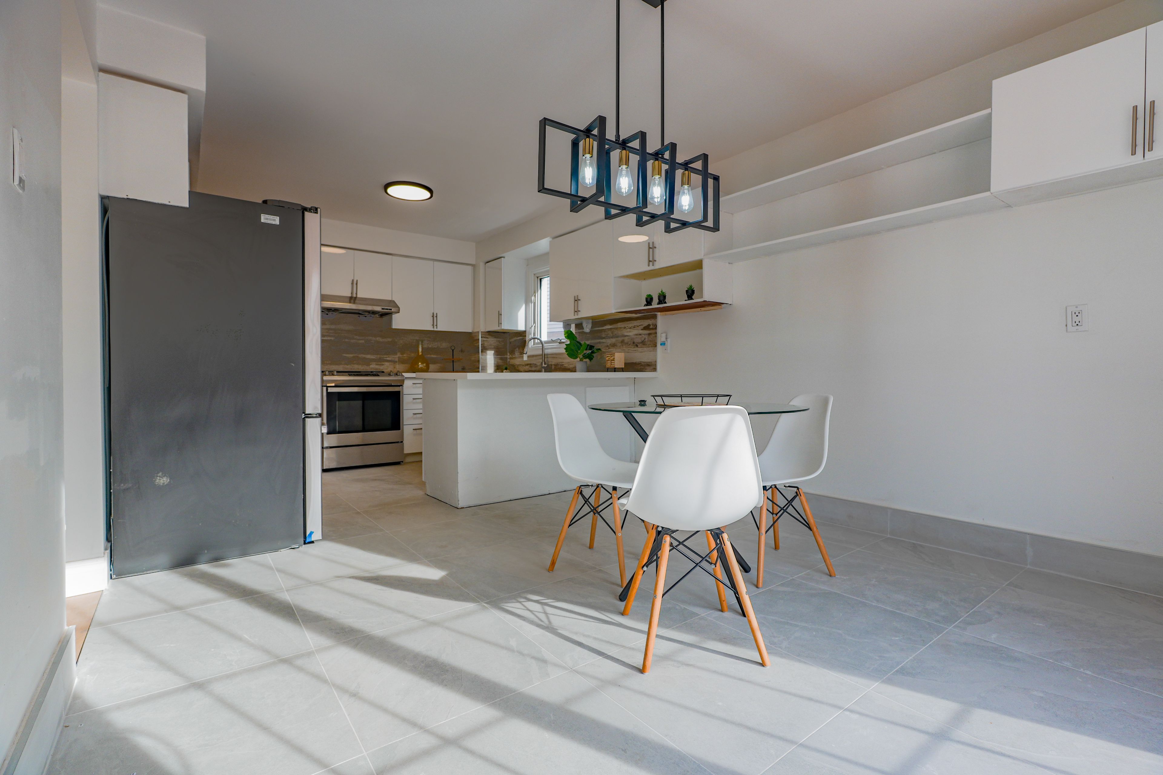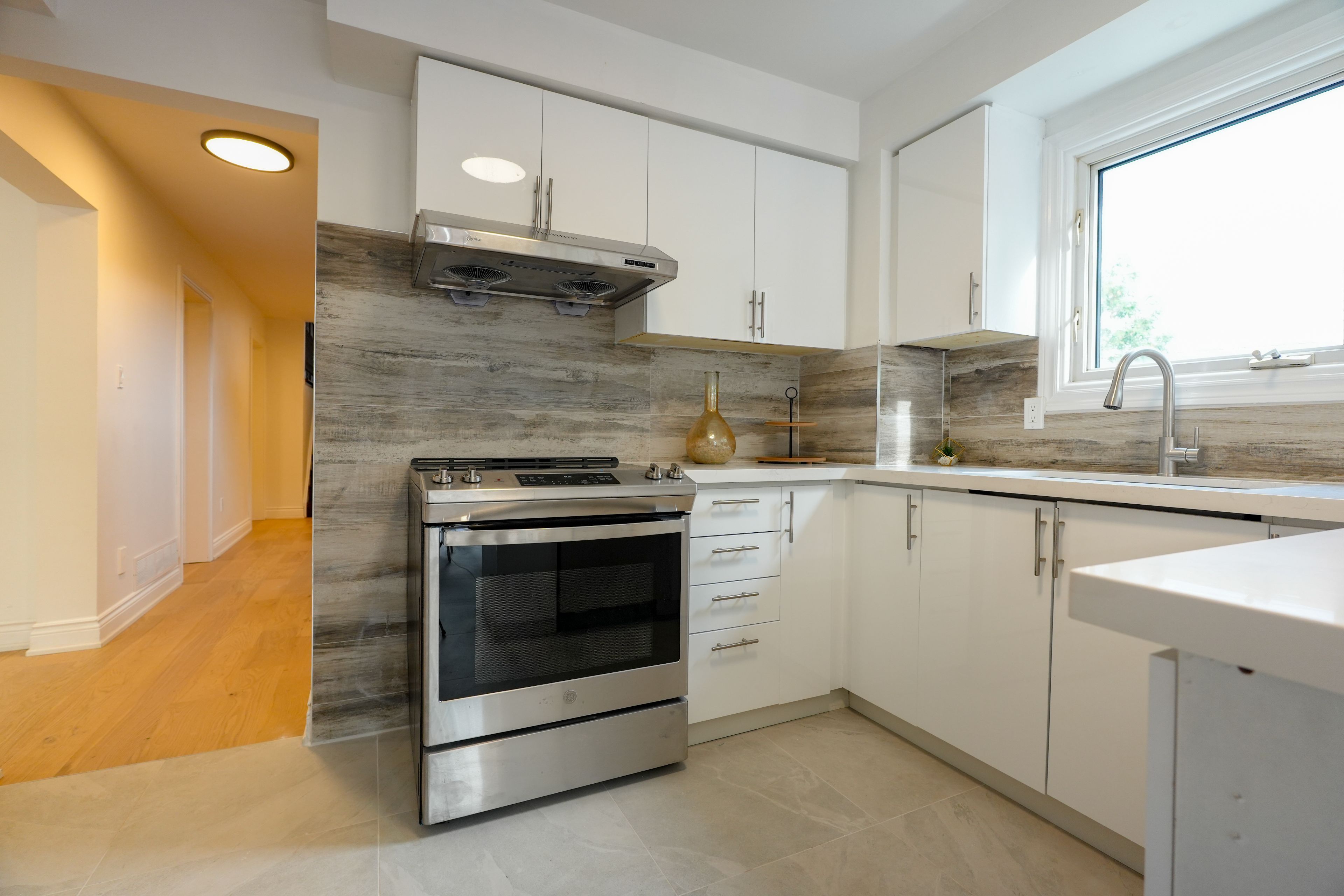 • Bright eat-in kitchen with quartz counters and new stainless steel appliances.