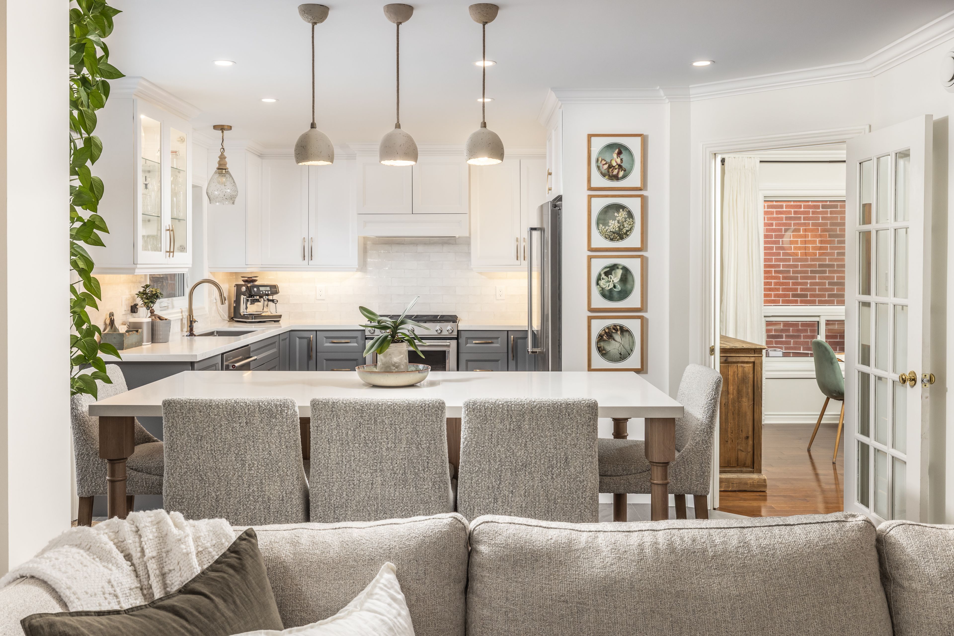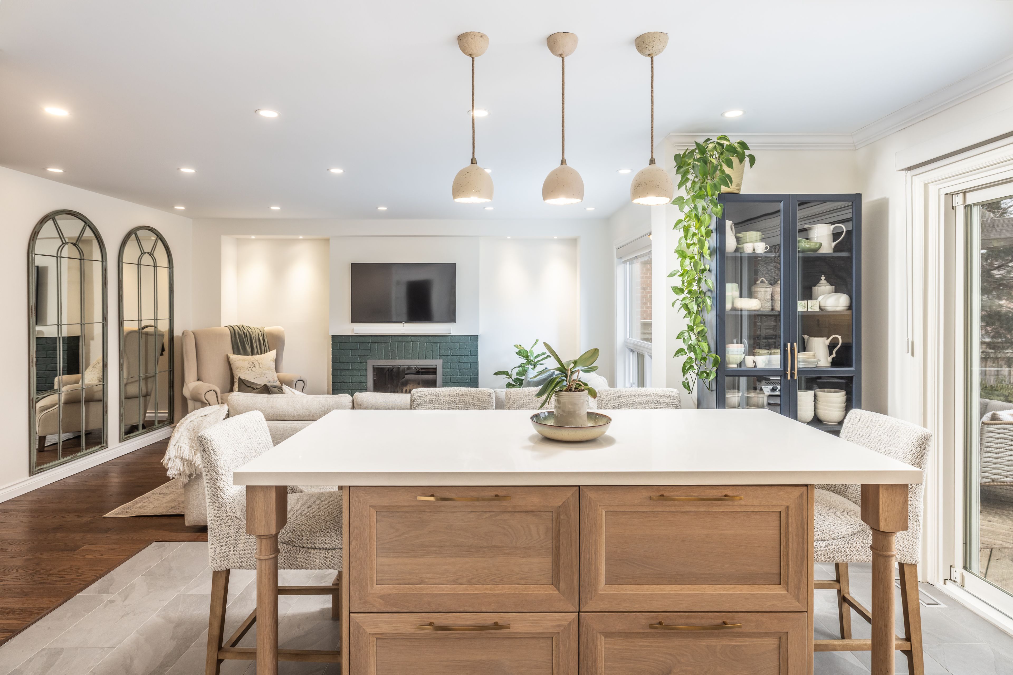 • Elegant open-concept kitchen flows into a cozy family room with fireplace.