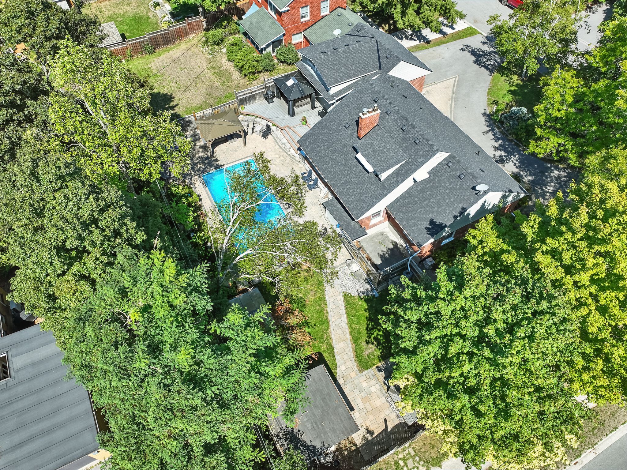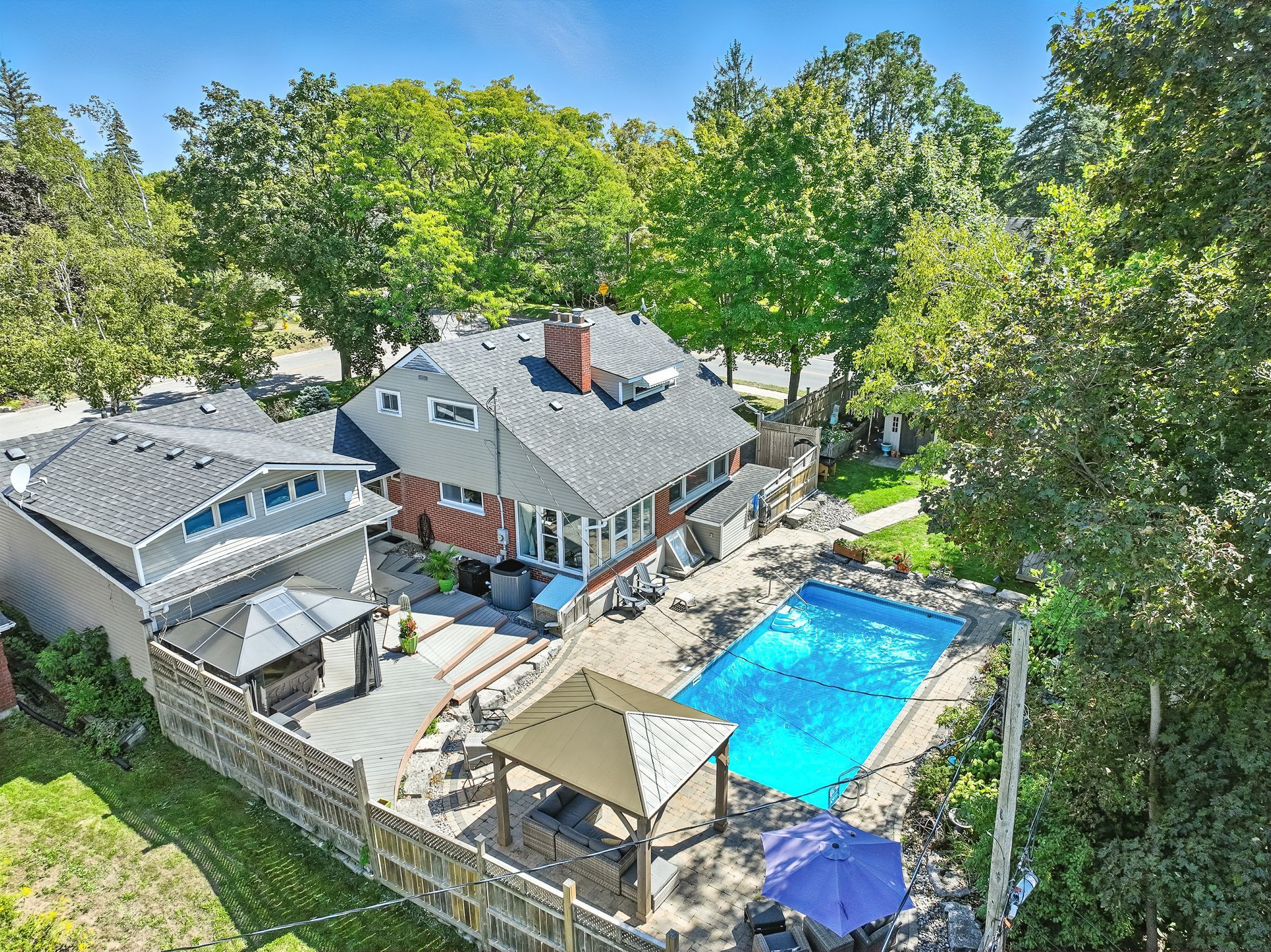 Welcome to 433 manorhill avenue. This expansive, solid-brick home is set on a double-wide corner lot with mature trees, offering a serene, country-like feel in peterborough's highly desirable old west end. The main floor welcomes you with comfort and elegance, featuring two bedrooms, a full bathroom, a formal living and dining room, an updated kitchen and a lovely sunroom. With engineered hardwood floors throughout, a cozy brick fireplace, and large windows overlooking the pool and gardens, creating a perfect space to relax. Upstairs, you'll find two additional spacious bedrooms and another full bathroom. The lower level offers excellent potential for multigenerational living or guest accommodations, complete with its own separate entrance, a bedroom, kitchenette, bathroom, and a cozy living room with a welcoming brick fireplace. The fully fenced backyard is a private retreat, professionally landscaped with raised garden beds, perennial flower beds, and interlocking stone surrounding the large inground pool. Multiple gazebos, a hot tub, and generous patio space provide the perfect setting for entertaining or unwinding. The oversized attached two-car garage includes a workshop and a loft designed as a mancave-complete with a pool table and lounge space. Ideally located within walking distance to peterborough regional health centre, shopping, schools, and amenities, this home truly offers it all: space, character, privacy and a lifestyle you'll love.