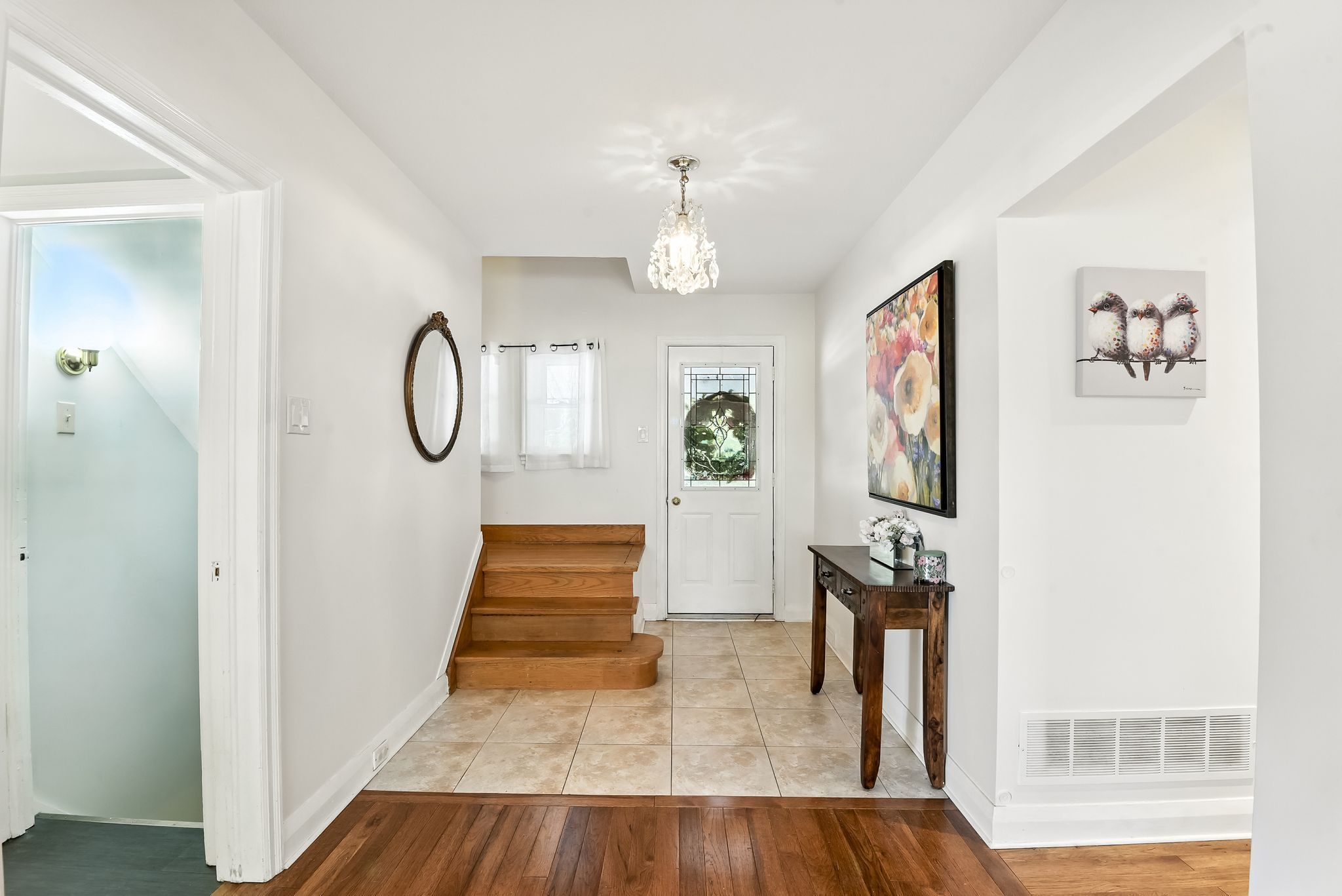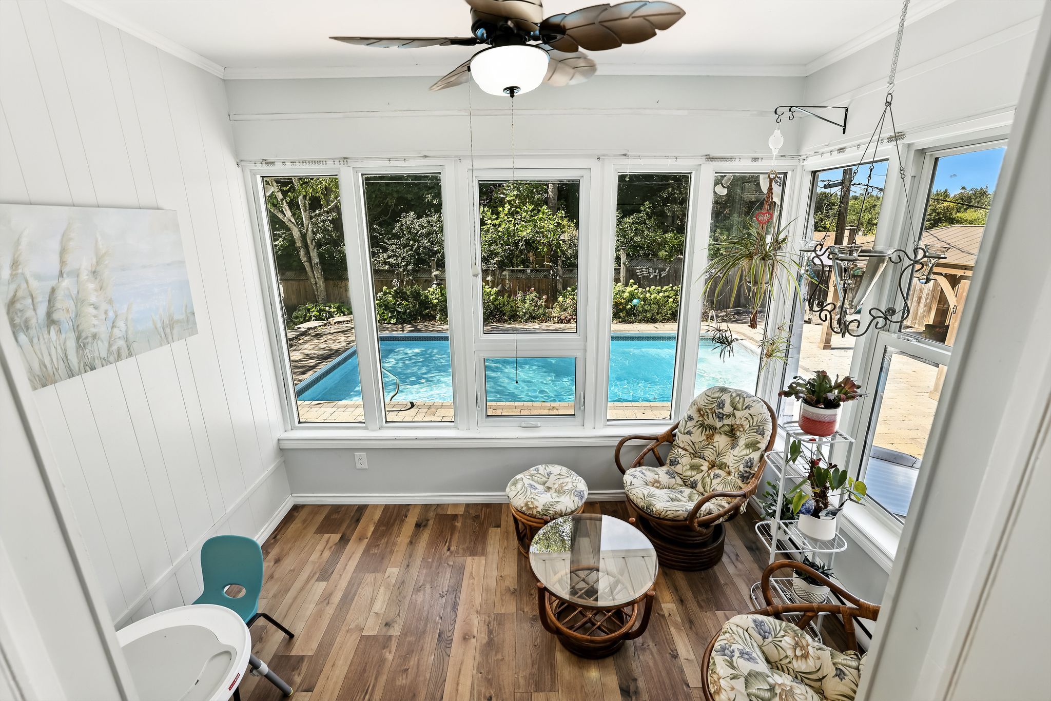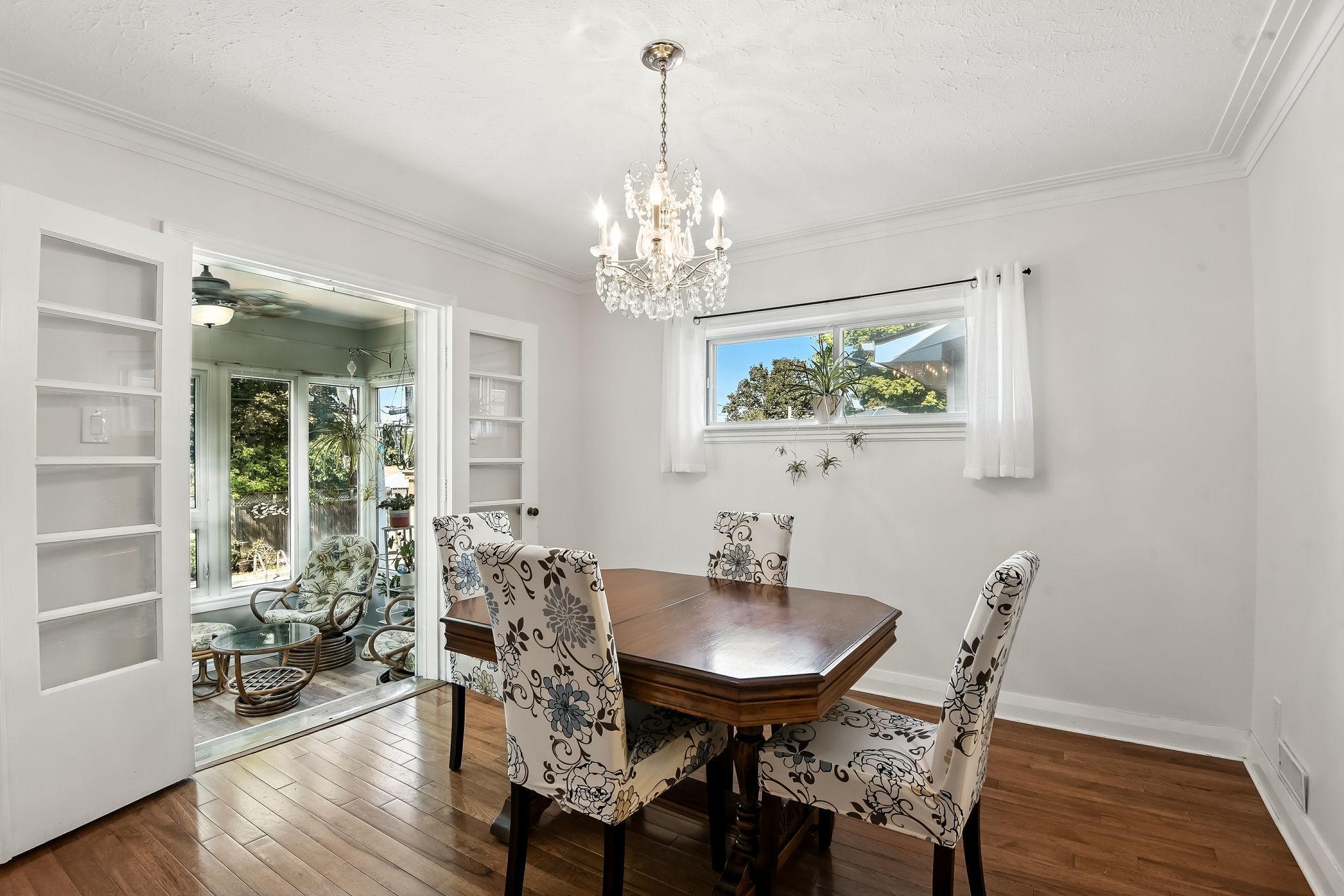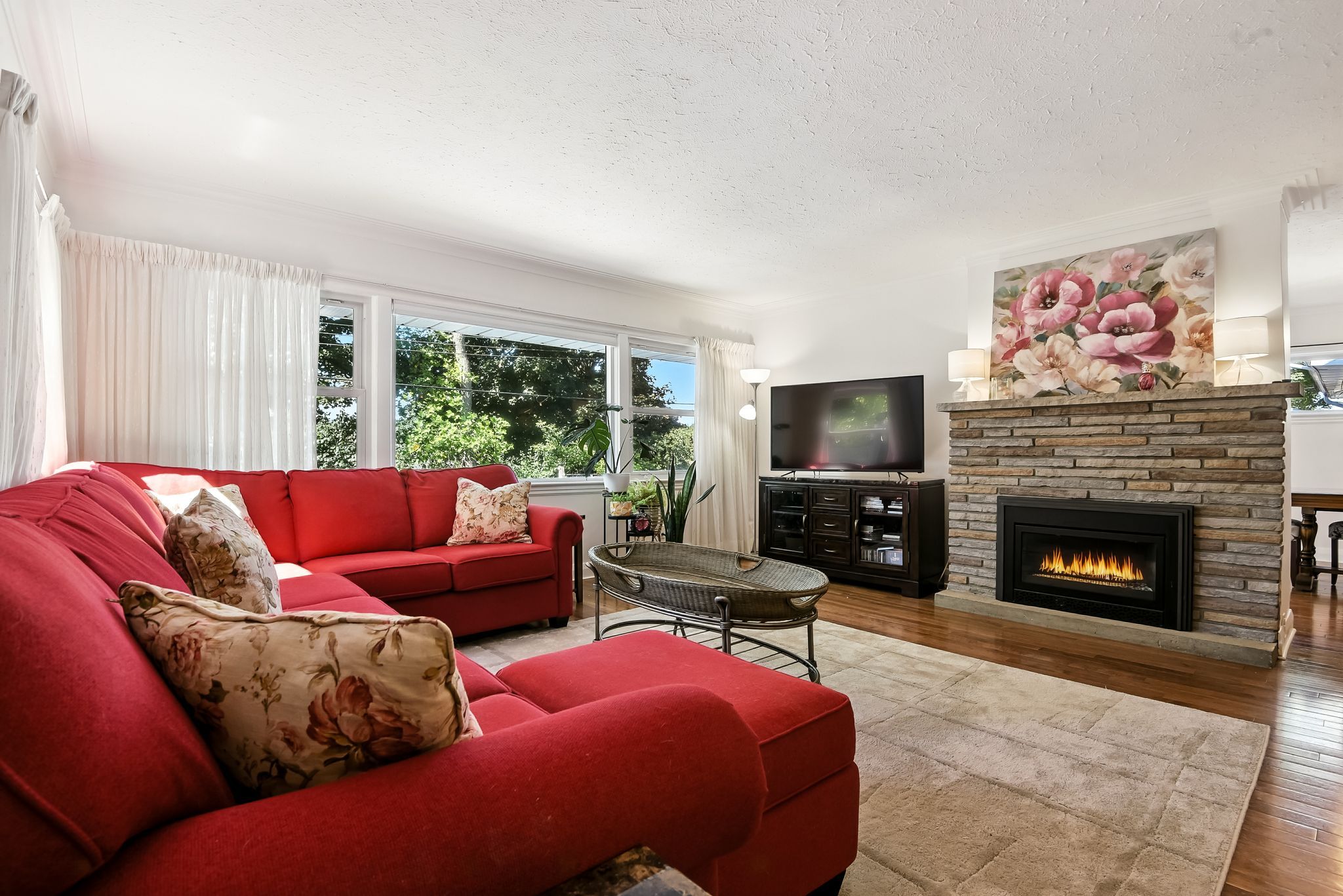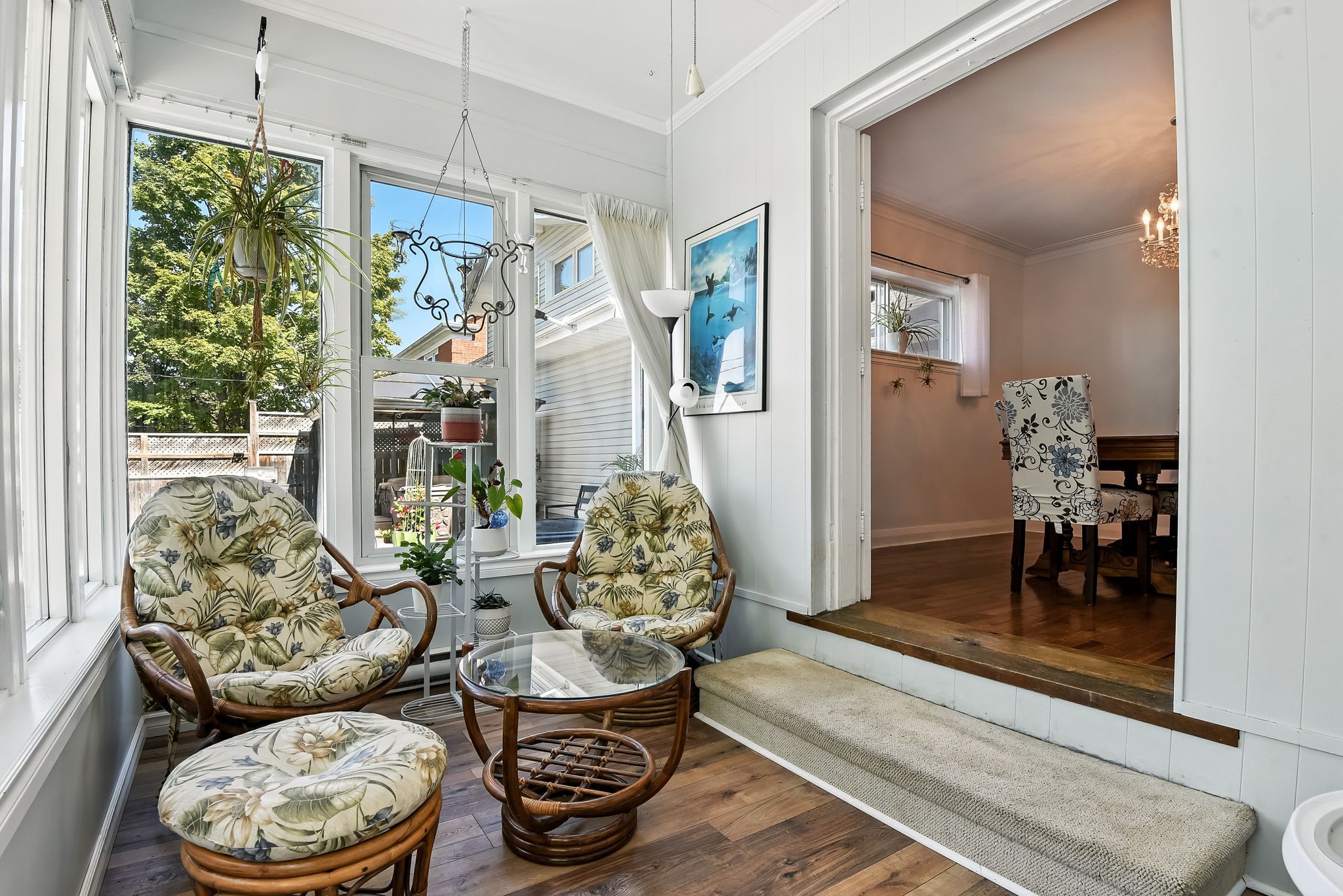 • Comfortable main floor with updated kitchen, sunroom, and cozy brick fireplace.