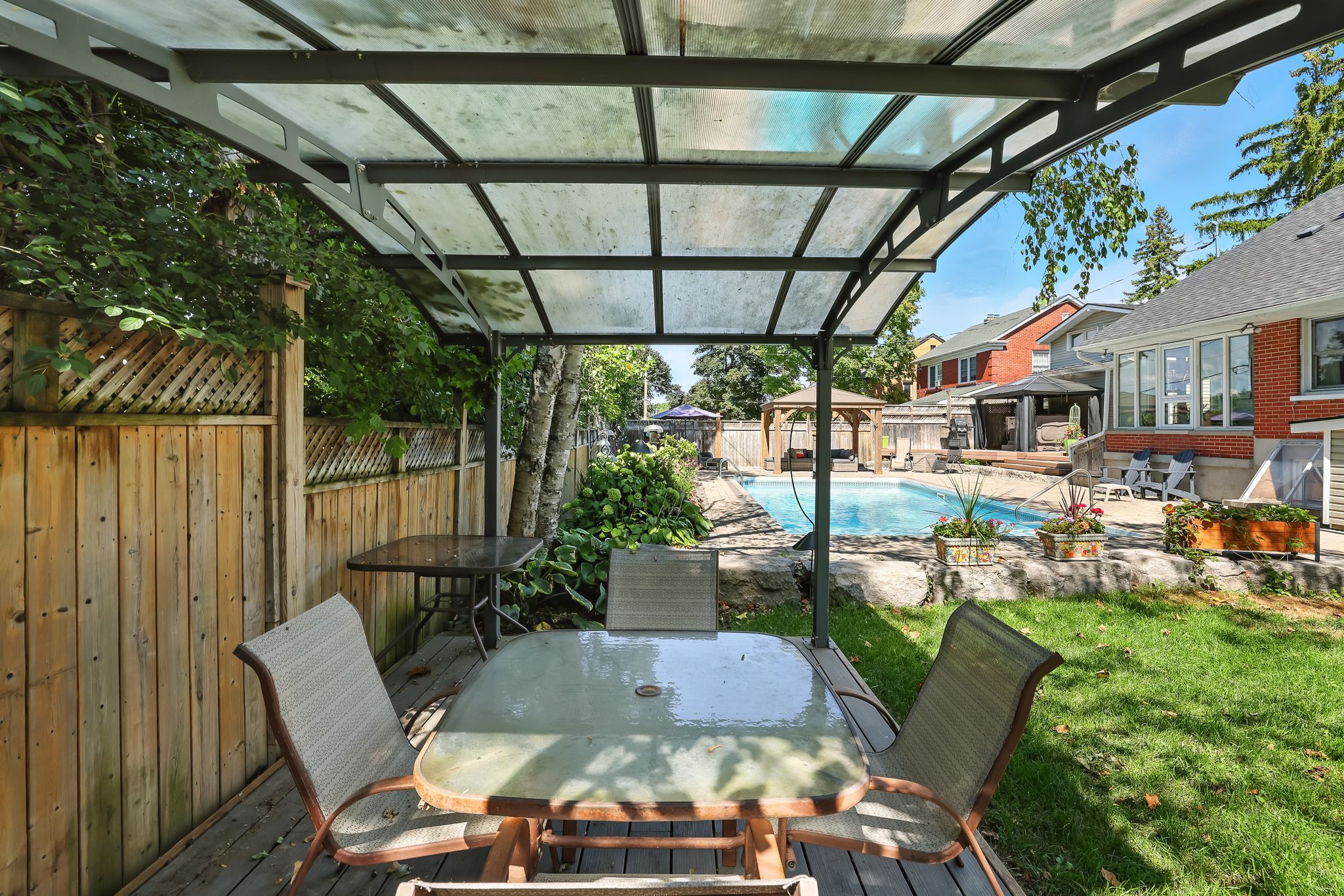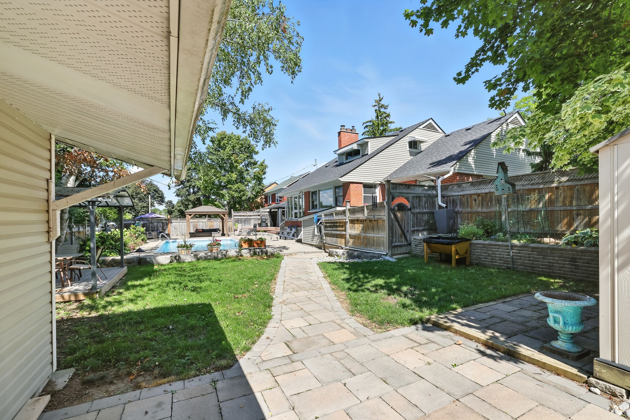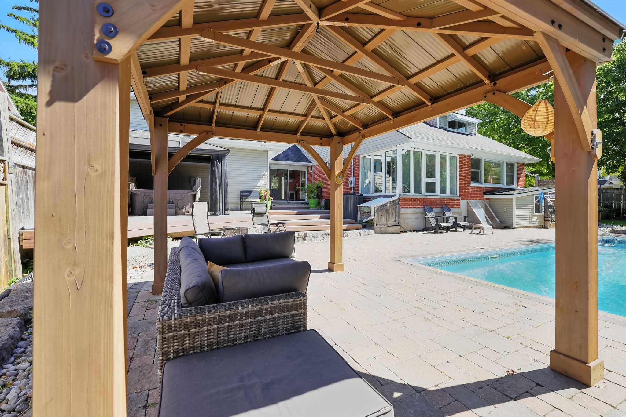 • Professionally landscaped yard with an inground pool, gazebos, and hot tub.