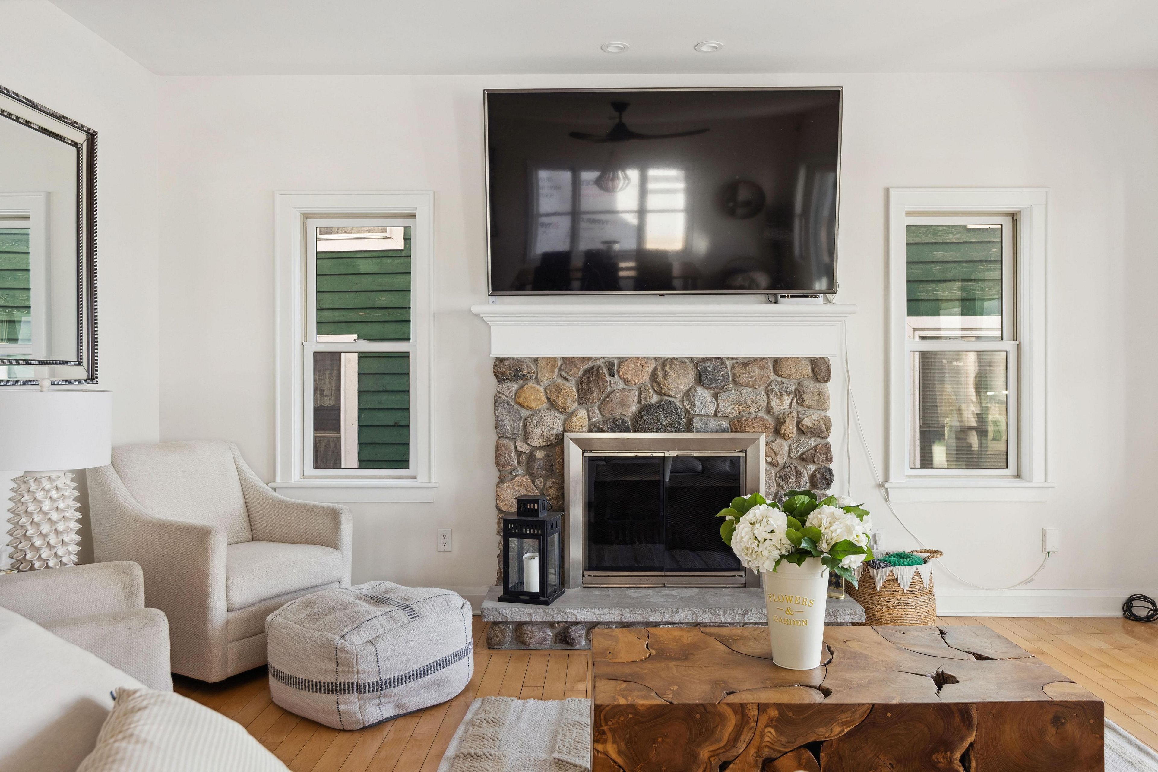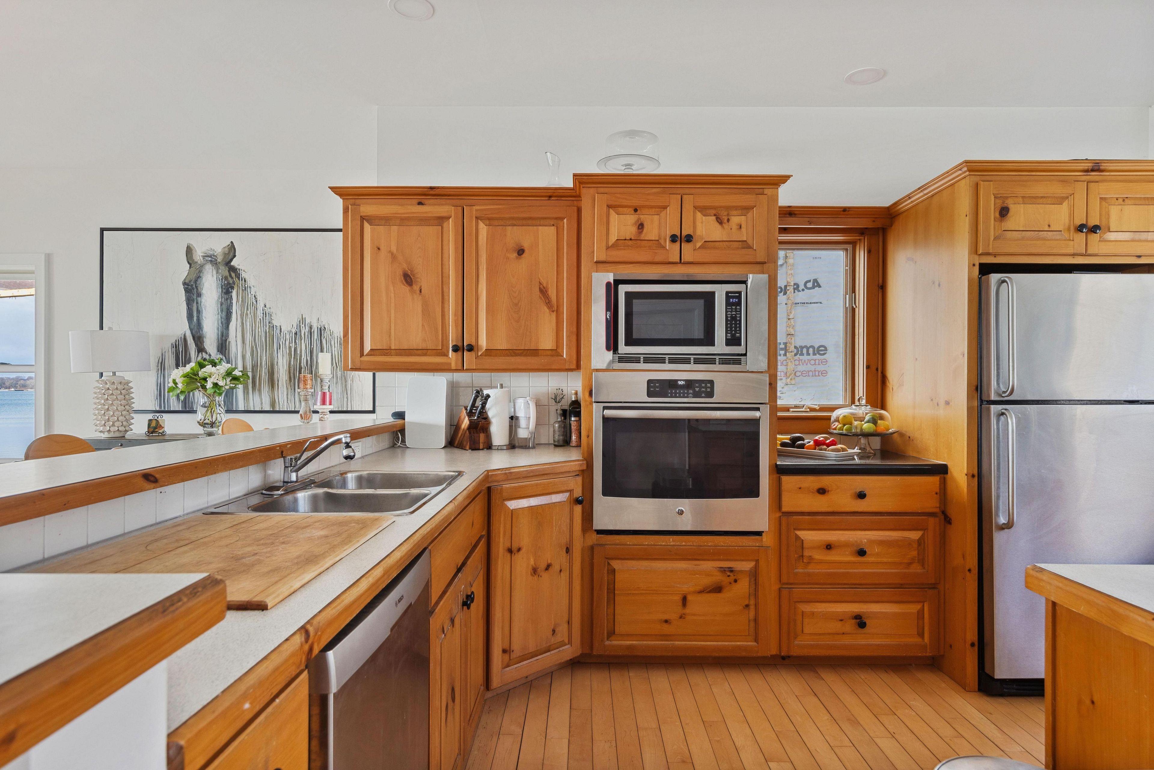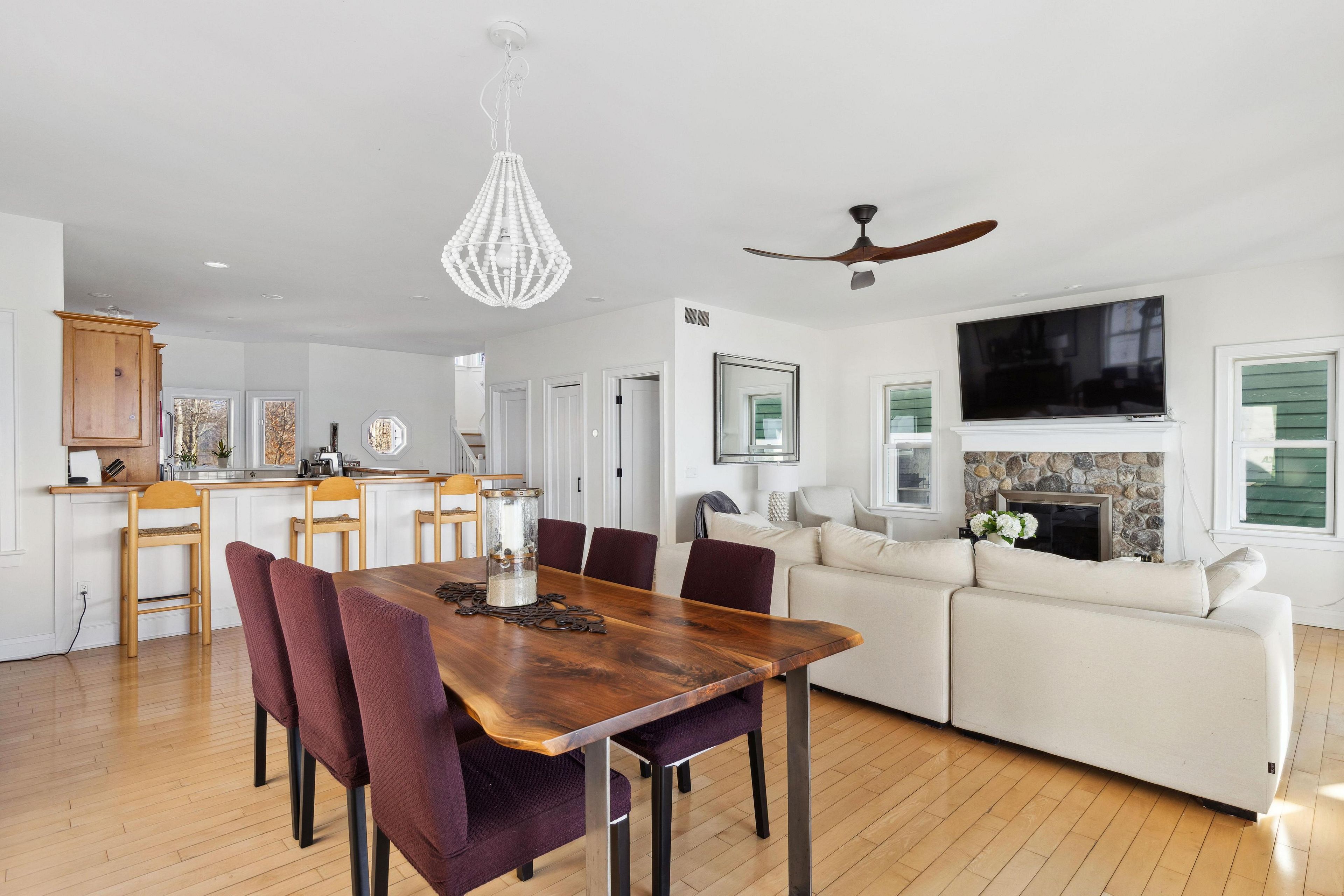 • Cozy interior features a wood-burning hearth and inviting kitchen.