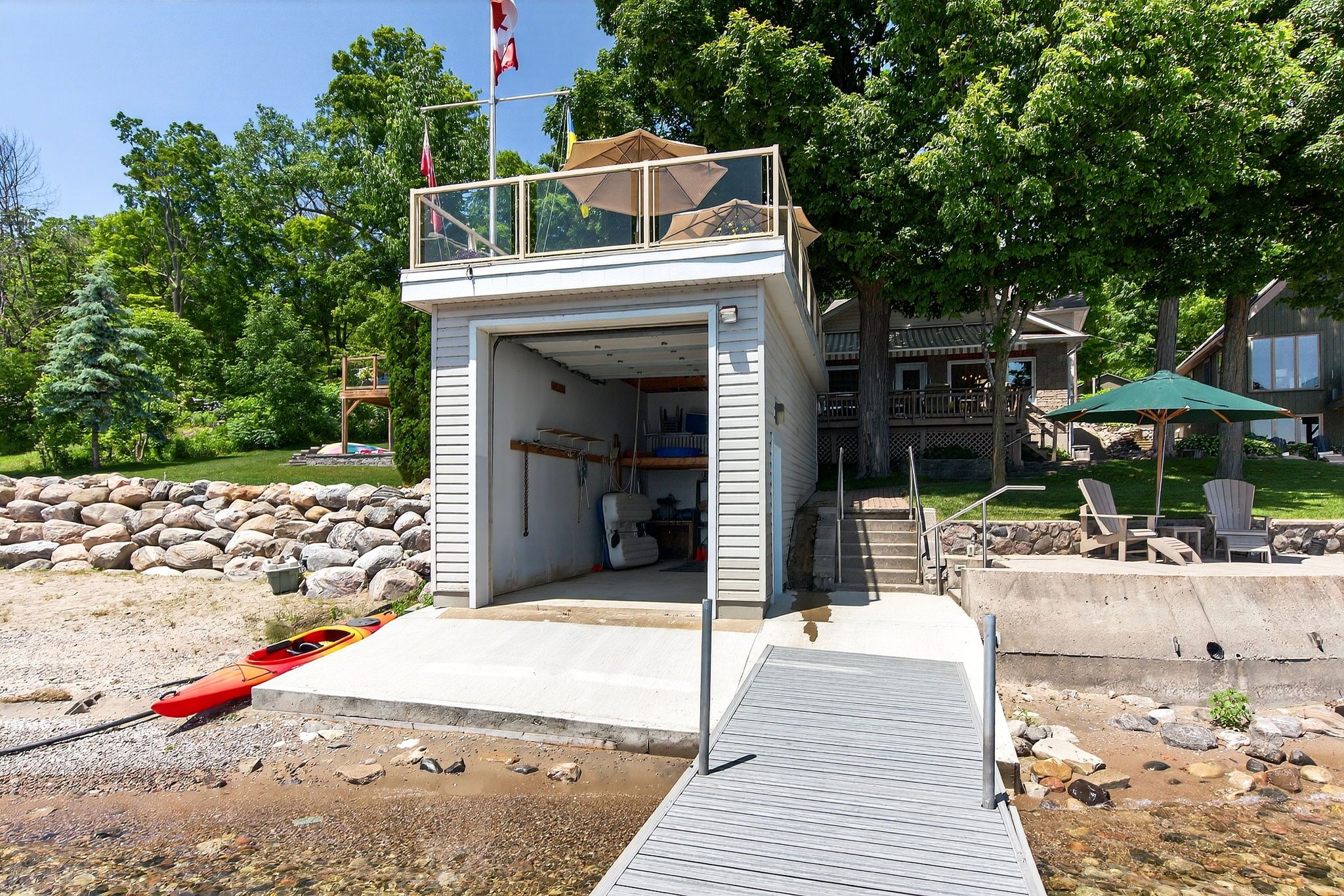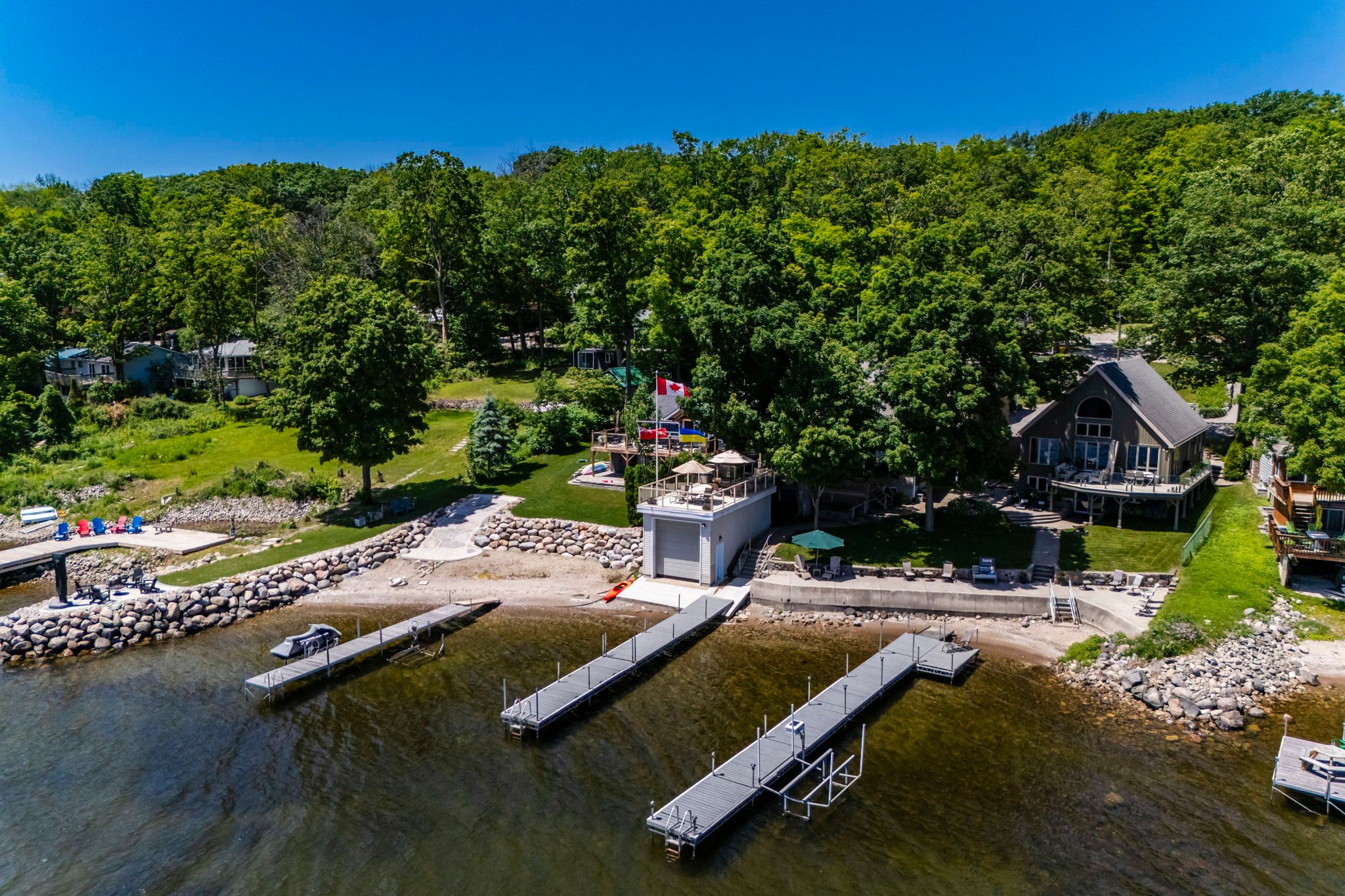 This beautifully maintained waterfront home showcases true pride of ownership. Originally redeveloped, expanded, and customized in 2004, it was thoughtfully designed with large families and entertaining in mind. Spanning three spacious levels - approx 3400 sqft, the home offers 4 bedrooms, 3 bathrooms, 2 full kitchens, 1 dining room, 2 family rooms, wine cellar and multiple entrances, along with a versatile office/guest space with a day bed ideal for hosting extended family or visitors. Enjoy panoramic big-water views from several outdoor living areas, including a rooftop sitting area above the large dry-dock boathouse. The waterfront features 48 feet of south-facing shoreline with a renovated concrete pier, a newer 50-foot post dock system, and generous seating zones some shaded with retractable awnings for effortless outdoor entertaining. Set on a deep 48' x 694' lot, this property also includes a serviced back lot with hydro and water perfect for parking an rv or trailer. Accessibility is a priority with wide hallways, handicap-friendly bathrooms and doors, and a high-capacity stair lift. The attached 1. 5 garage plus carport, and garden shed offer ample storage and convenience. Modern utilities include natural gas, high-speed internet, a partial backup 20 kw generator. Situated on prestigious midland point road, you're just 8 minutes from downtown midland and close to shopping, dining, and local attractions.