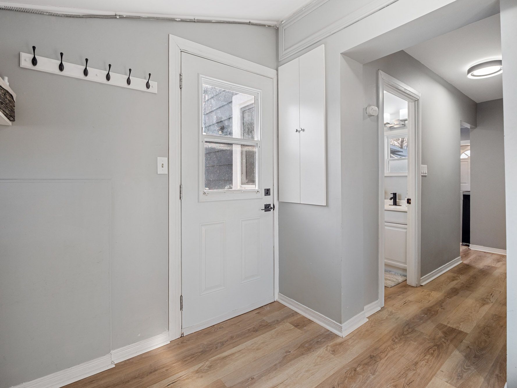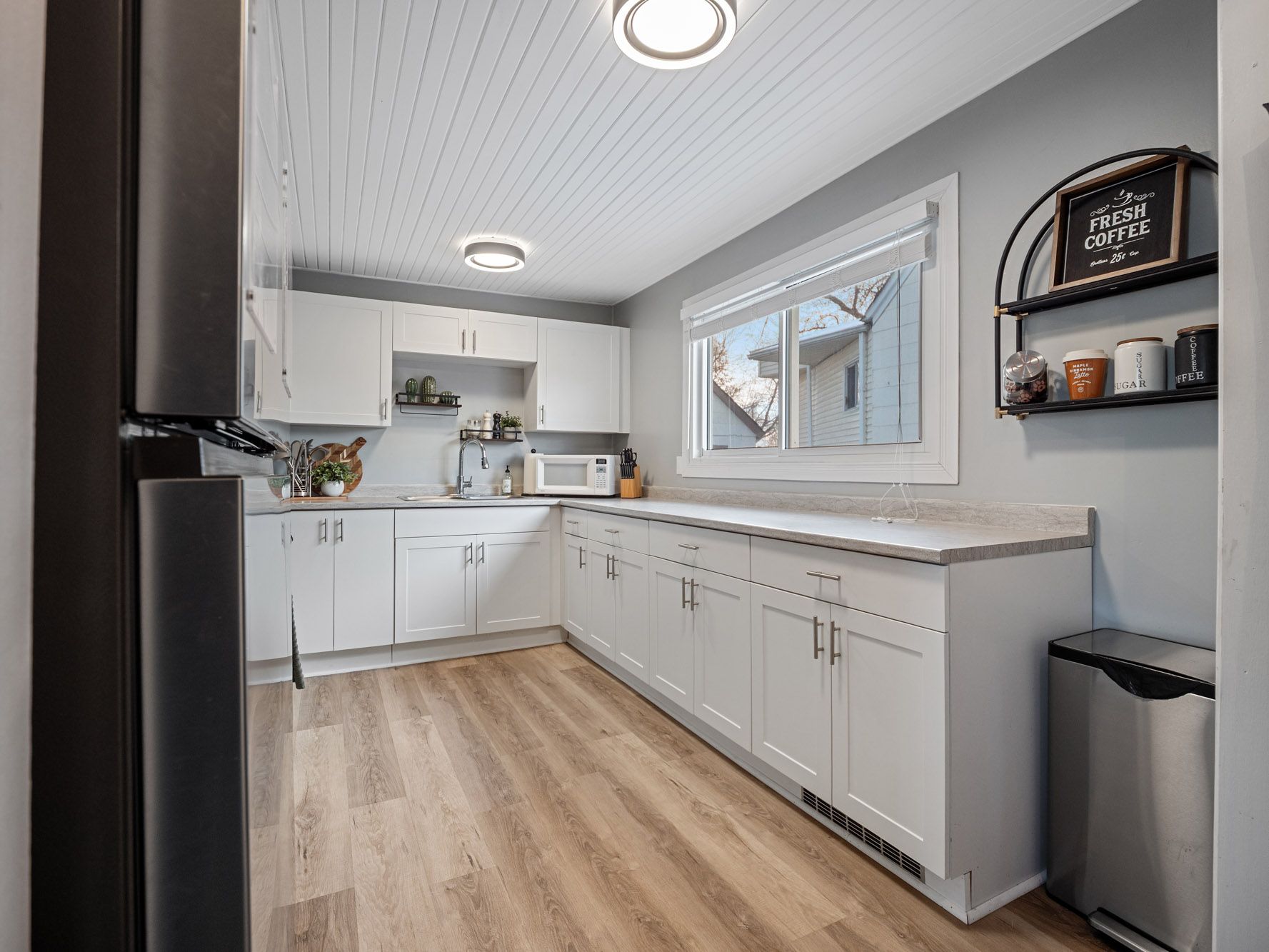 • Bright kitchen with stylish white cabinetry and stainless steel appliances.