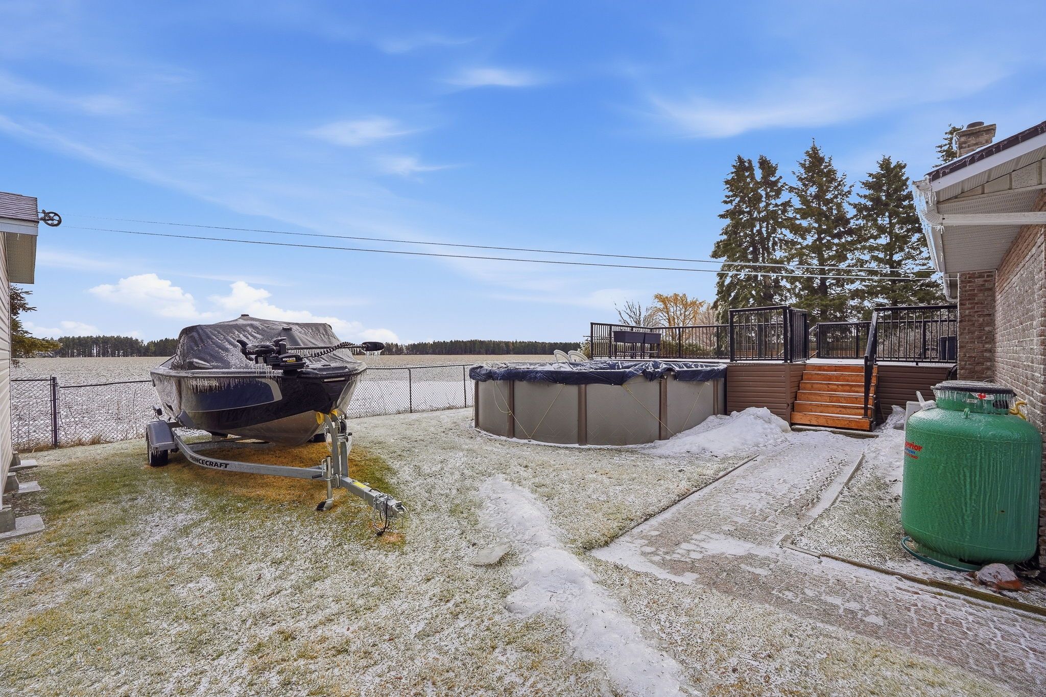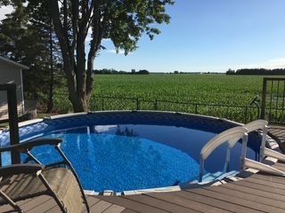 • Private backyard includes a large deck and on-ground pool with open field views.
