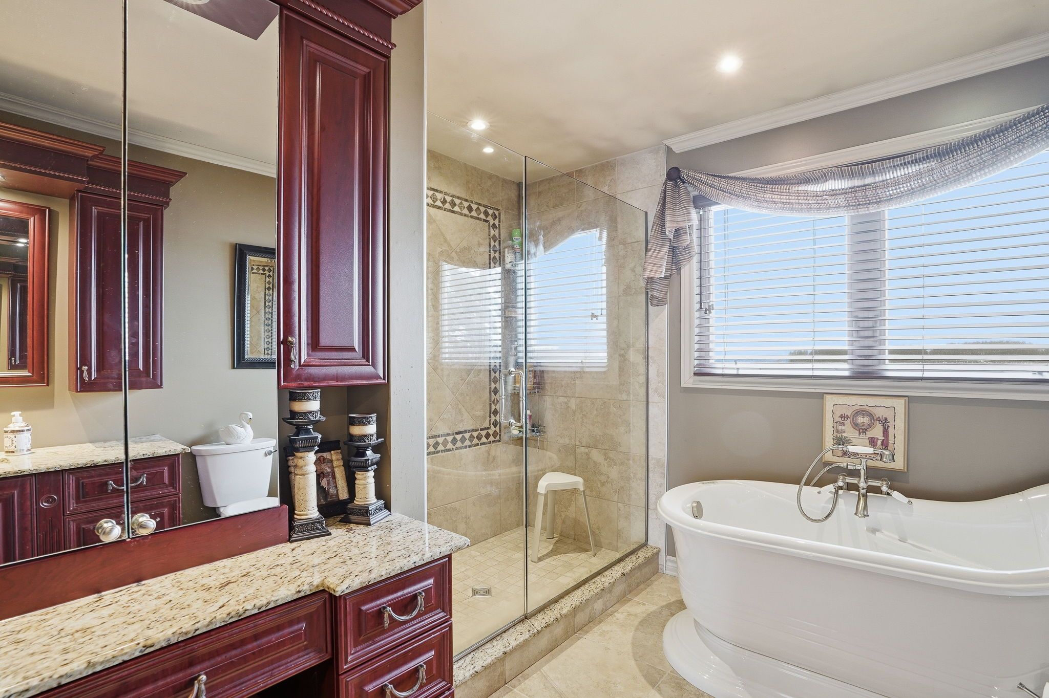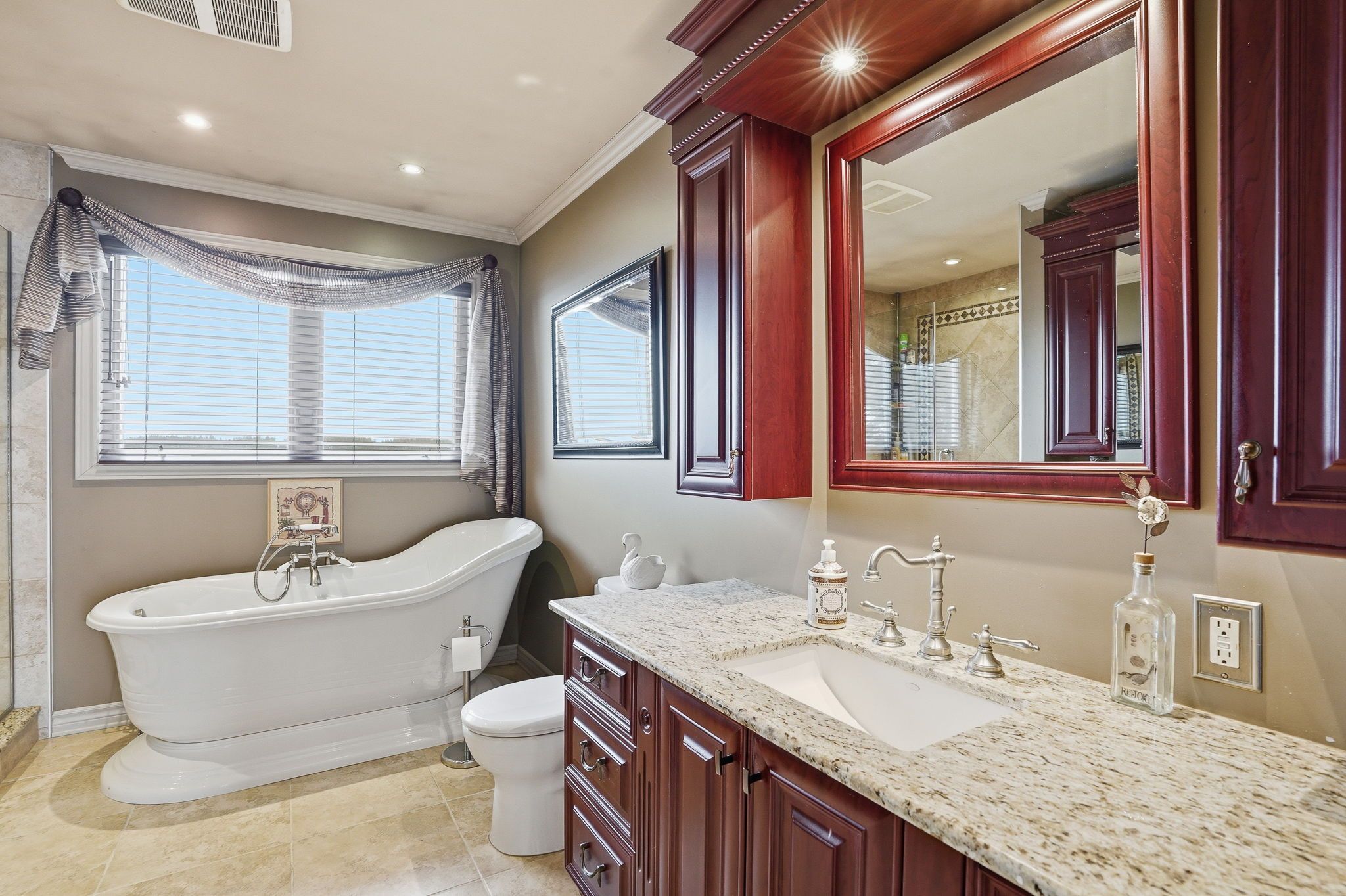 • Updated bathroom features a soaking tub, shower, and plenty of storage.