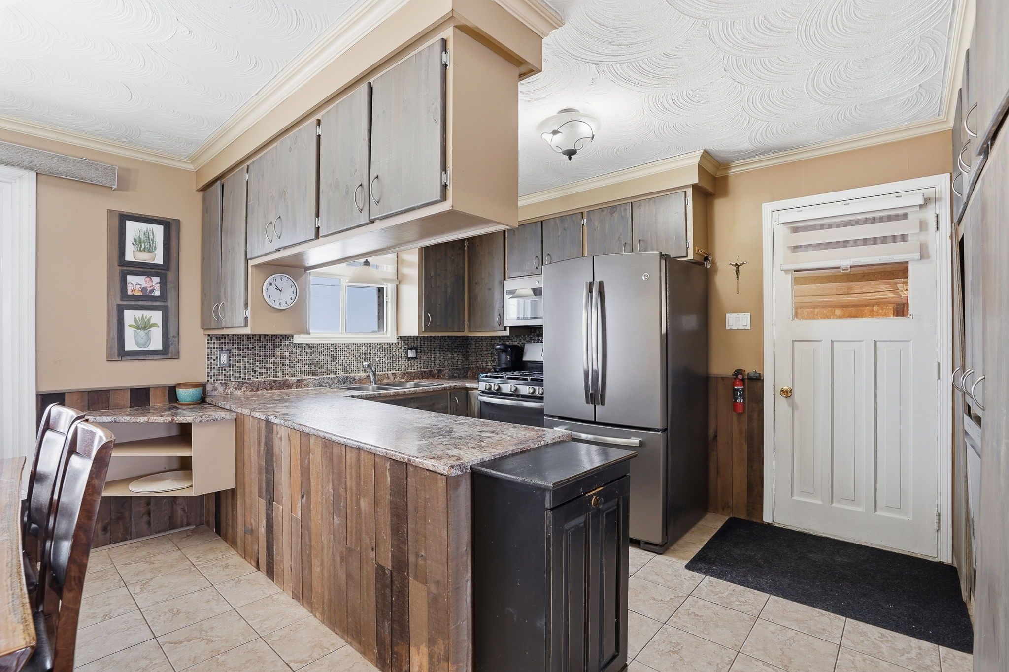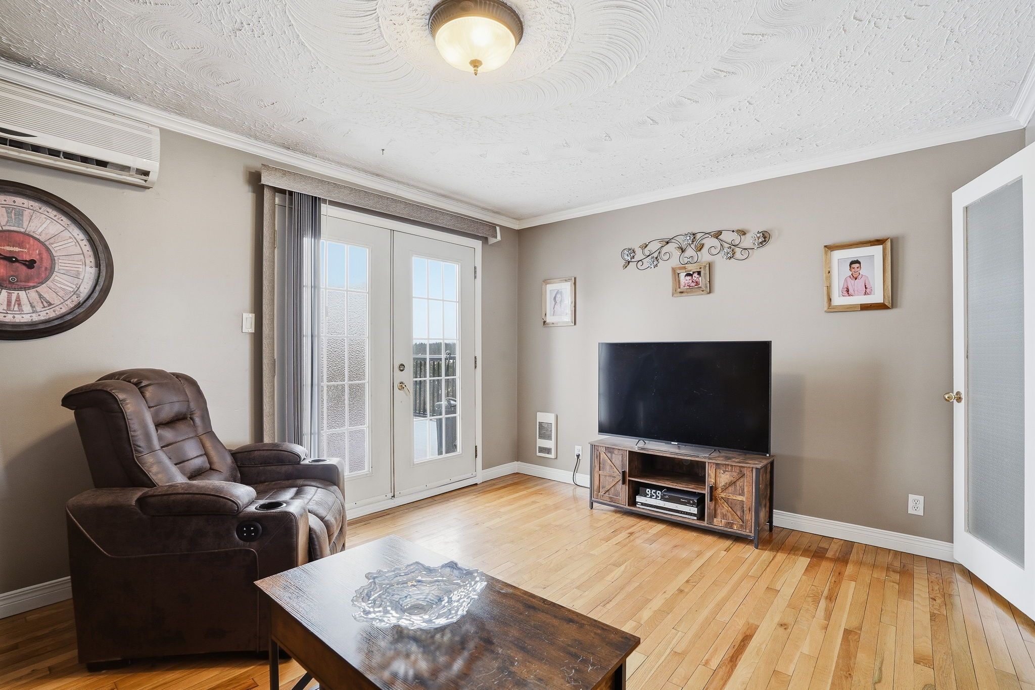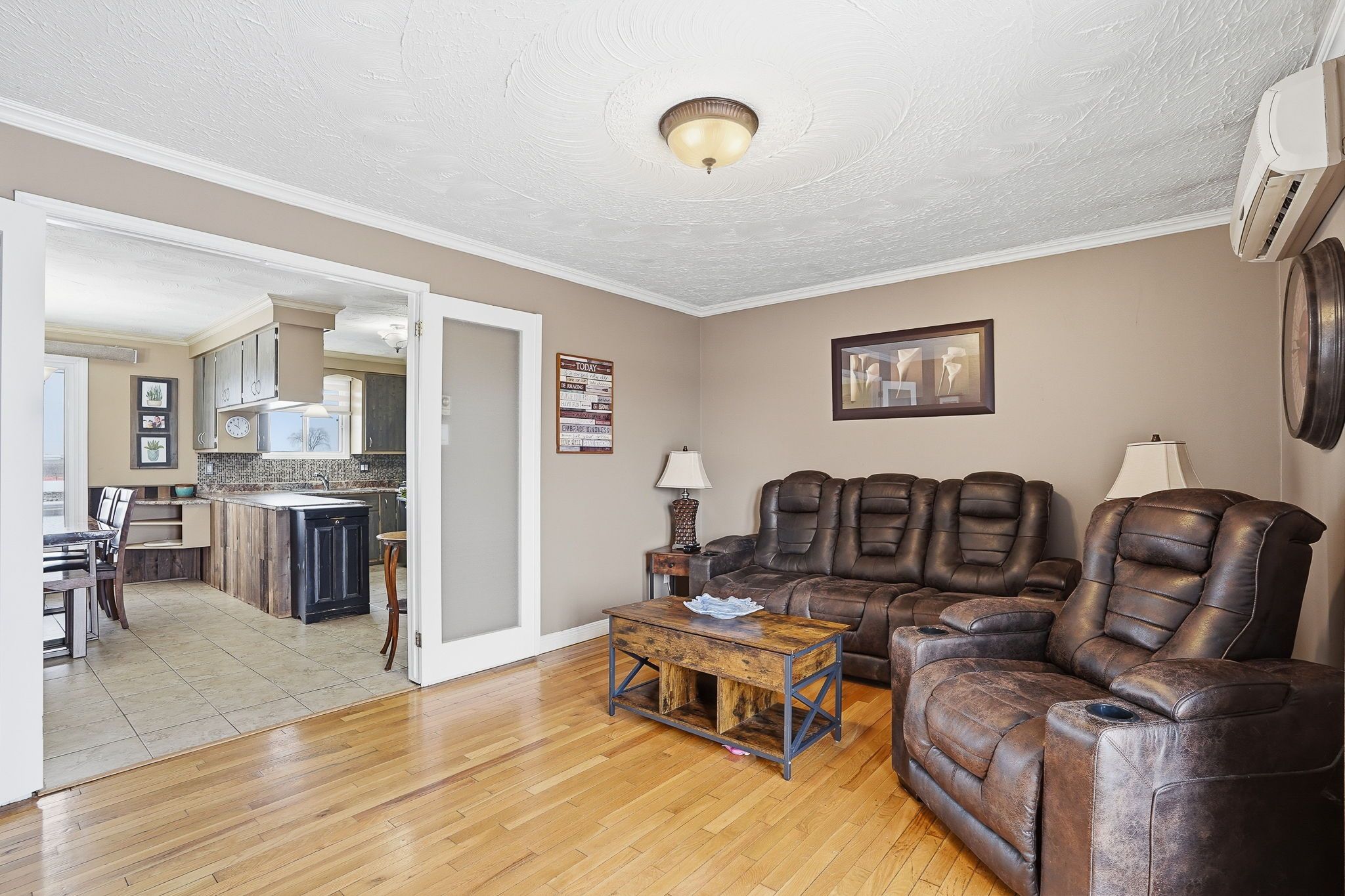 • Elegant French doors connect the kitchen, eating area, and living room.