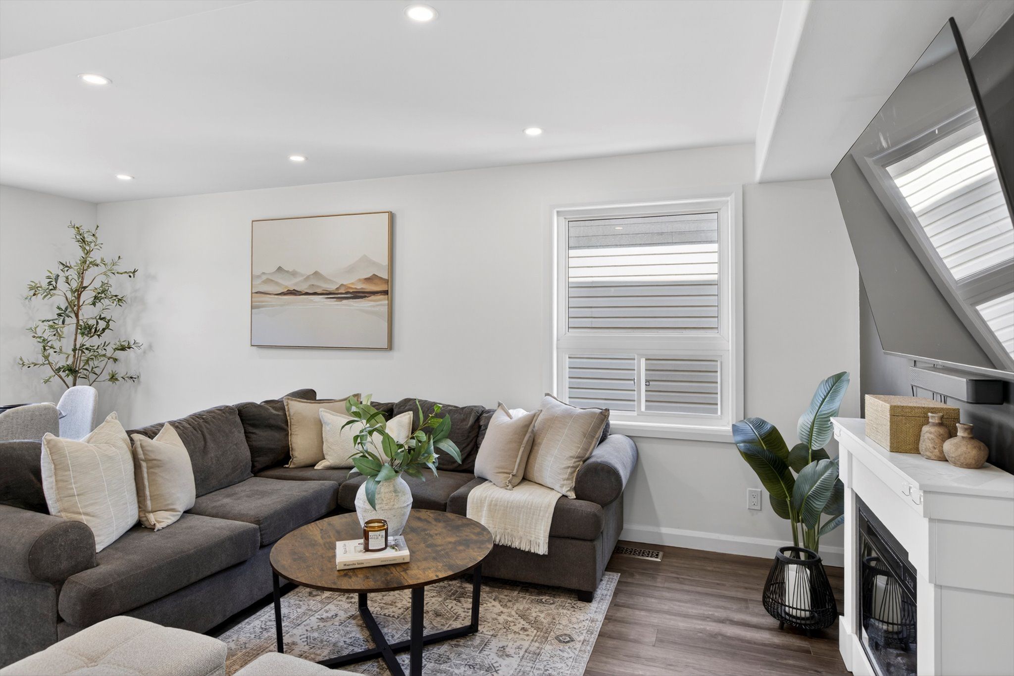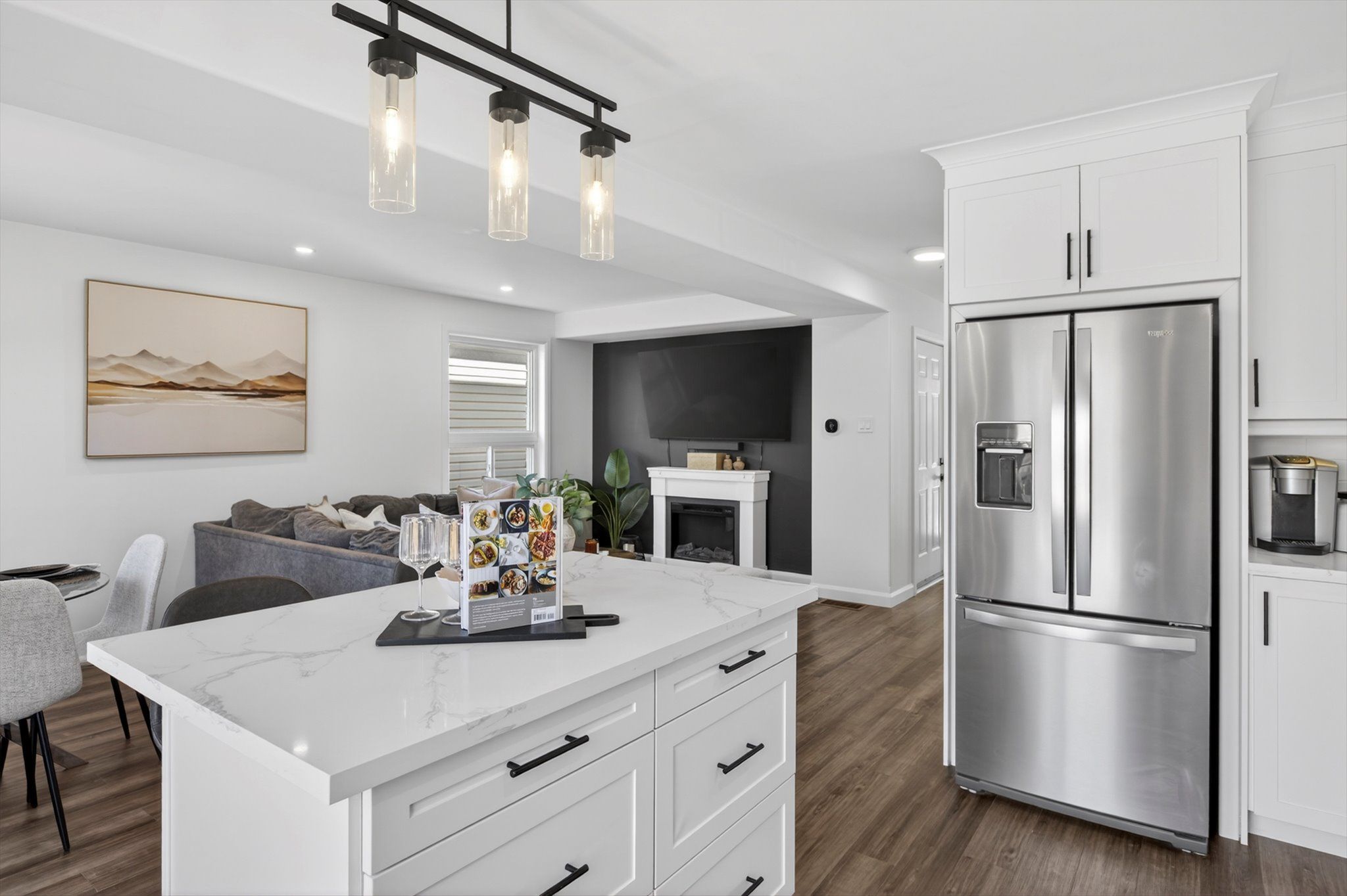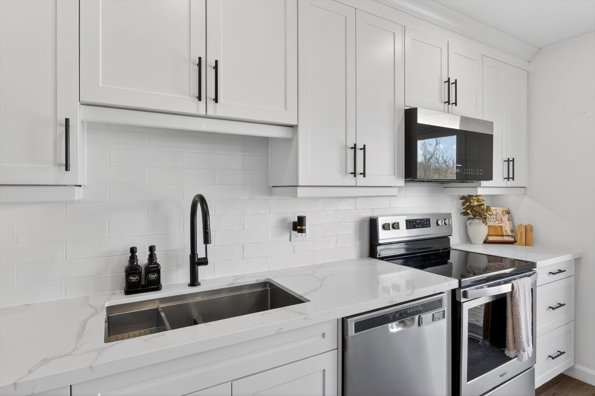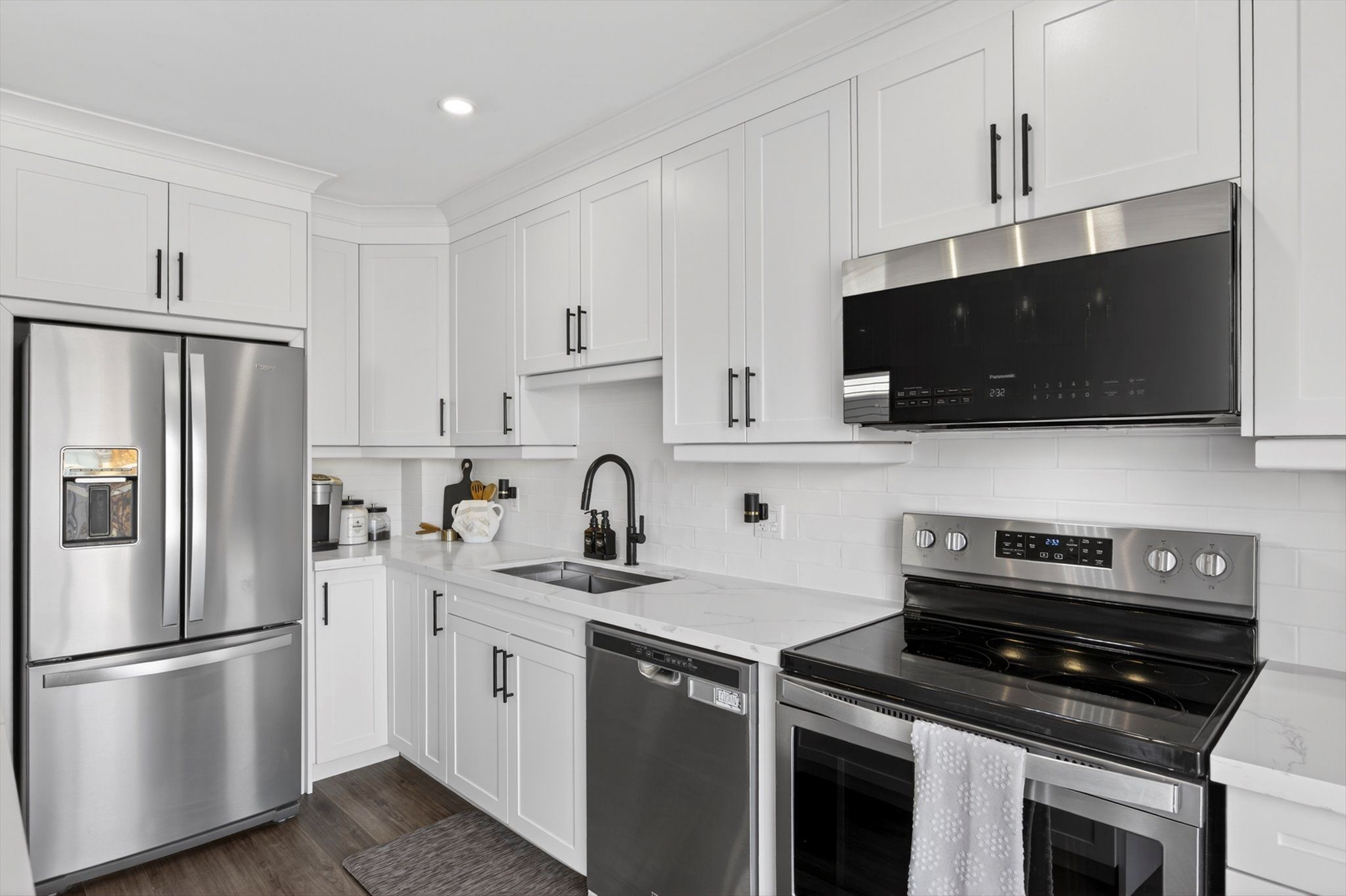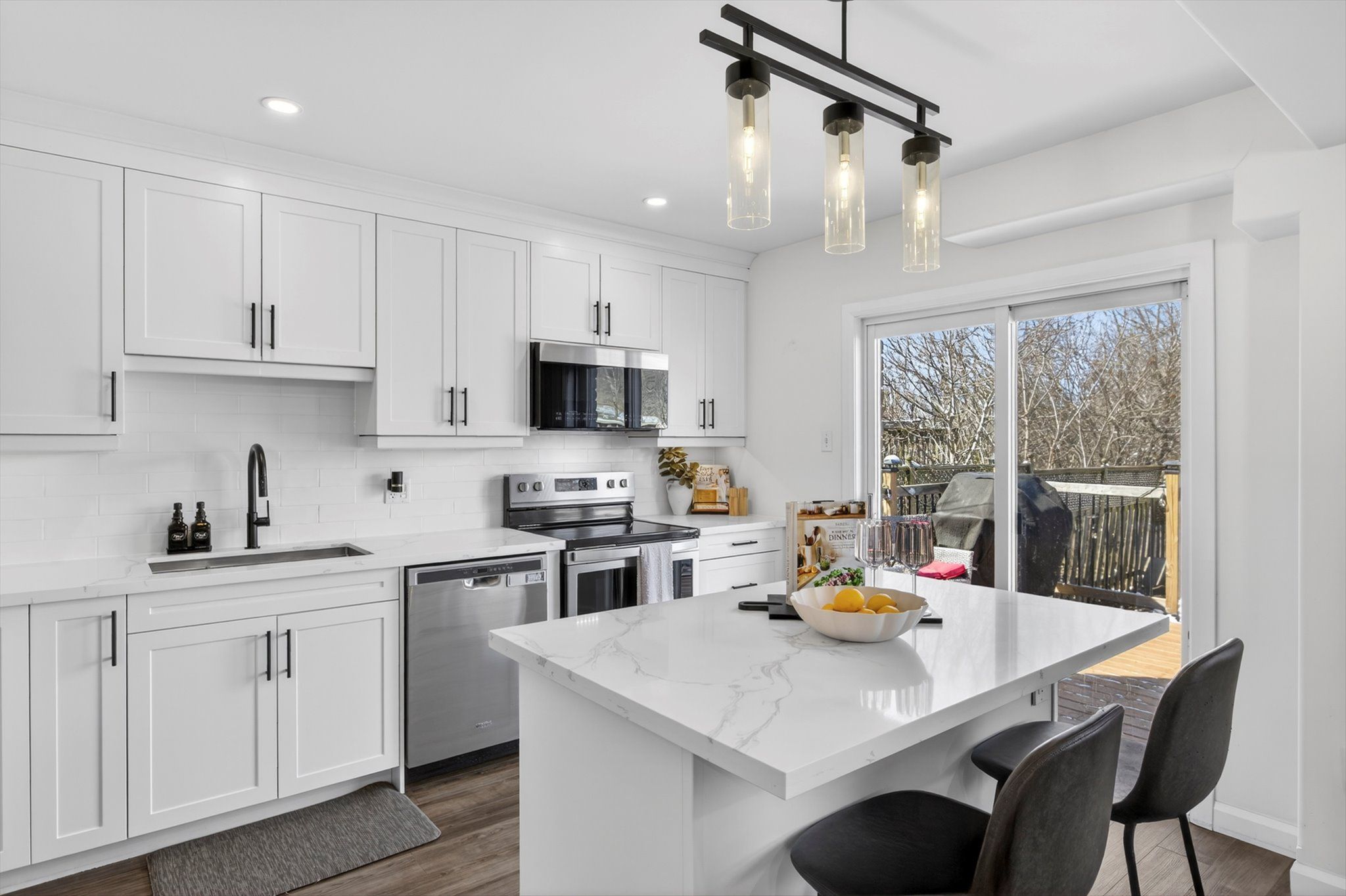 • Custom kitchen with quartz countertops, perfect for cooking and entertaining.