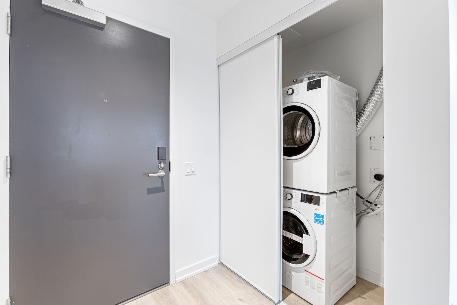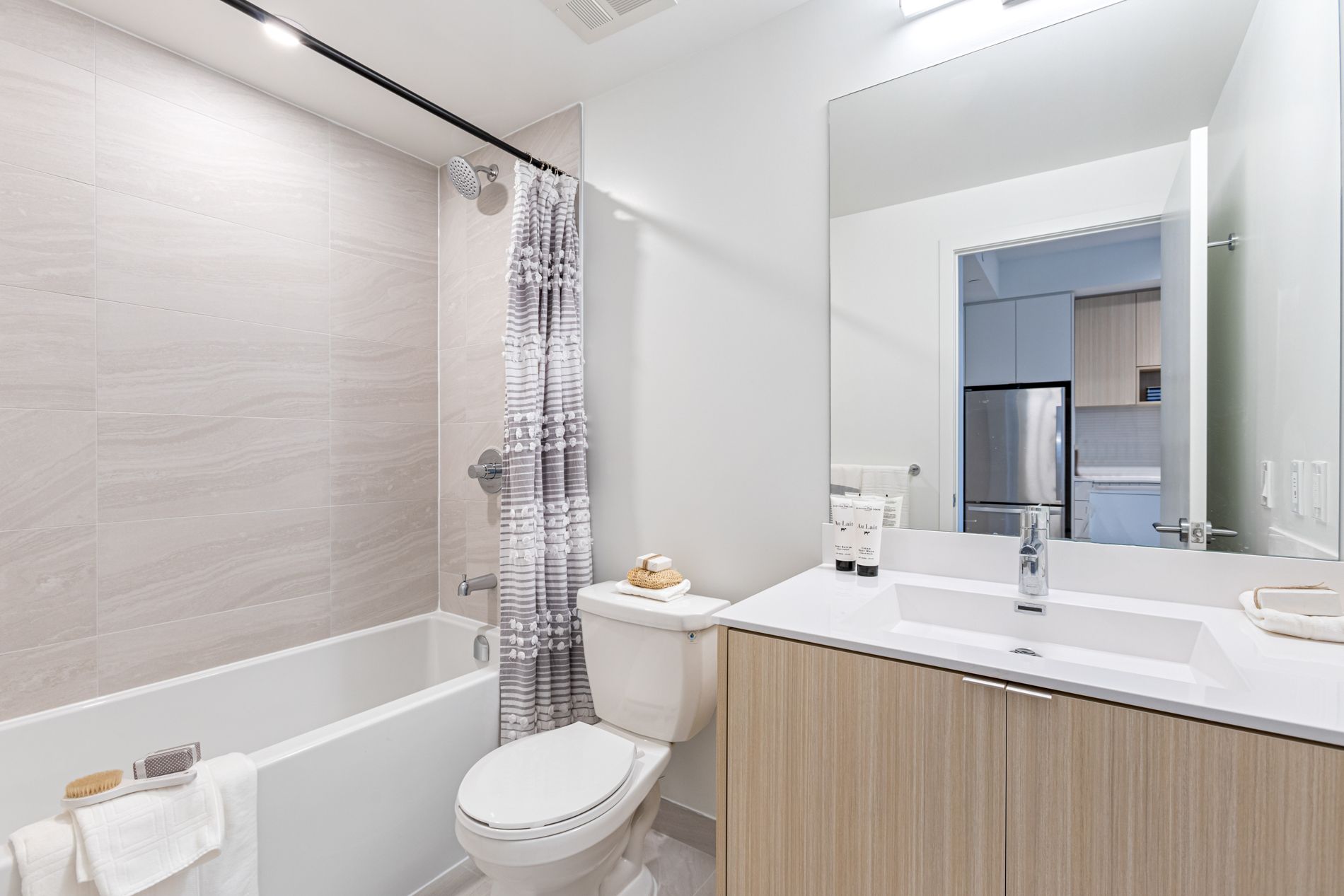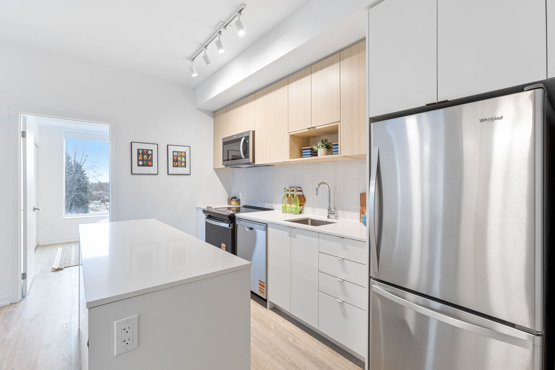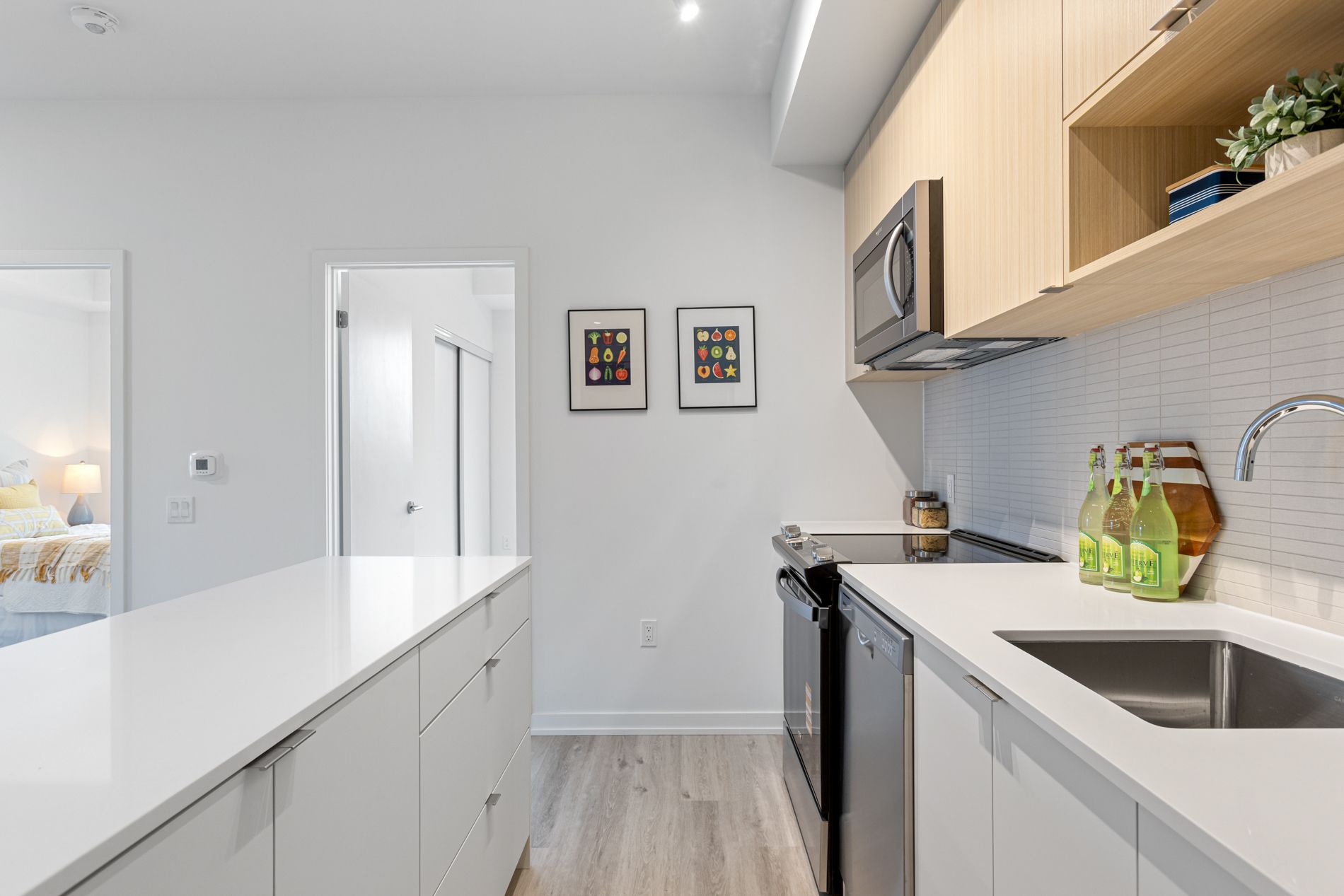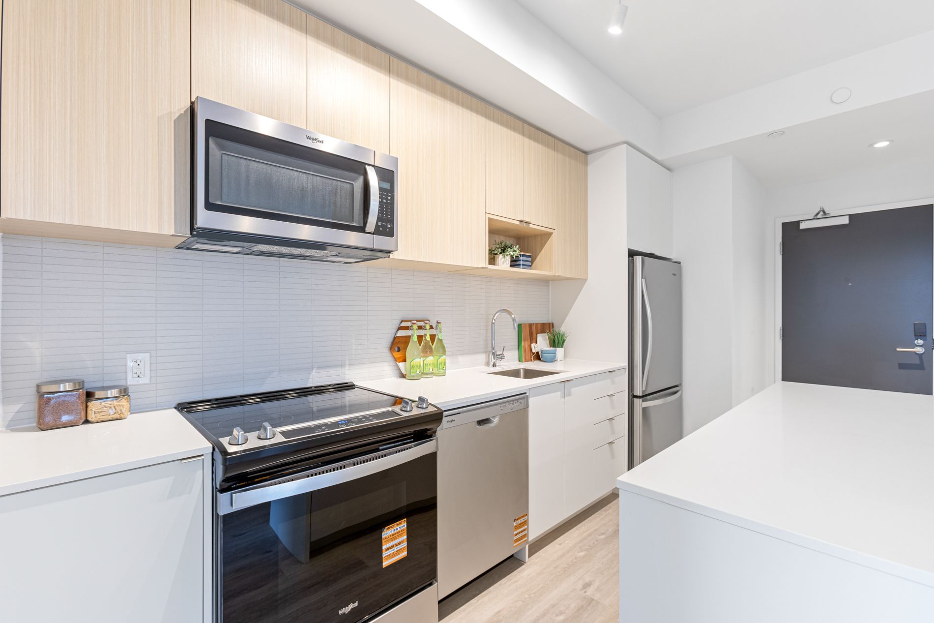 • Modern kitchen with quartz countertops and full-size stainless-steel appliances.