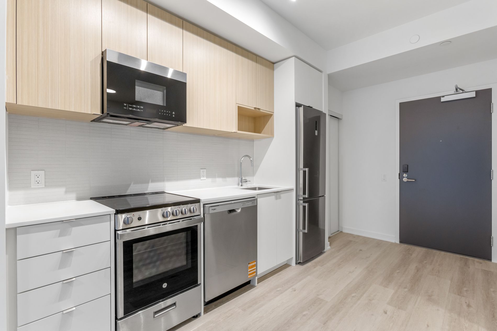 • Modern kitchen with quartz countertops and stainless-steel appliances.