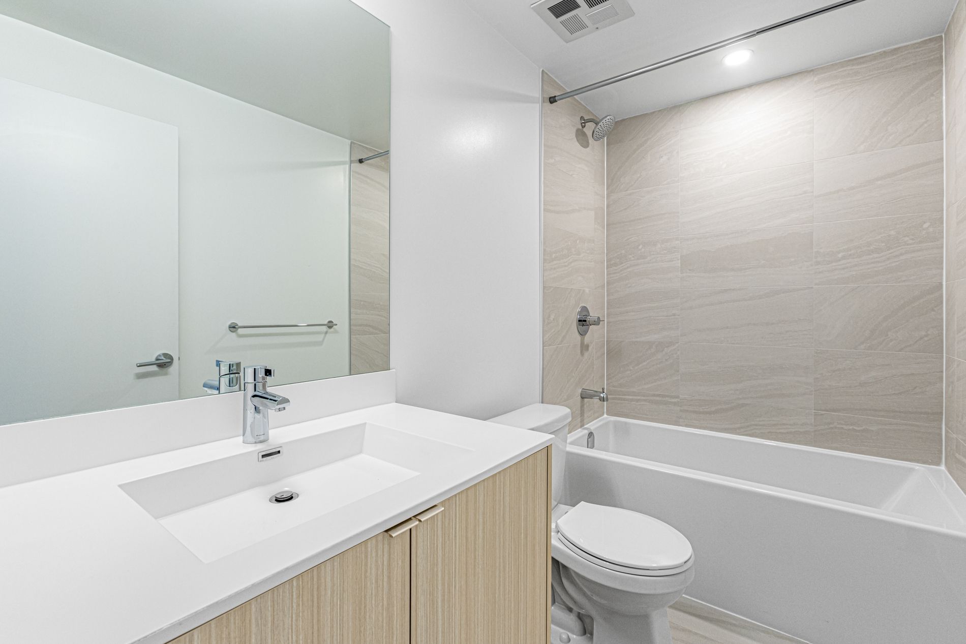 • Modern kitchen with quartz countertops and full-size stainless-steel appliances.