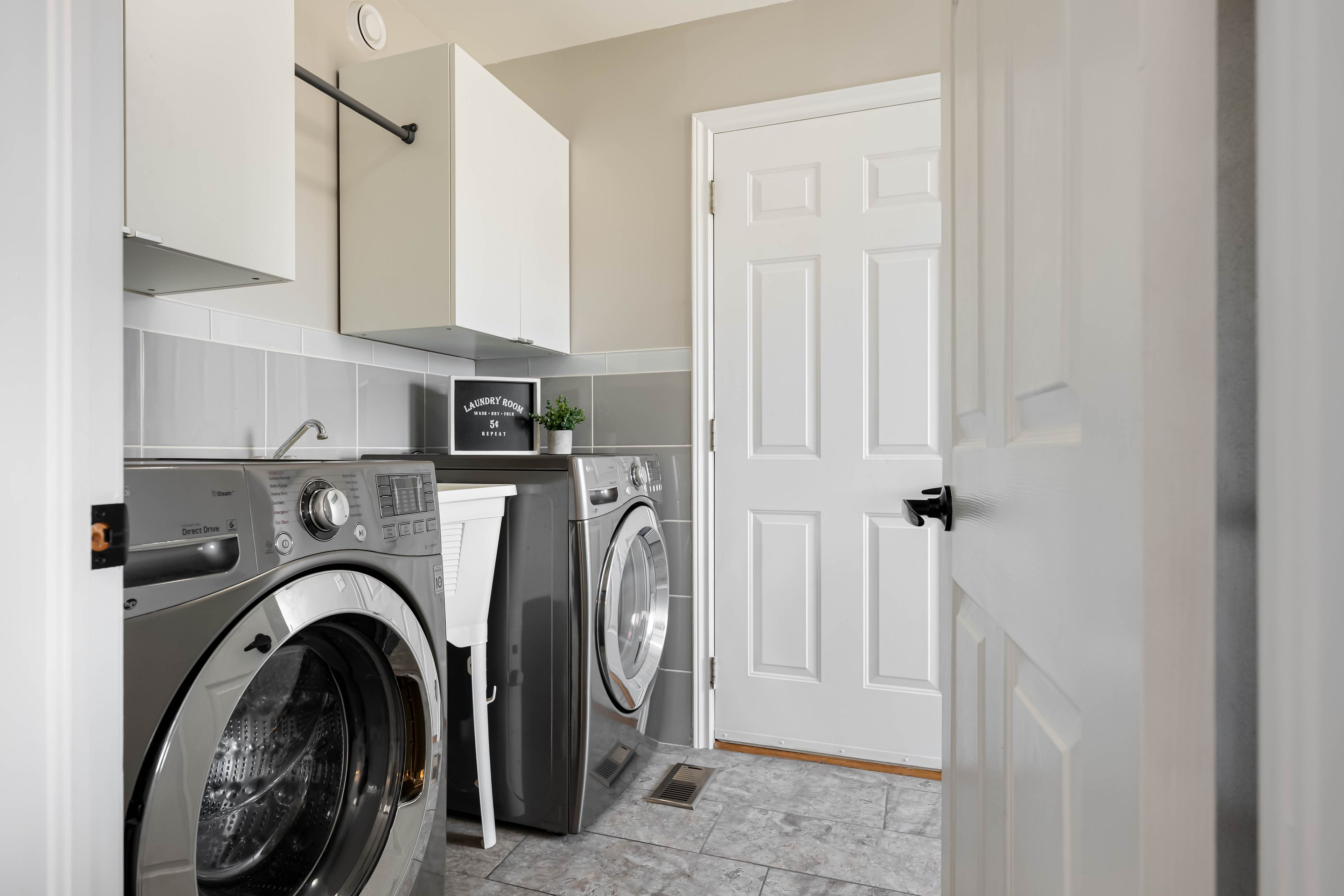 • Functional kitchen with stainless steel appliances and pantry storage.