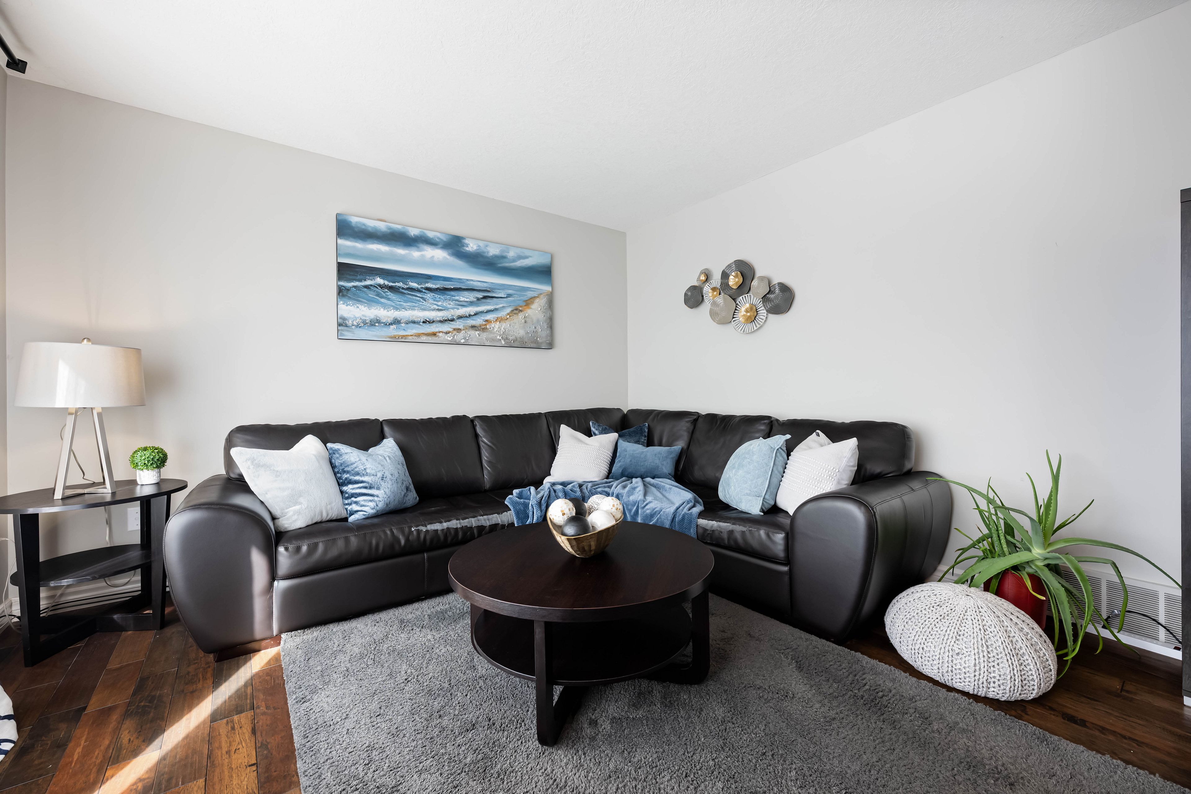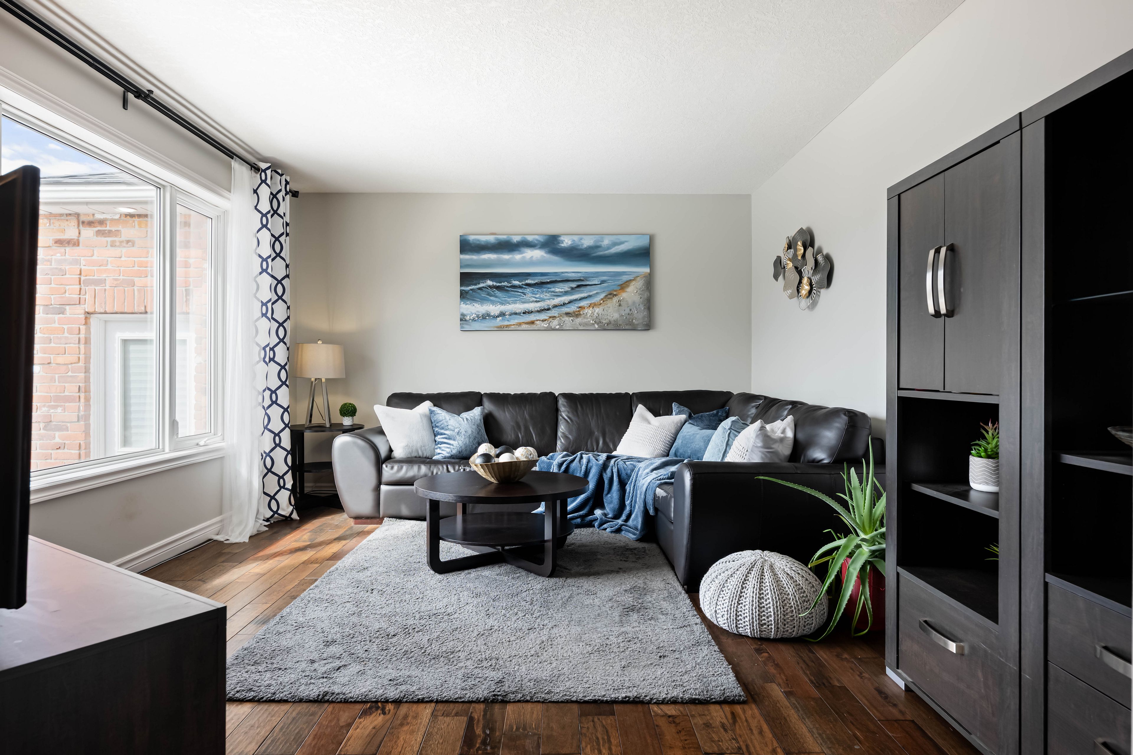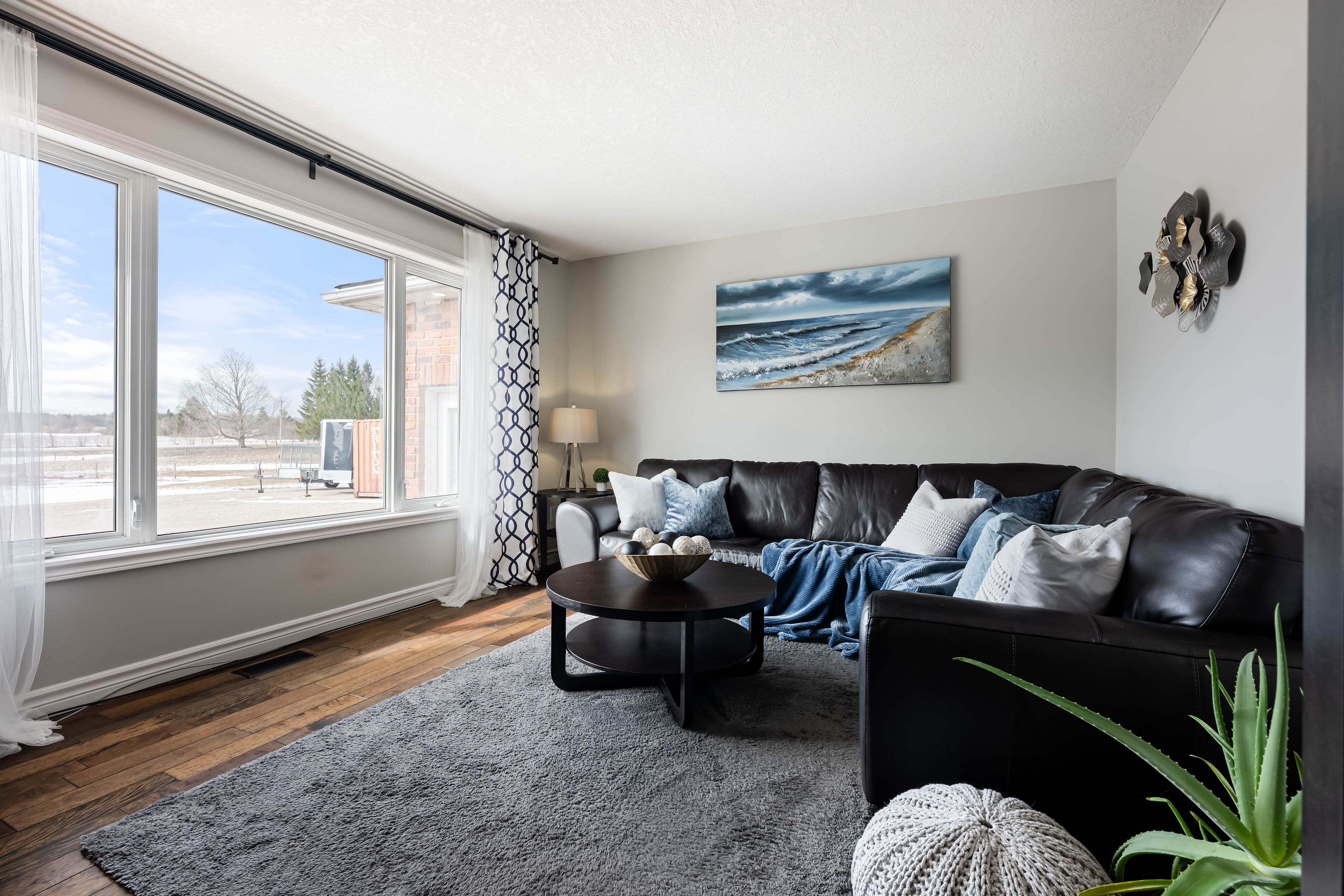 • Bright living room with hardwood floors and large windows showcasing scenic views.
