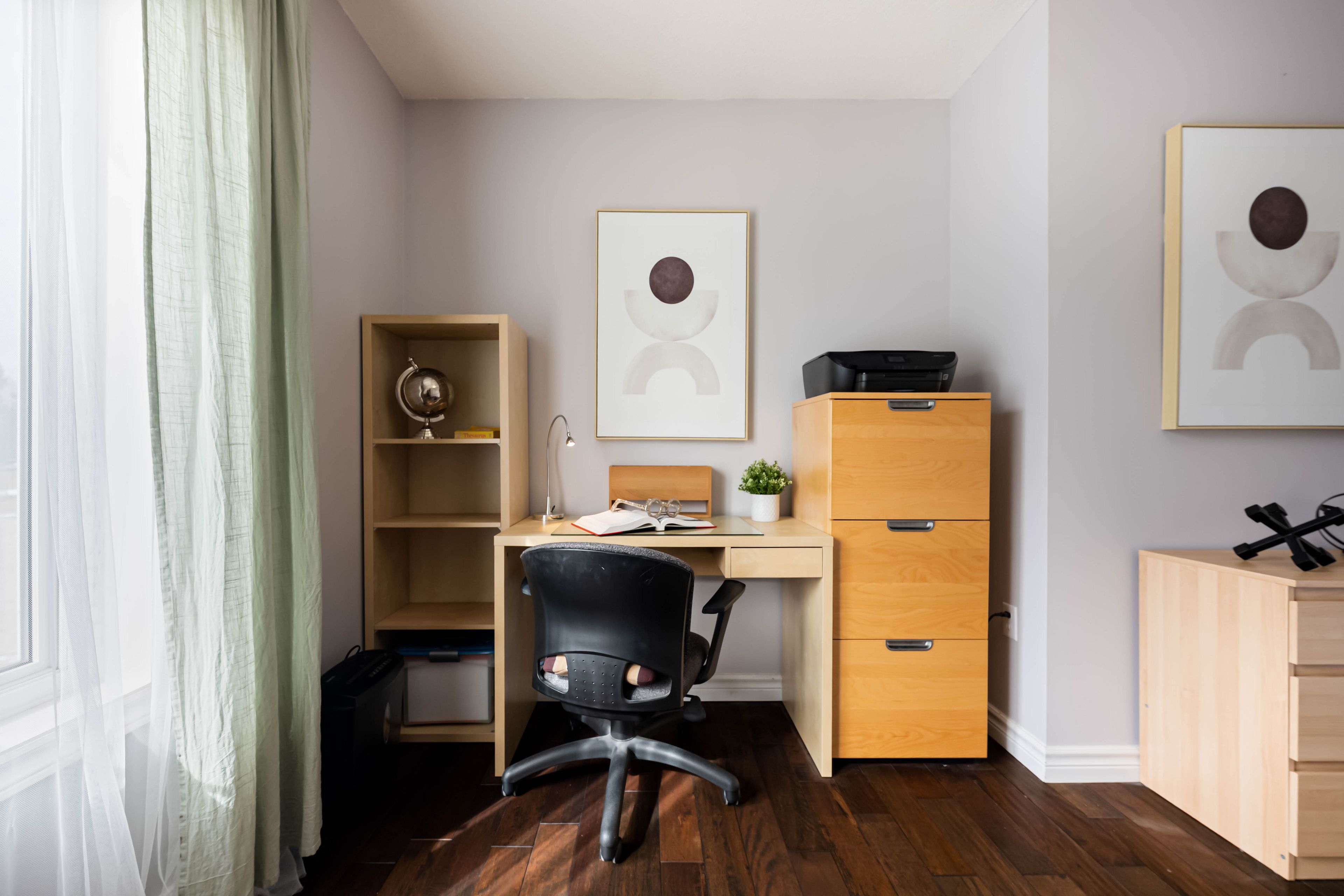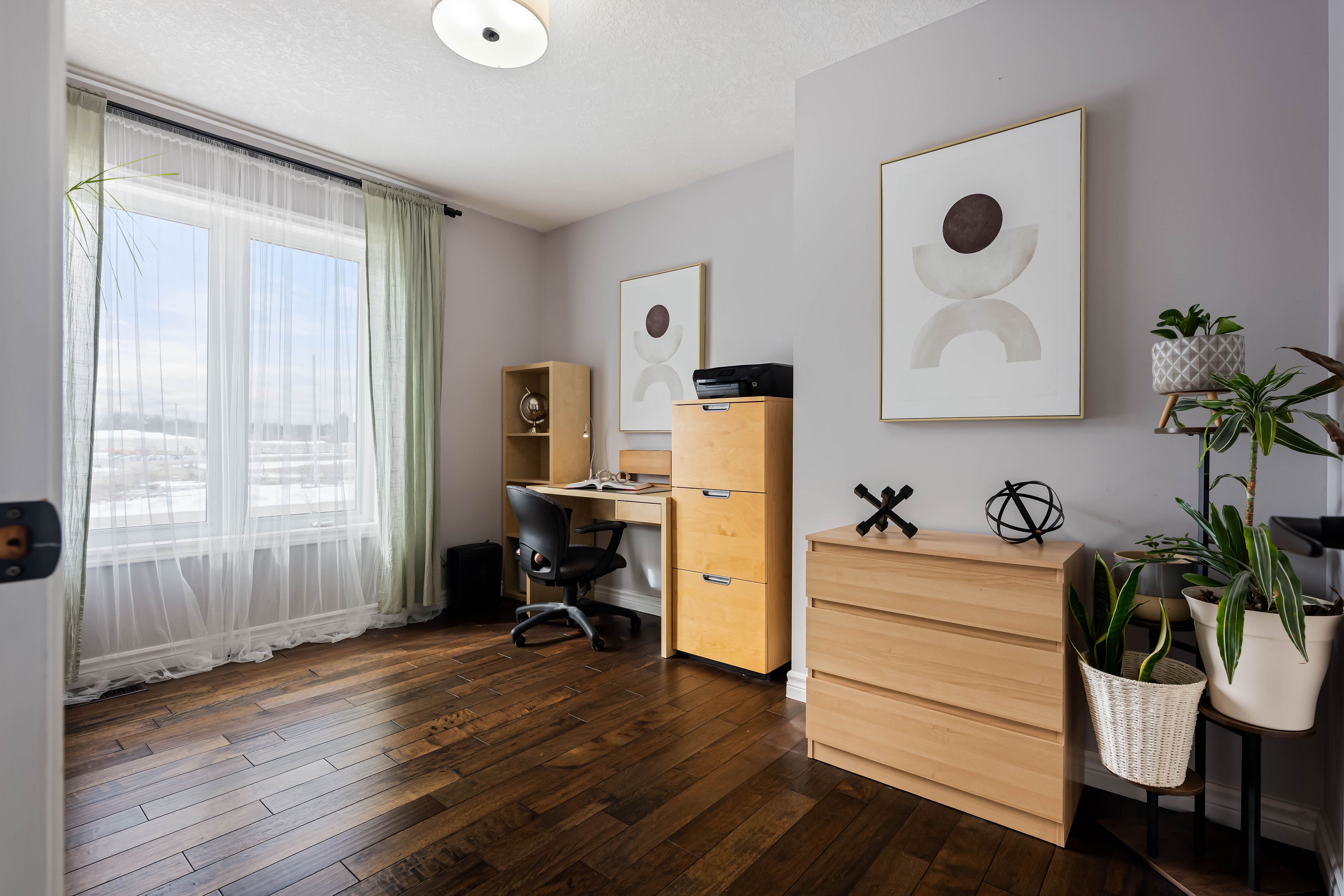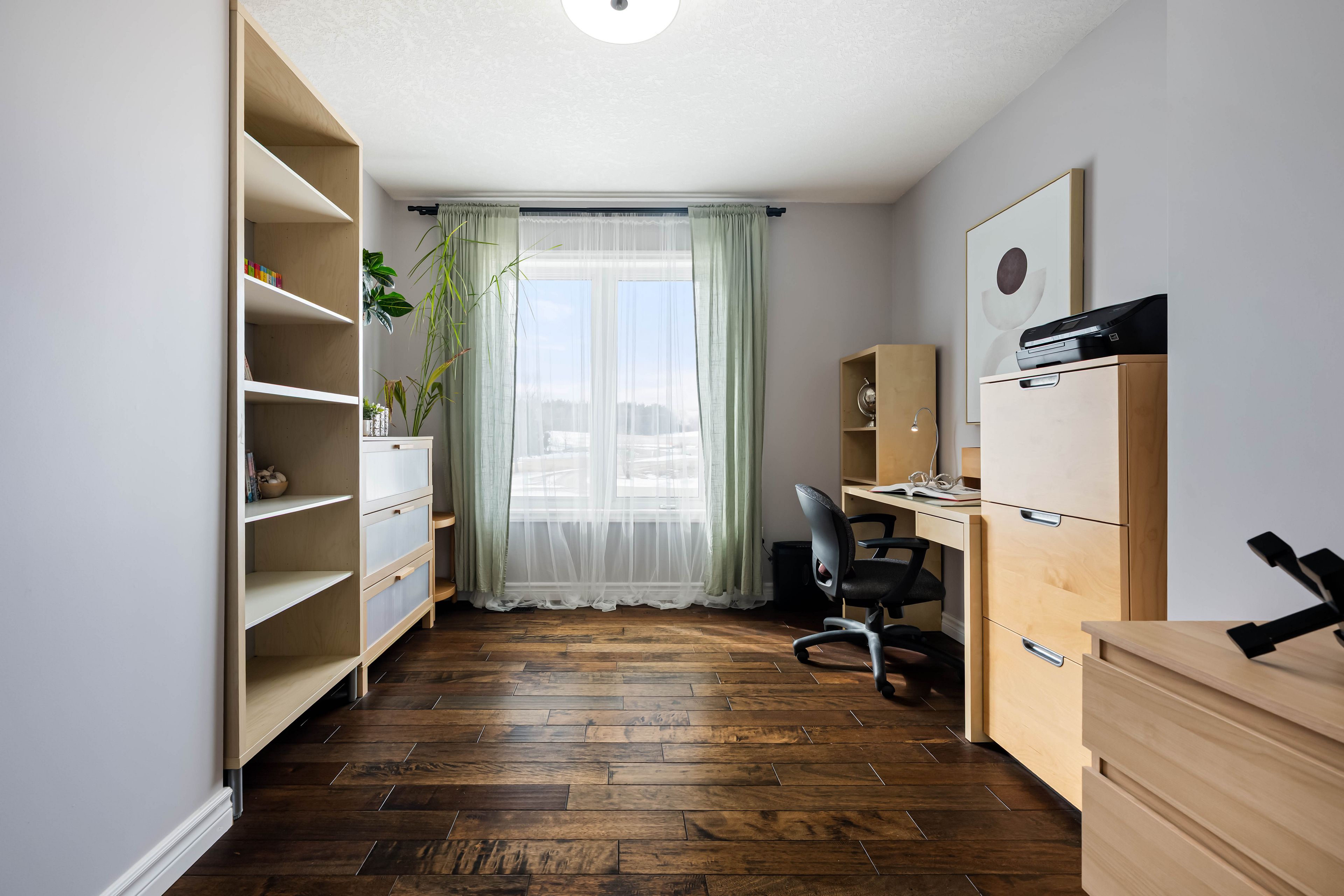• Bright living room with hardwood floors and large windows showcasing scenic views.
