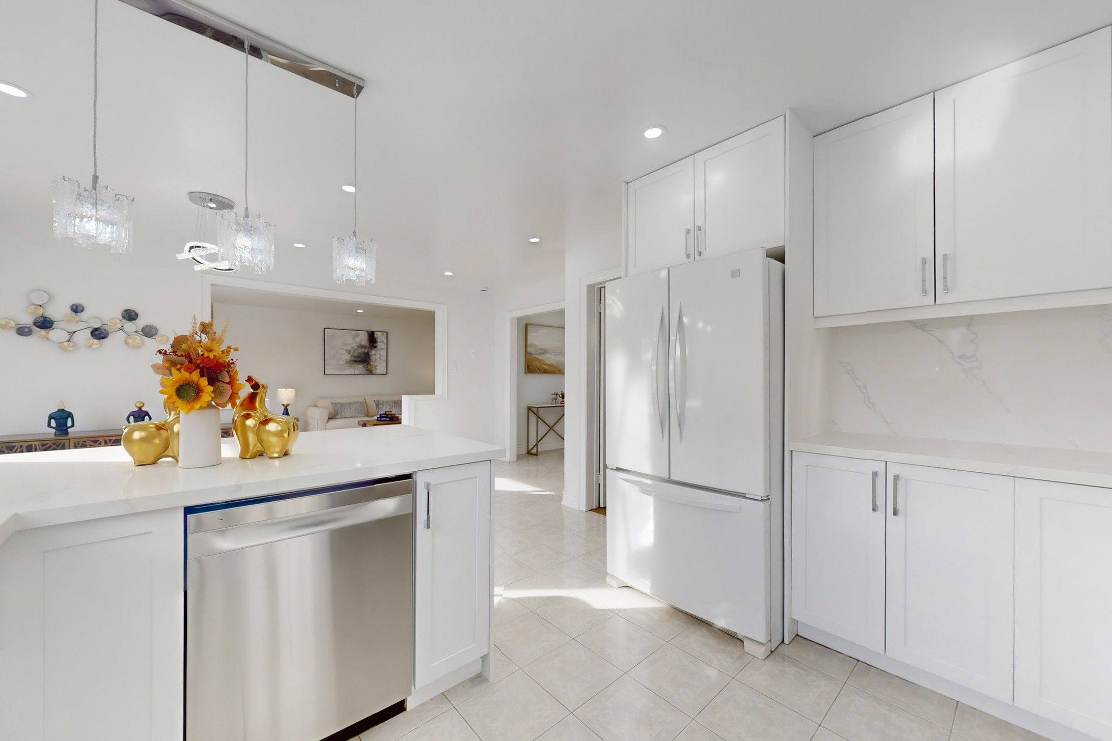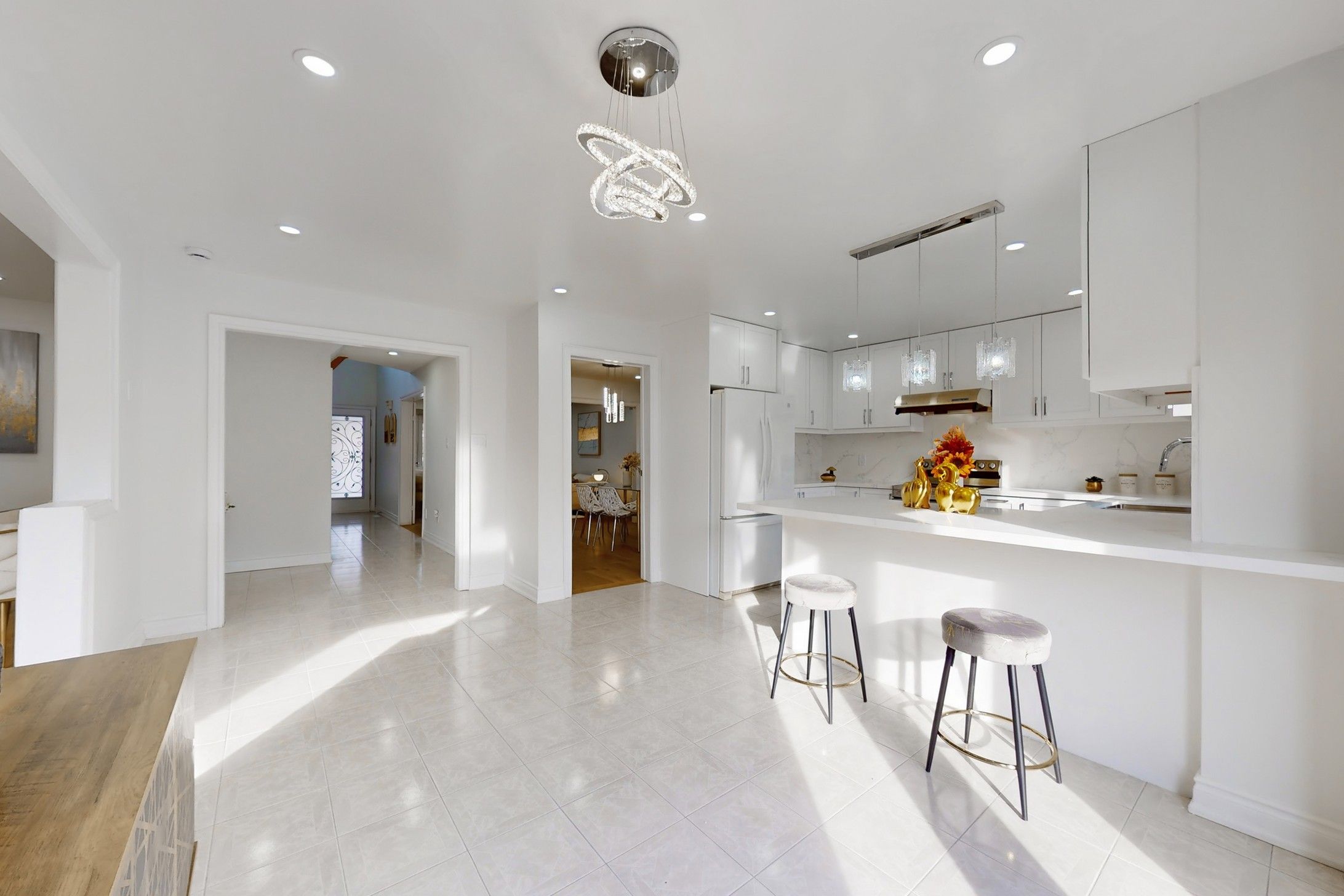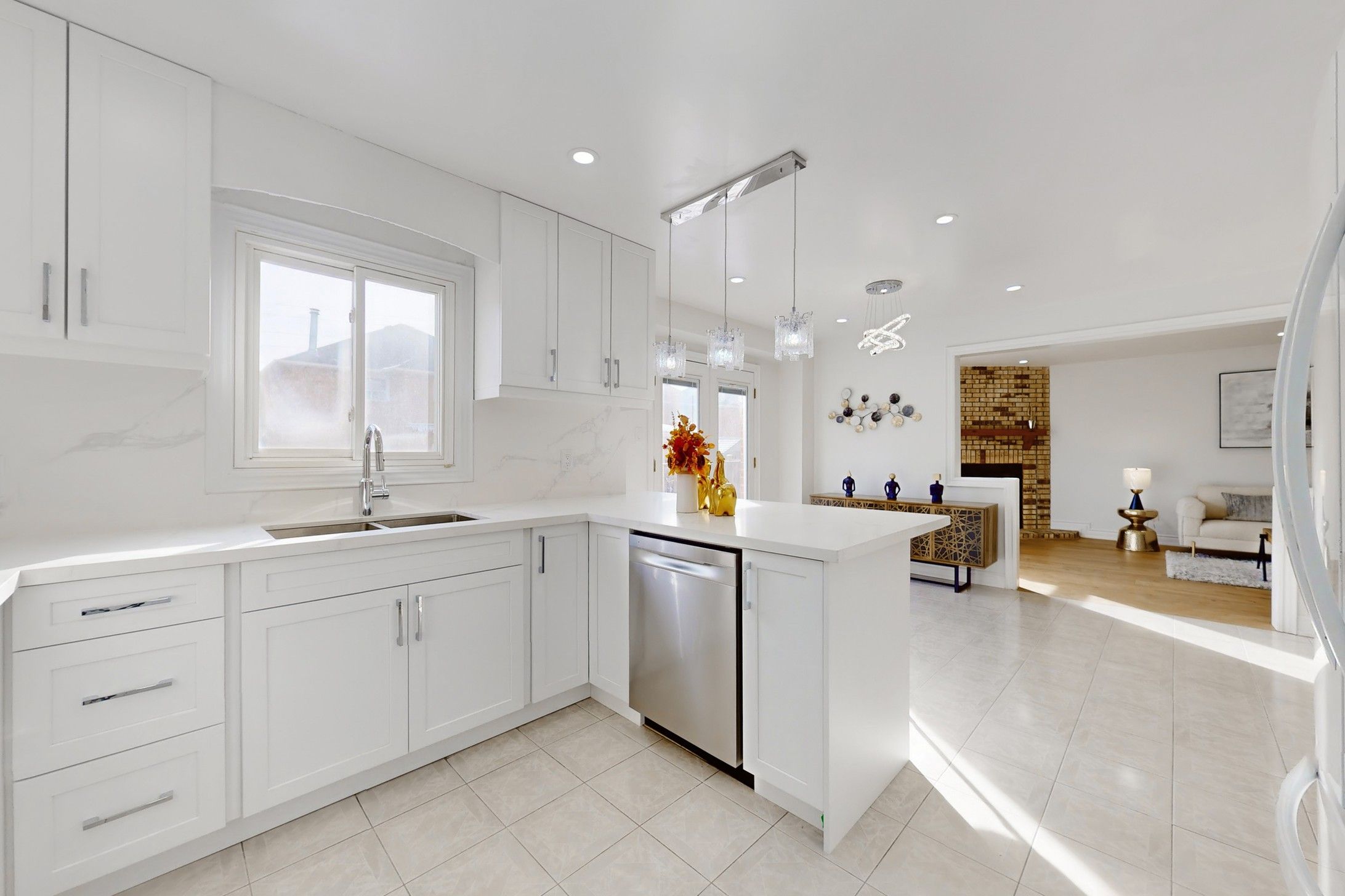 • Brand new kitchen and modern light fixtures for a fresh feel.