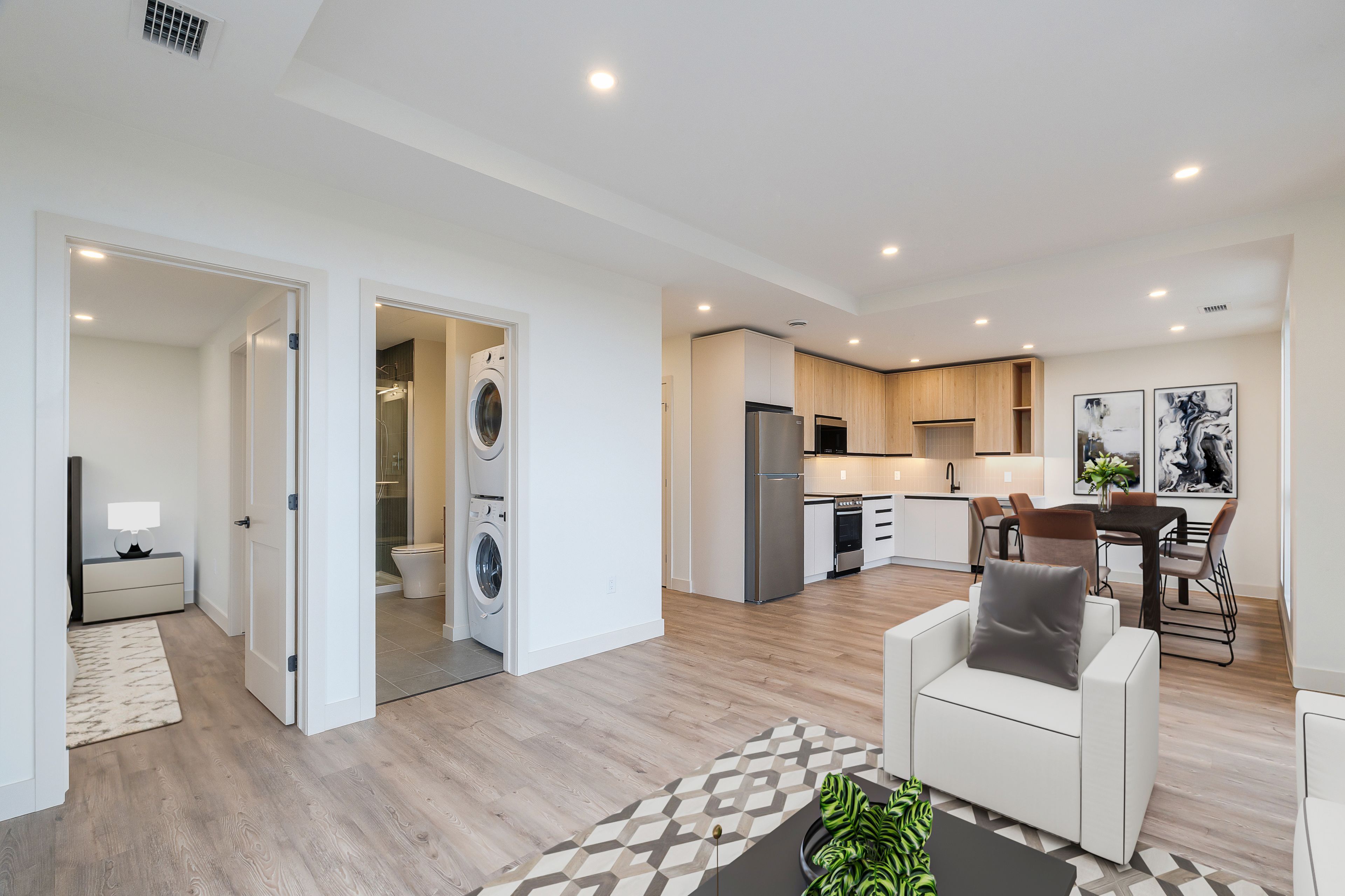 Experience modern living at the madera with assigned secured/heated parking, smart home technology, and instant high-speed internet (included in rate from cogeco) throughout the building. This pet-friendly community offers a safe and welcoming environment for those tenants seeking an upgraded lifestyle. This development offers modern interiors featuring luxury vinyl tile (lvt) in the foyer, kitchen, and living areas, with ceramic tile bathroom floors and tub/shower surrounds. Floor-to-ceiling windows, private balconies, and in-suite laundry are included in every unit, with two-bedroom layouts offering a tub in the main bath and a stand-up shower in the ensuite. Kitchens are equipped with large islands and quartz countertops, custom soft-close cabinetry, polished quartz counters with under mount stainless steel sinks and pull-down faucets, tiled backsplashes, under cabinet led lighting, and a full stainless steel appliance package including dishwasher and microwave. Mechanical and plumbing features include air-source vrf heating and cooling, ervs in each unit, modern plumbing fixtures, domestic hot water provided by an air-source heat pump, and a high-efficiency electric water heater. The building is finished with pot lights throughout, stylish flush-mount fixtures in living/dining areas and bedrooms, a tv-ready living room wall, and energy-efficient led lighting across all common and private spaces.