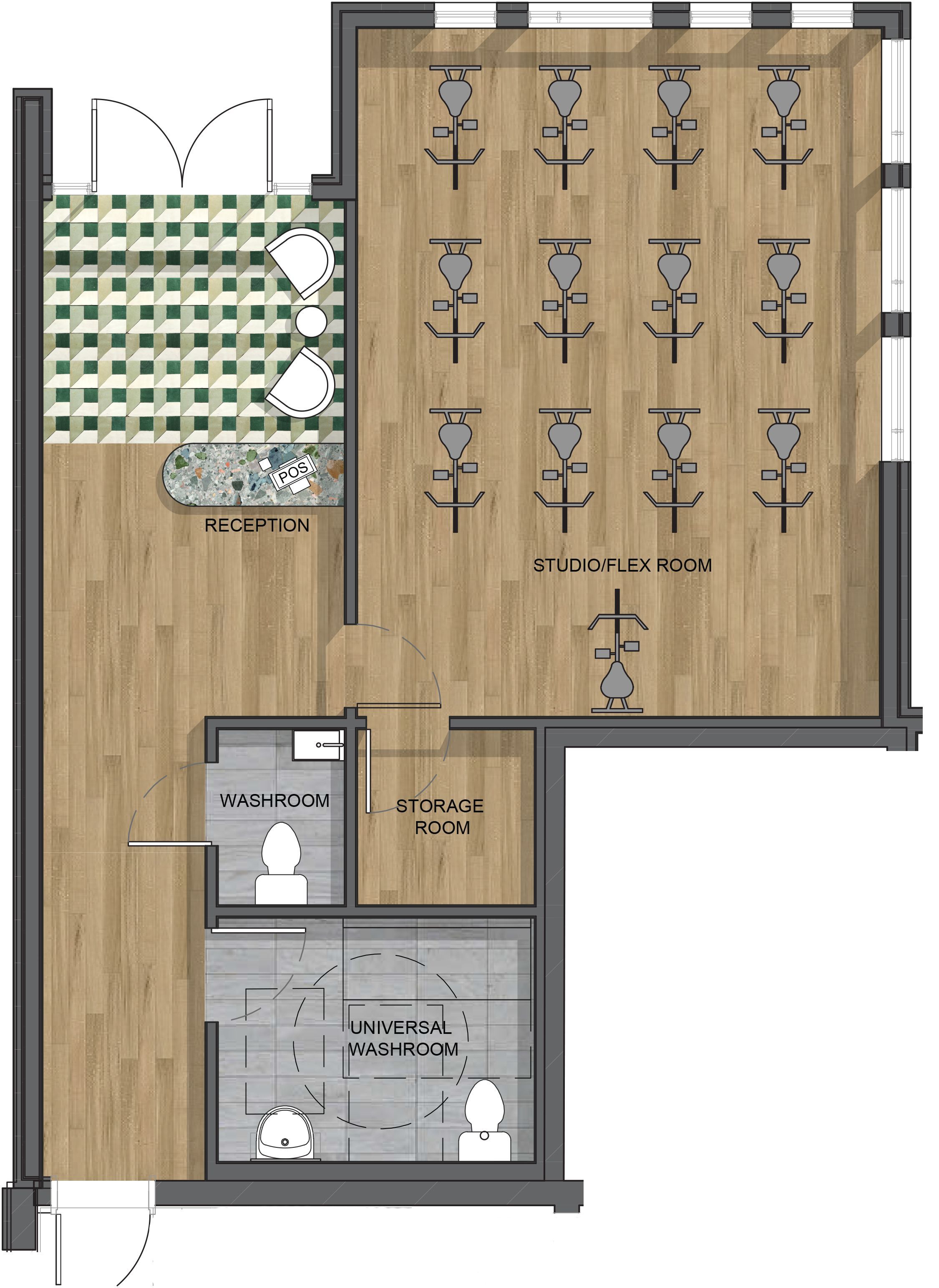 Commercial studio/flex space - ideal for fitness, wellness, or client-based services this thoughtfully designed commercial unit offers a highly functional and adaptable layout, ideally suited for fitness, wellness, and service-based businesses. The space features a bright and expansive open-concept studio floor plate, designed to accommodate group classes, training sessions, or flexible workspace configurations. A dedicated reception area with built-in pos provides a professional and welcoming client experience, while the efficient layout supports smooth circulation from entry to studio use. Additional features include a private storage room for equipment or supplies, a standard washroom, and a fully accessible universal washroom. With its clean, open-span design and purpose-driven configuration, this unit is ideally suited for boutique fitness studios, yoga or pilates instruction, personal training, wellness practices, or other client-focused businesses. The space offers flexibility while maintaining a strong operational foundation for a variety of commercial uses.