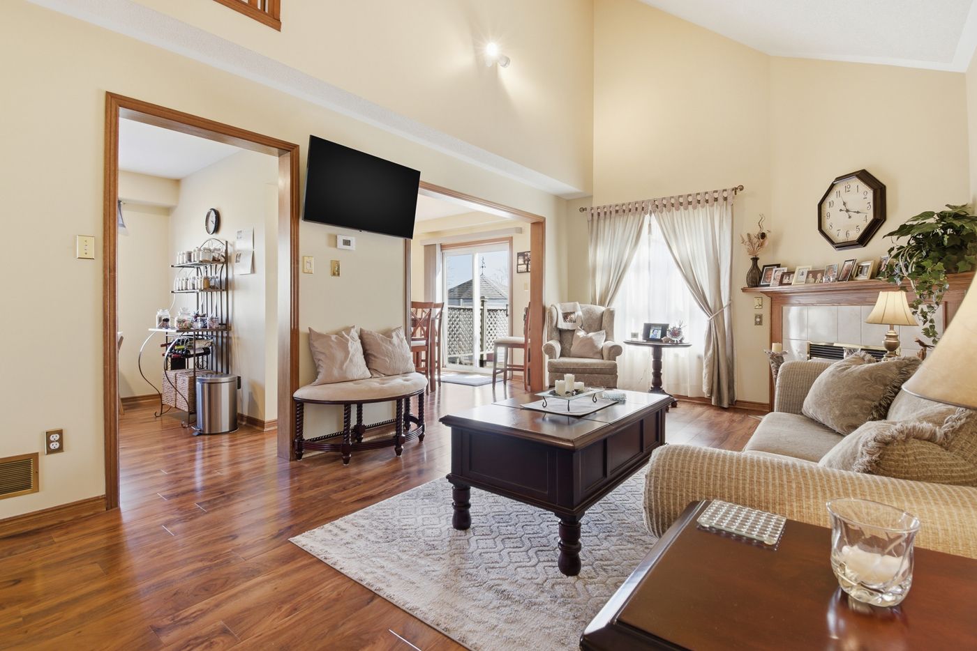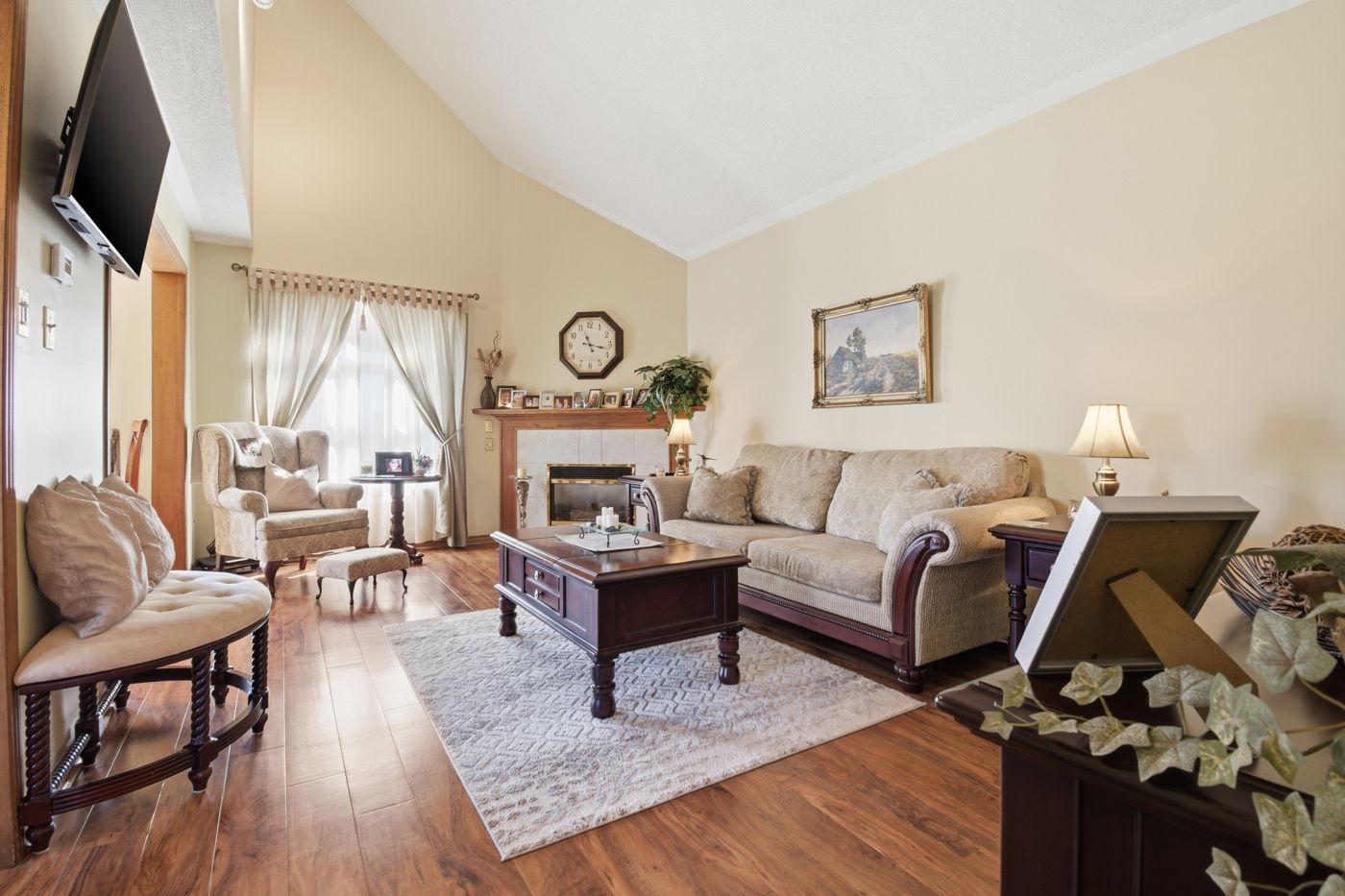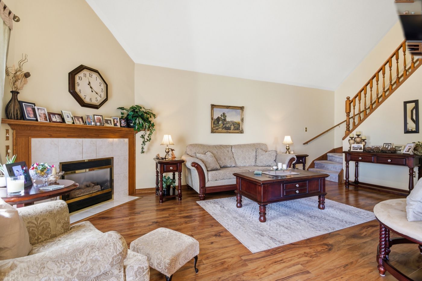 • Bright living room with vaulted ceilings and cozy gas fireplace.