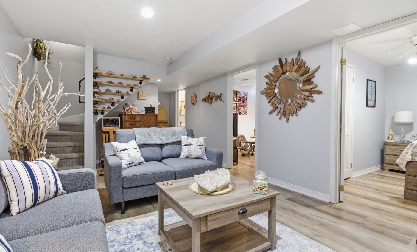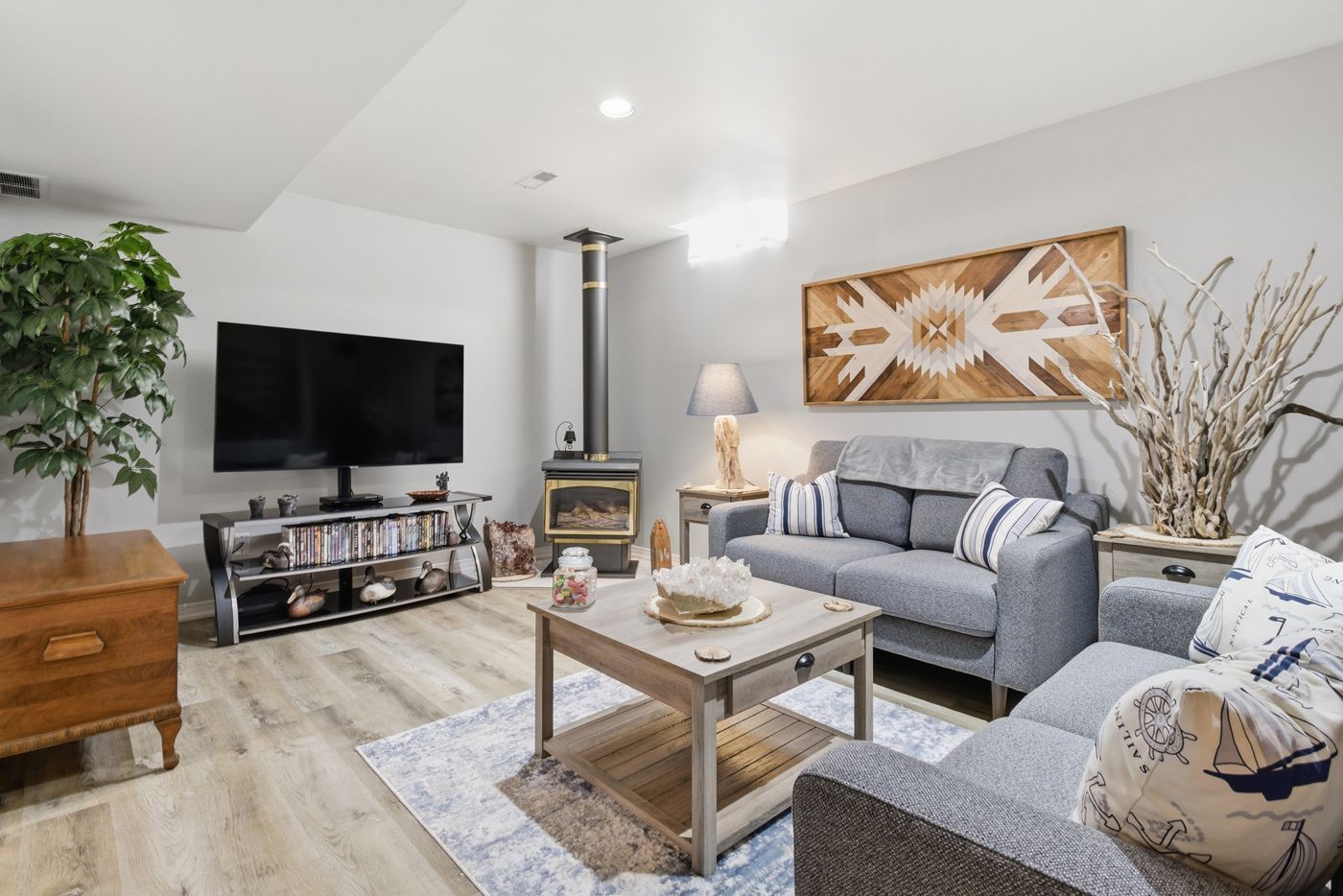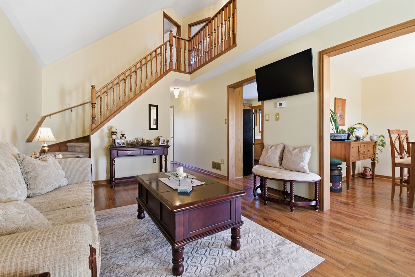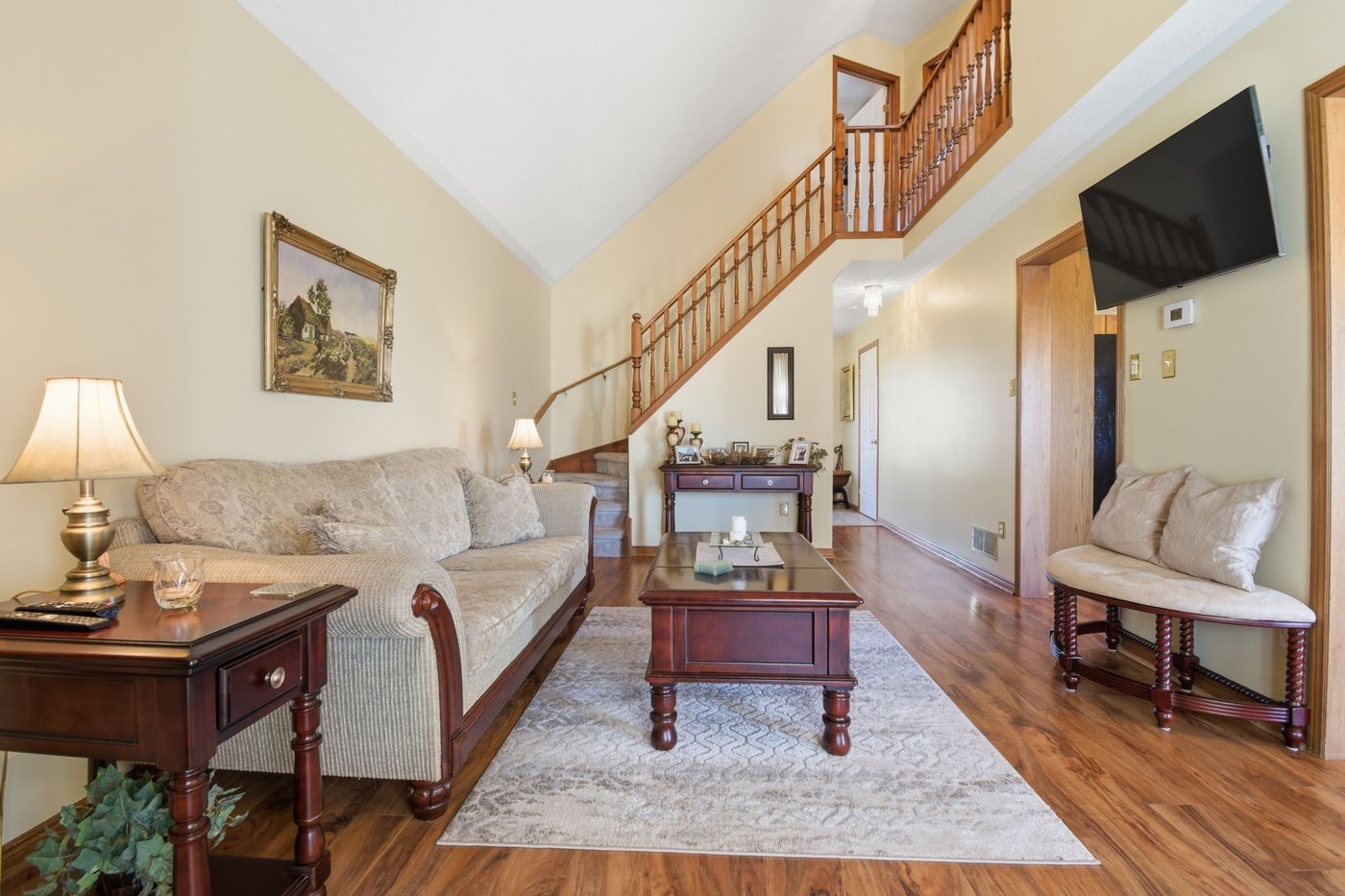 • Bright living room with vaulted ceilings and cozy gas fireplace.