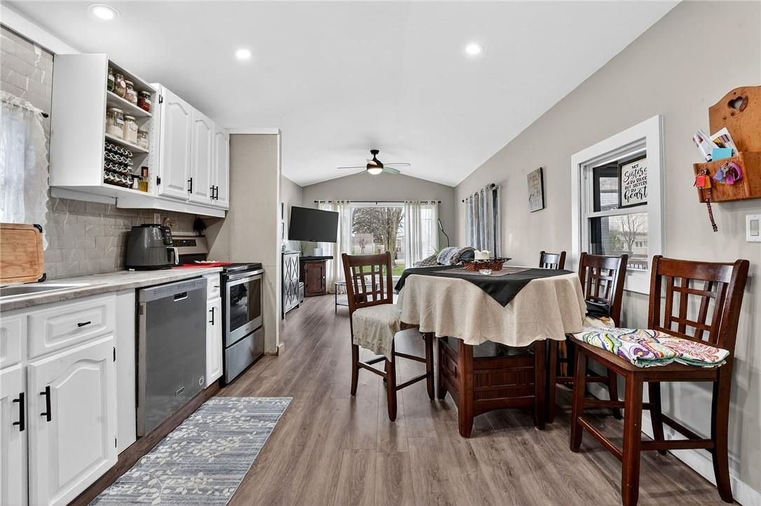 • Spacious open-concept living area with vaulted ceilings and new flooring.