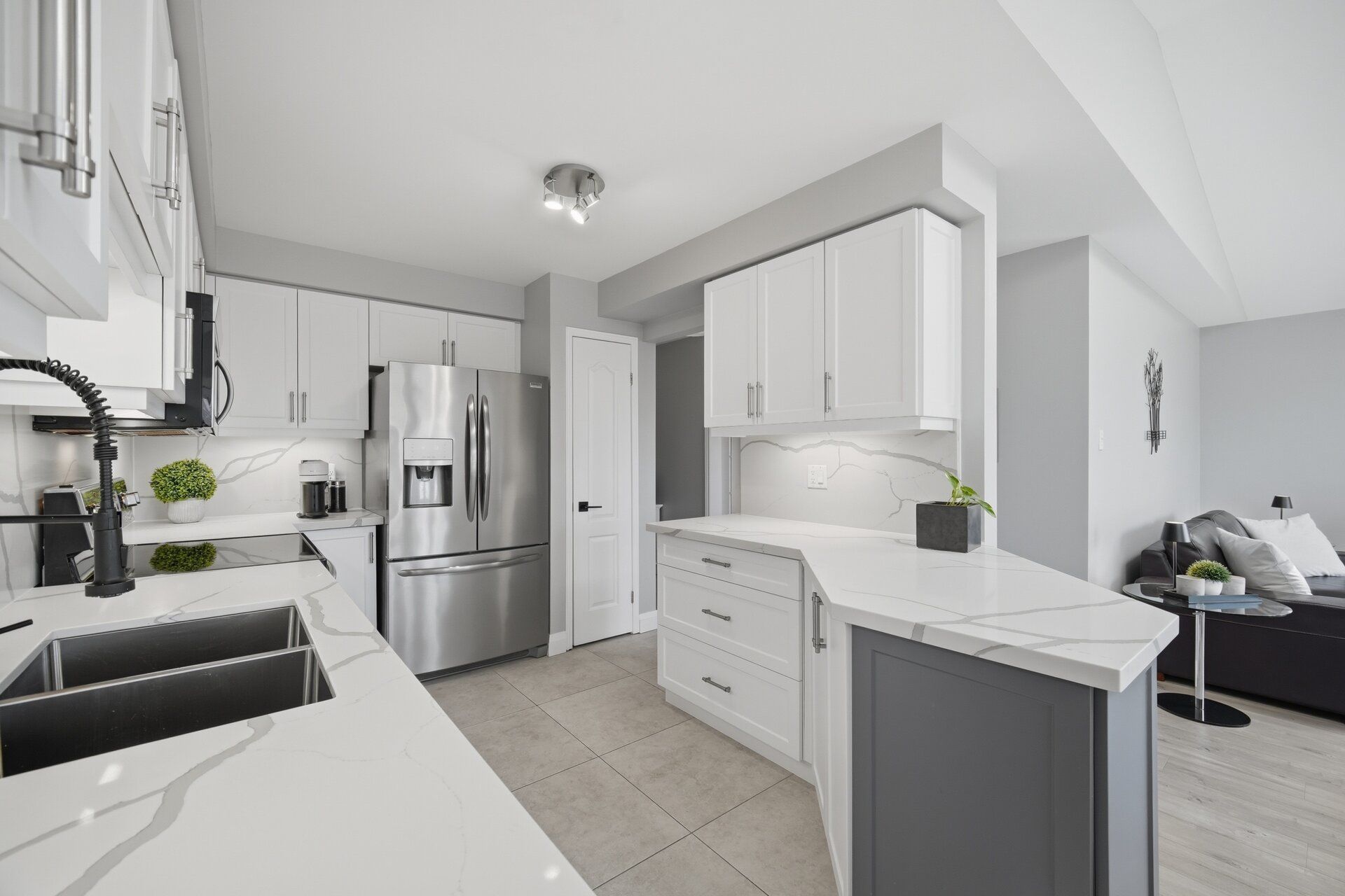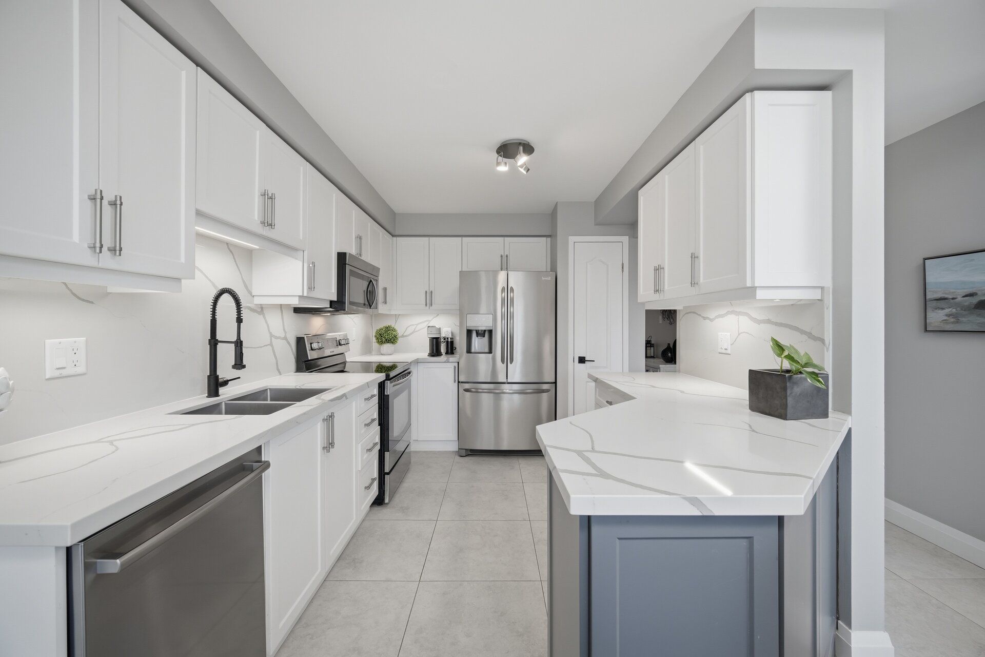 • Stylish chef's kitchen with quartz countertops and stainless steel appliances.