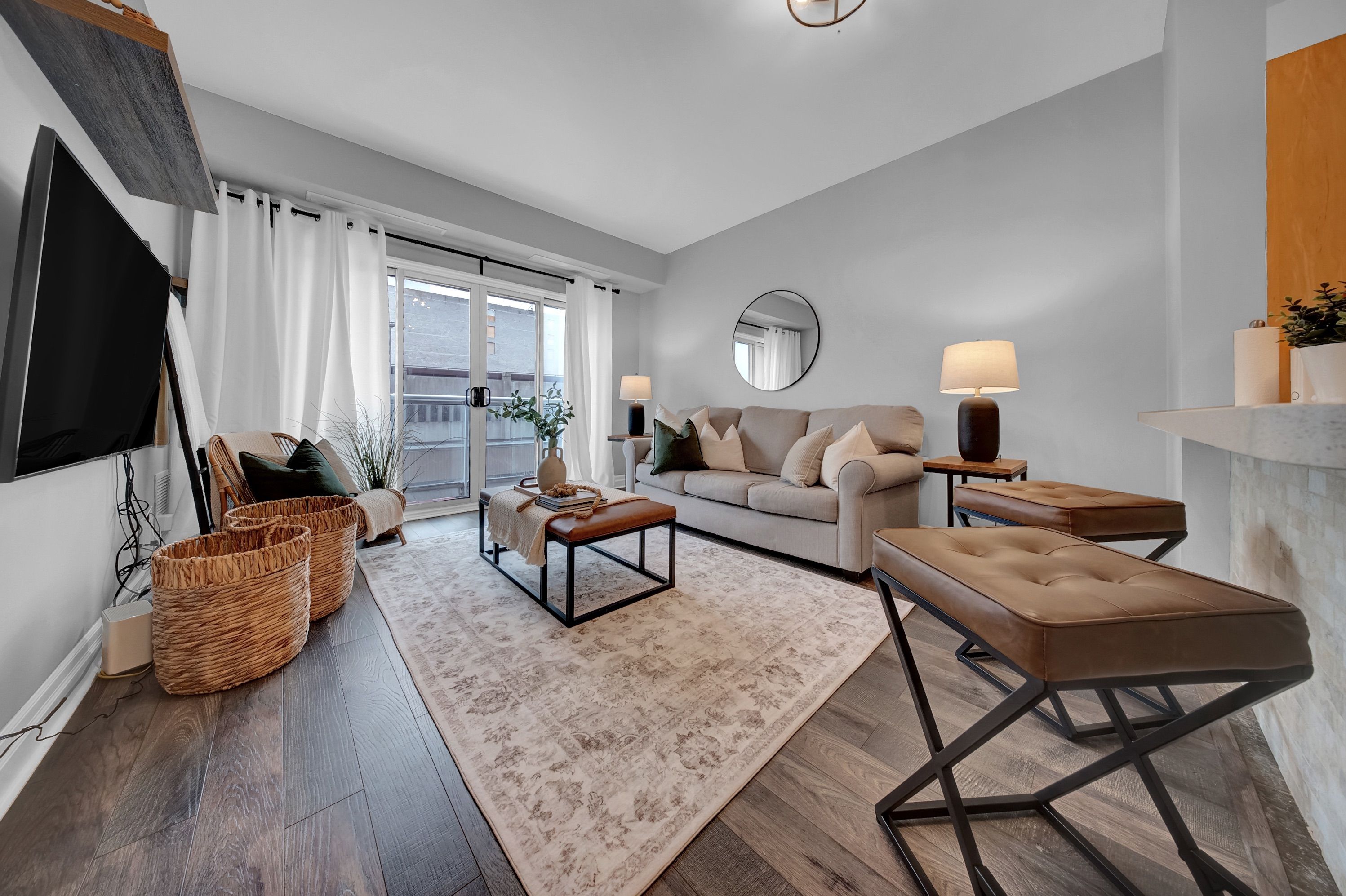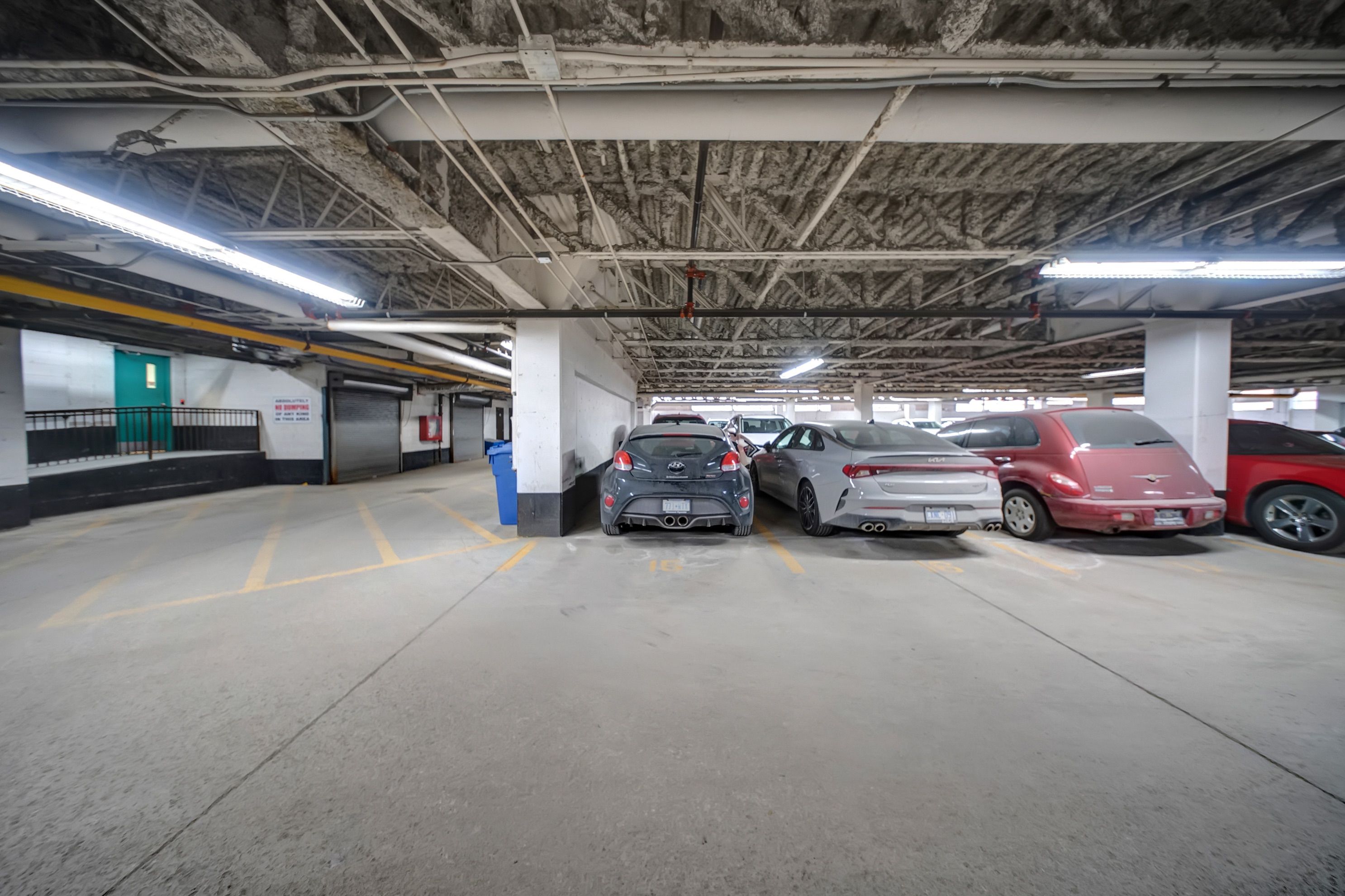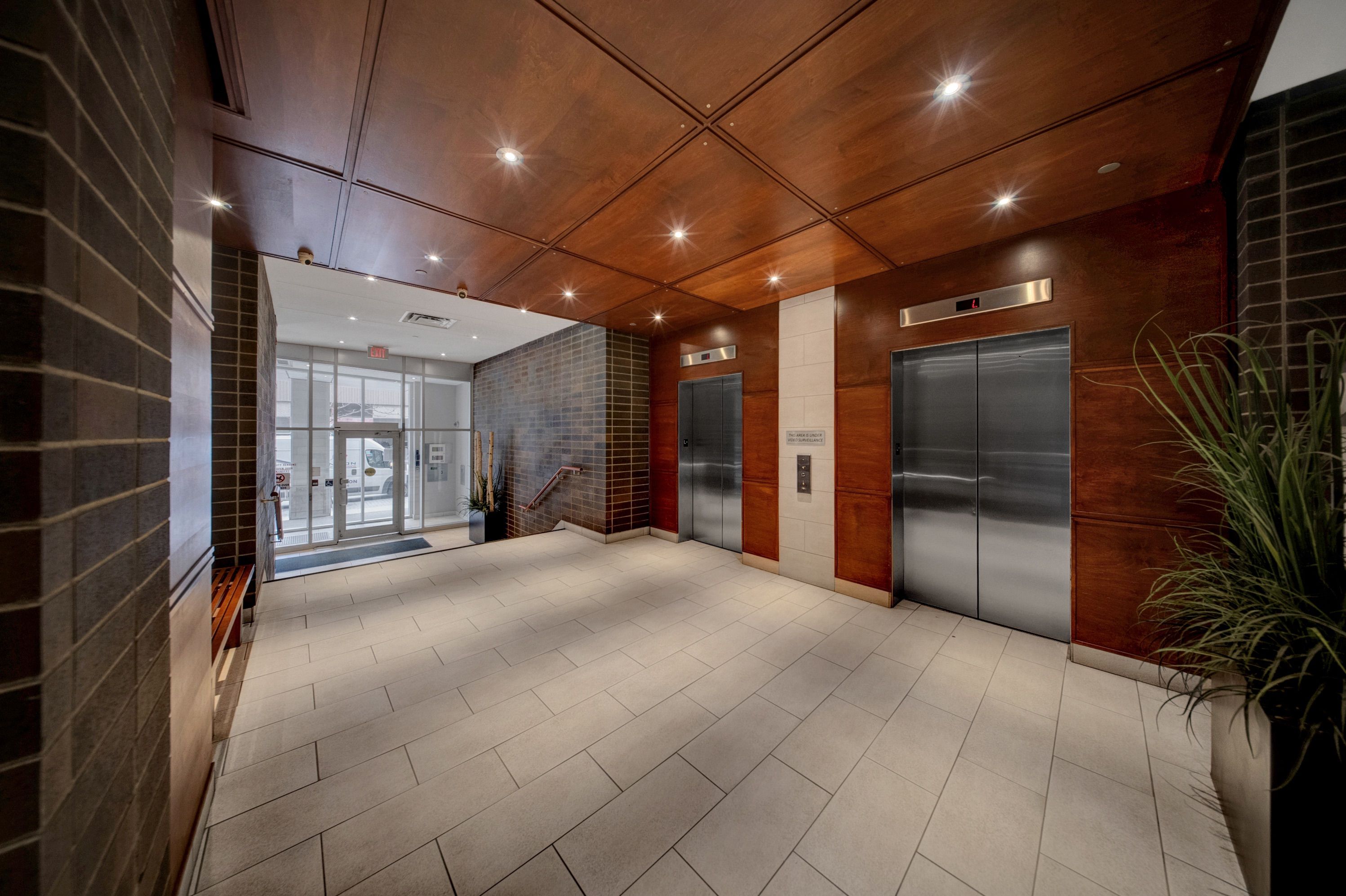 Soaring 9-ft. Ceilings, an accessible spacious layout, and a walkable downtown lifestyle! Located in one of downtown oshawa's most unique buildings, 'parkwood estates' originally converted from an office structure, this condo offers larger layouts and ceiling heights rarely found in typical developments. Step inside to discover large windows, city views, quality flooring, tile accents, and upgraded lighting throughout. Residents benefit from a gym, sauna, meeting room, pet-friendly living, controlled entry, and accessible common areas. Thoughtfully designed 1 bedroom + den layout offers excellent flexibility, the den positioned across from a 2-pc bathroom, making it ideal for a home office, or guest space. The bedroom features a large walk-in closet and an accessible ensuite bathroom complete with a walk-in tub conversion and grab bars. Bonus: lower light switches and a mobility-friendly layout. Enjoy the convenience of private full-size/front-load laundry, 1 indoor parking, & storage locker. The open-concept kitchen features quartz countertops, tile backsplash, double sink, and stainless steel appliances including an upgraded dishwasher and built-in over-the-range microwave, creating a modern and functional space for everyday living. Added peace of mind: the washer, dryer, dishwasher, and oven are under warranty until late 2026, and the hvac system was newly installed in 2024. Located in the heart of vibrant downtown oshawa, this home offers a highly walkable lifestyle with public transit at your doorstep. Steps to restaurants, cafés, parks, shopping, and entertainment. Close to ontario tech university, lakeridge hospital, golf club, ymca, the oshawa centre, and quick access to highway 401. A large public parking lot next door makes visiting from friends & family especially convenient. Ideal for first-time buyers, down-sizers, or investors seeking space, style, and location. ***guests park at 12 centre st. N, oshawa, directly across***