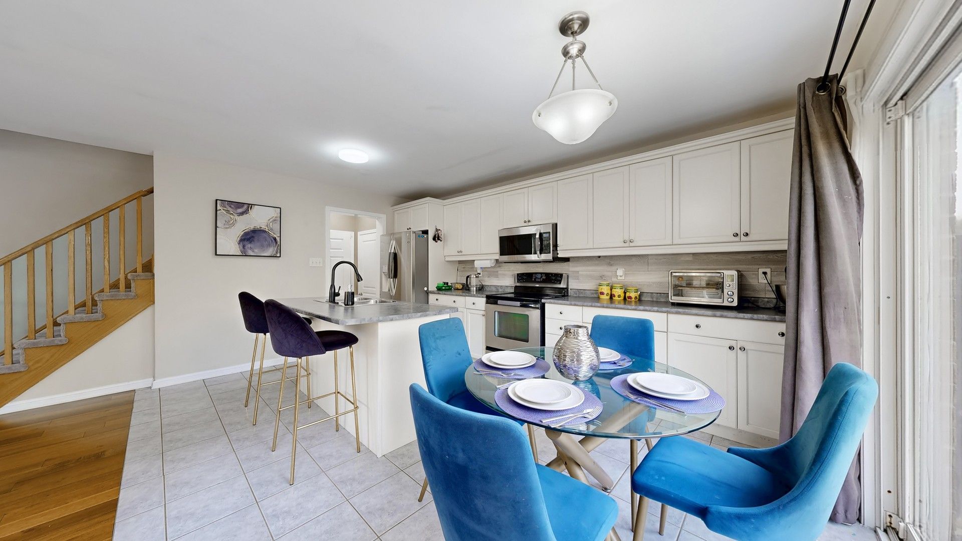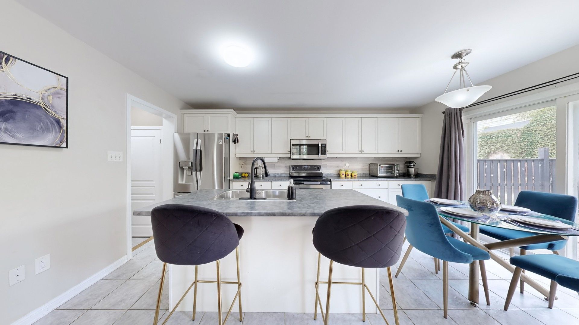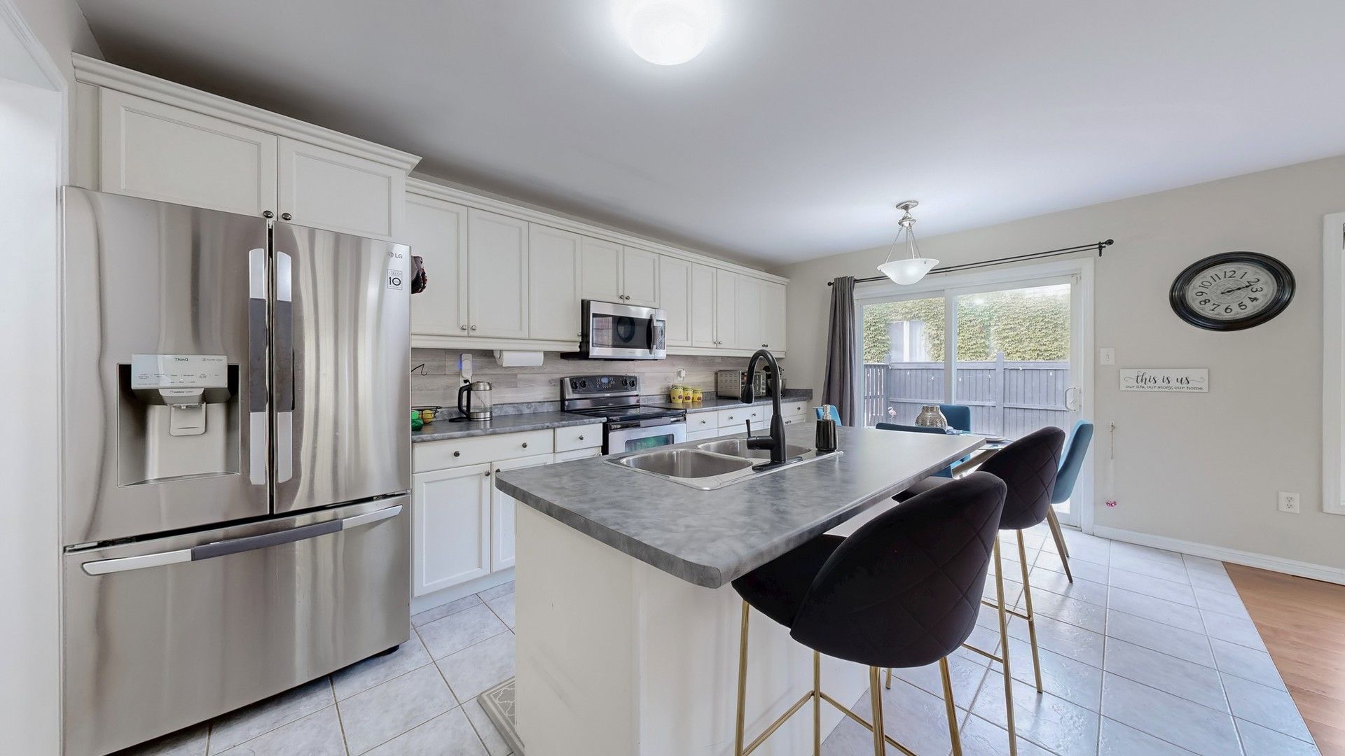 • Large eat-in kitchen with plenty of cupboard space and backyard access.