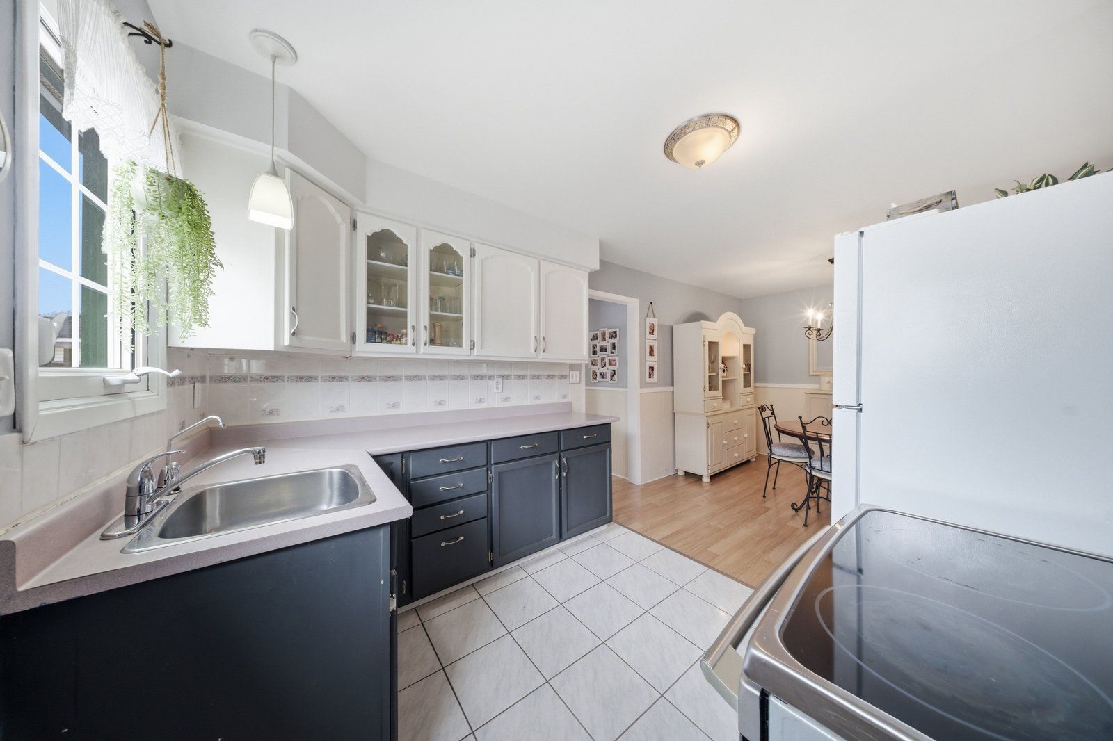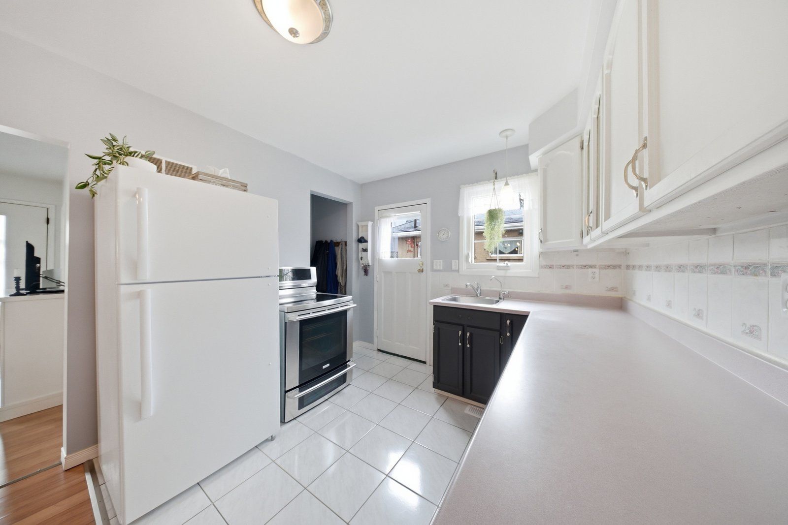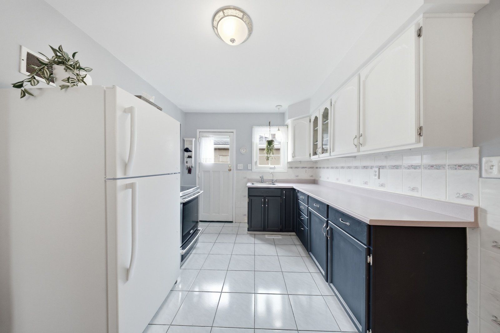 • Spacious eat-in kitchen with two-tone cabinetry and side entrance.