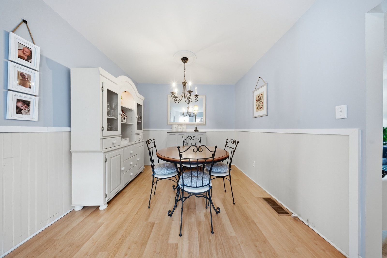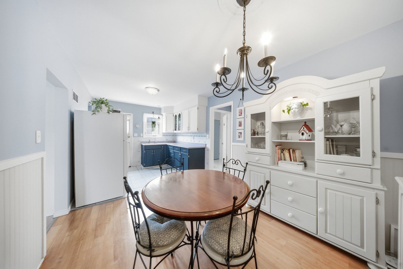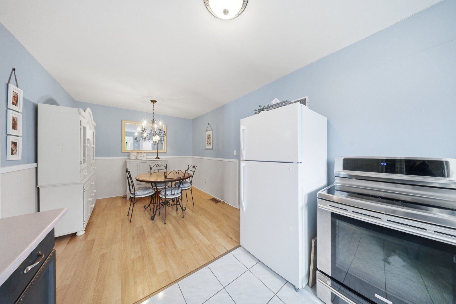 • Spacious eat-in kitchen with two-tone cabinetry and side entrance.