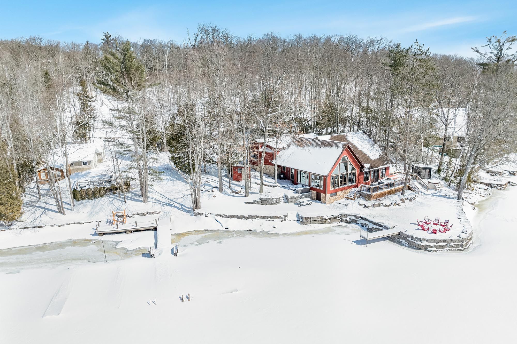 • Over 2 acres with two garages, dock system, and expansive deck.