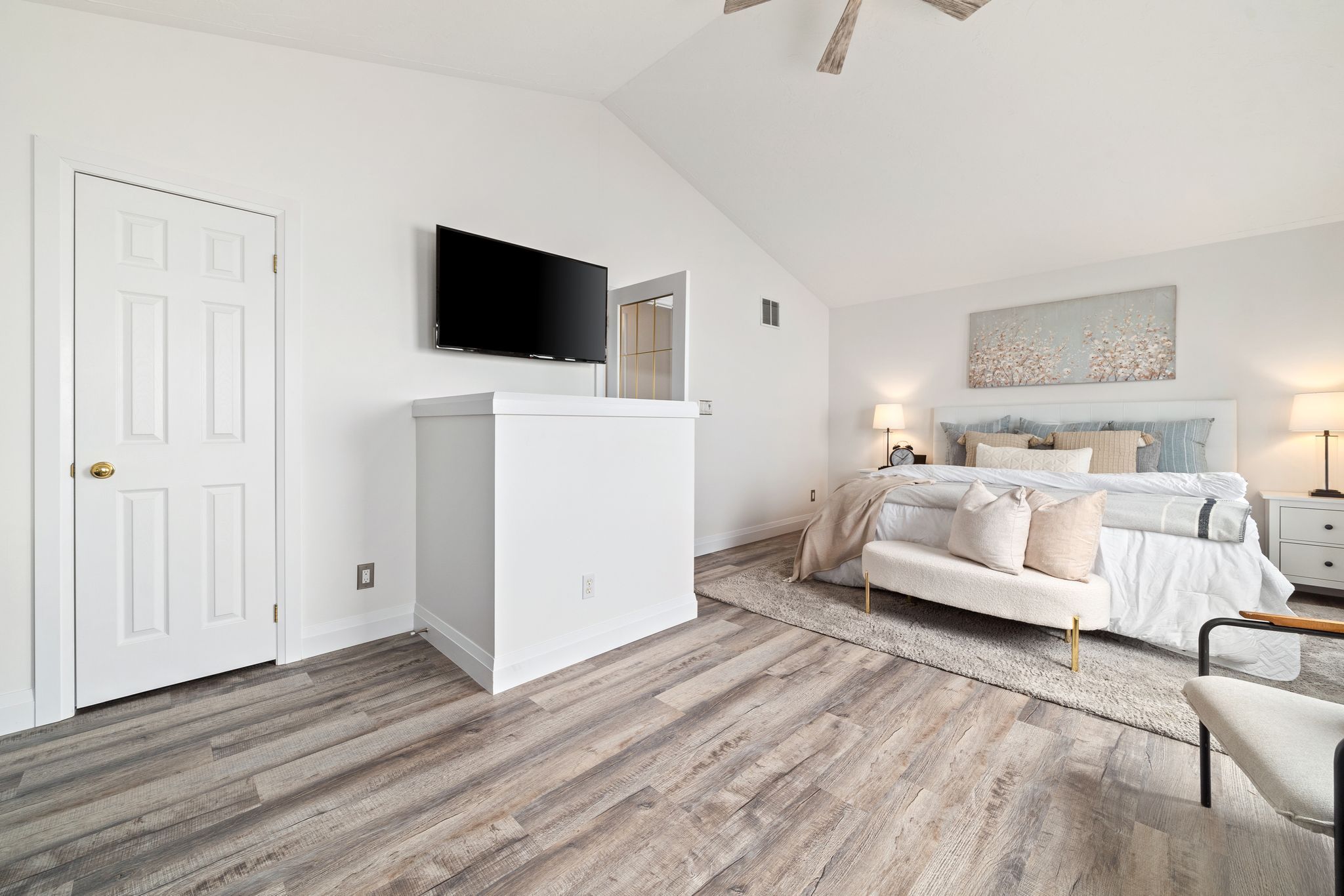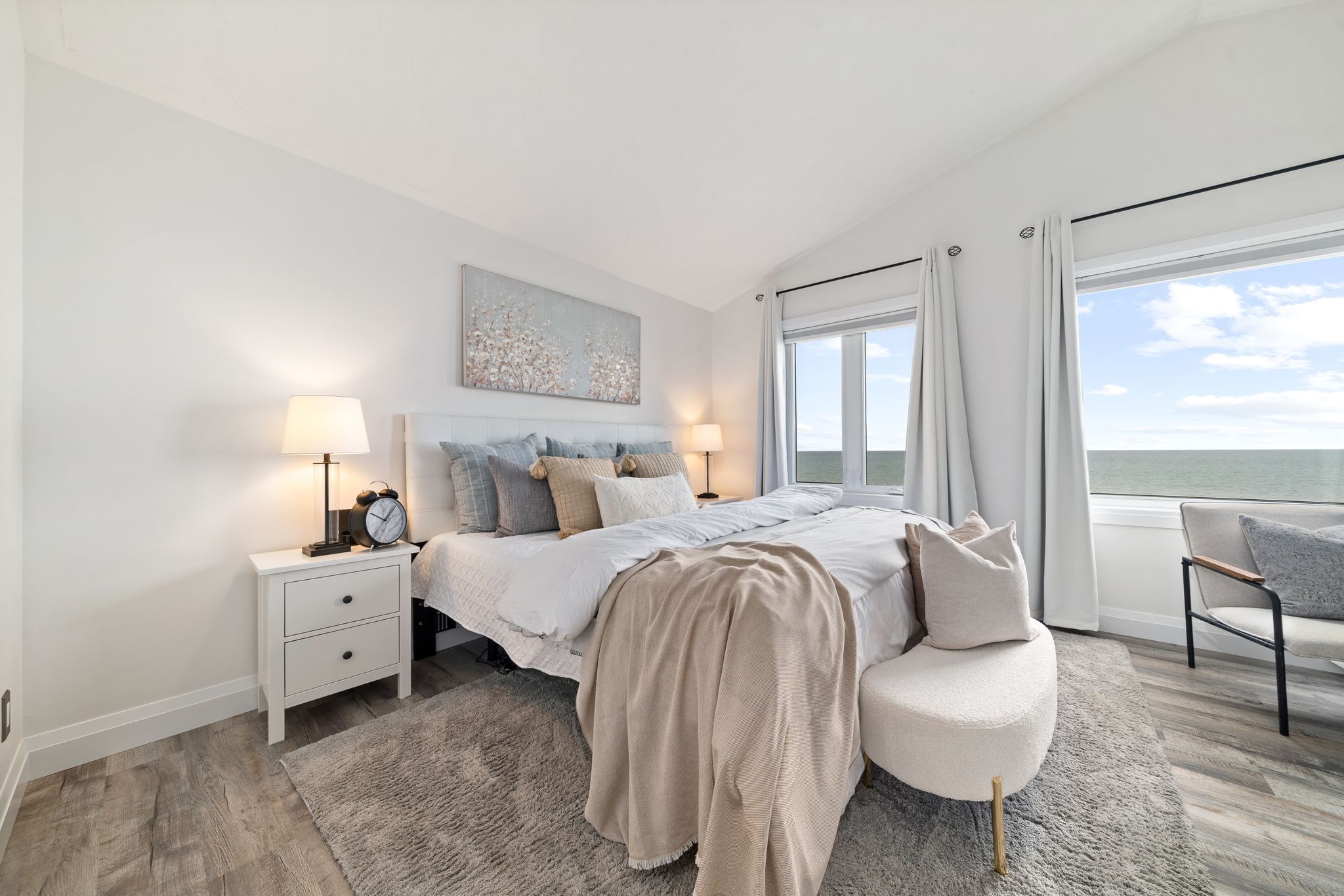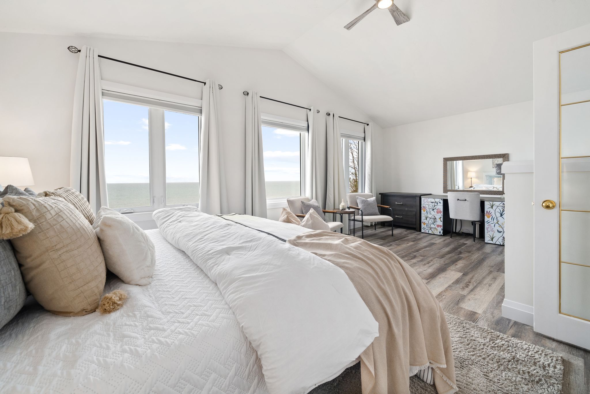 • Spacious primary bedroom with lake views and vaulted ceilings.