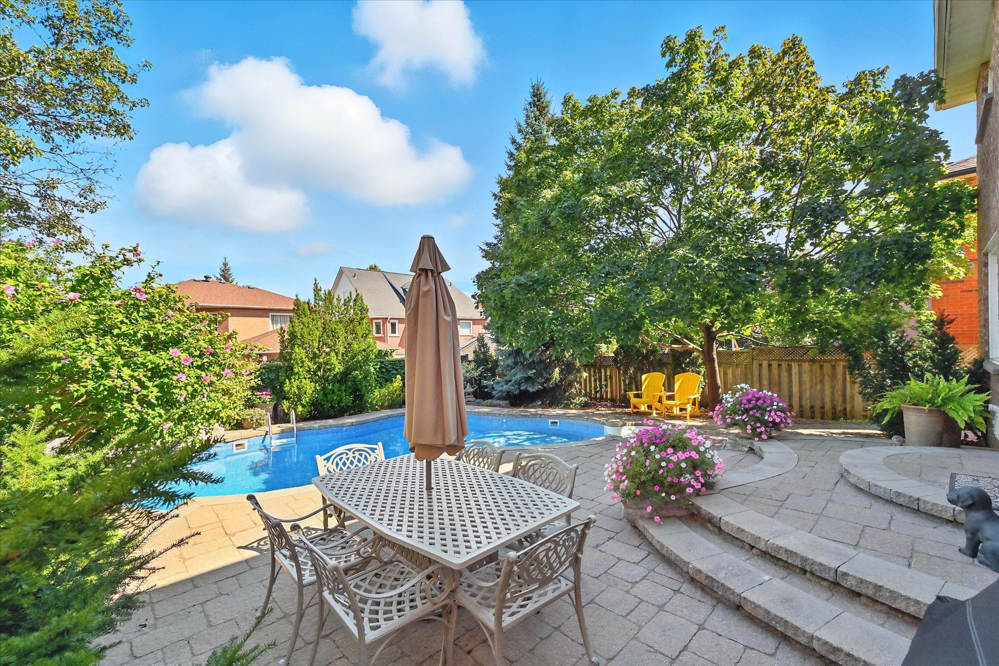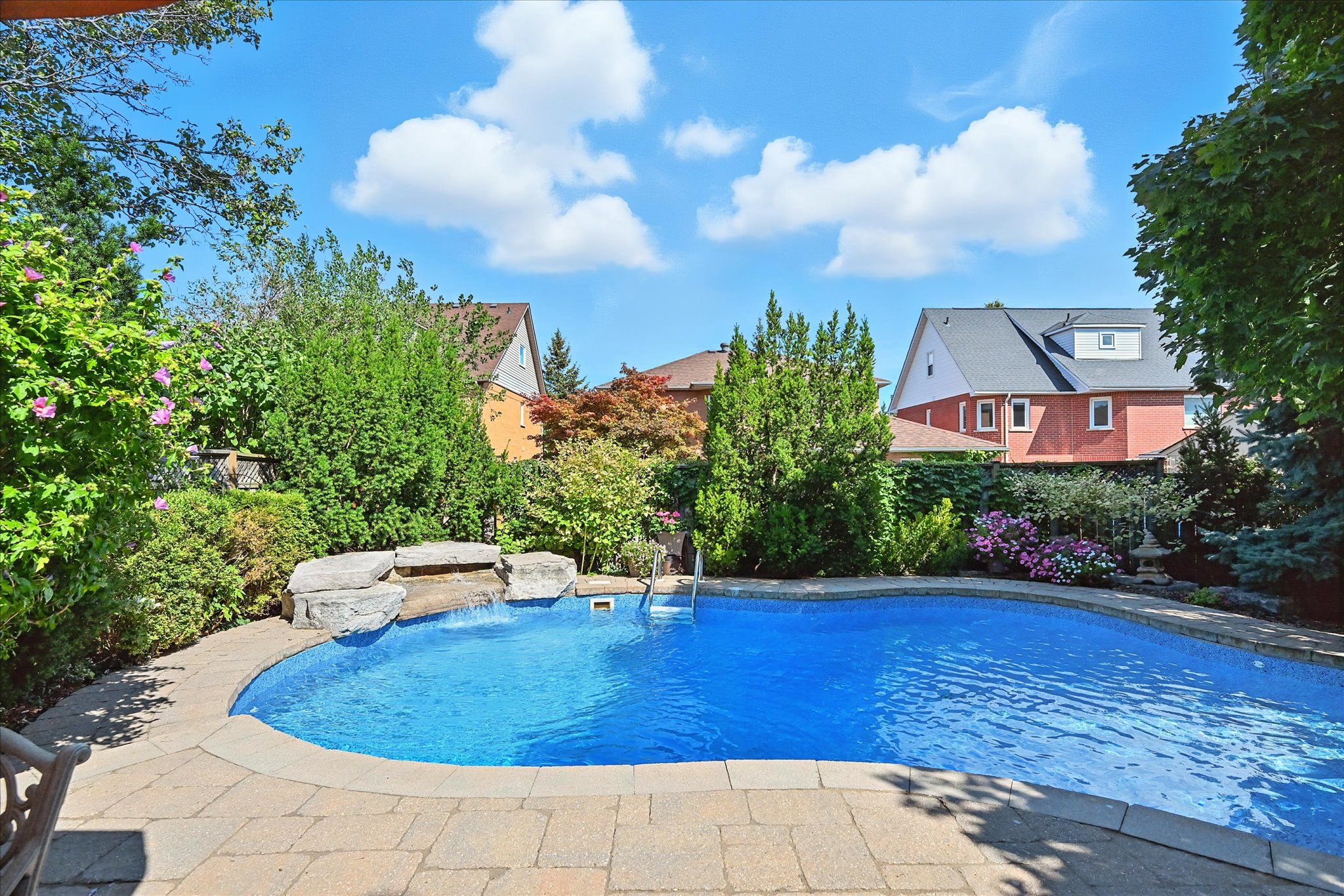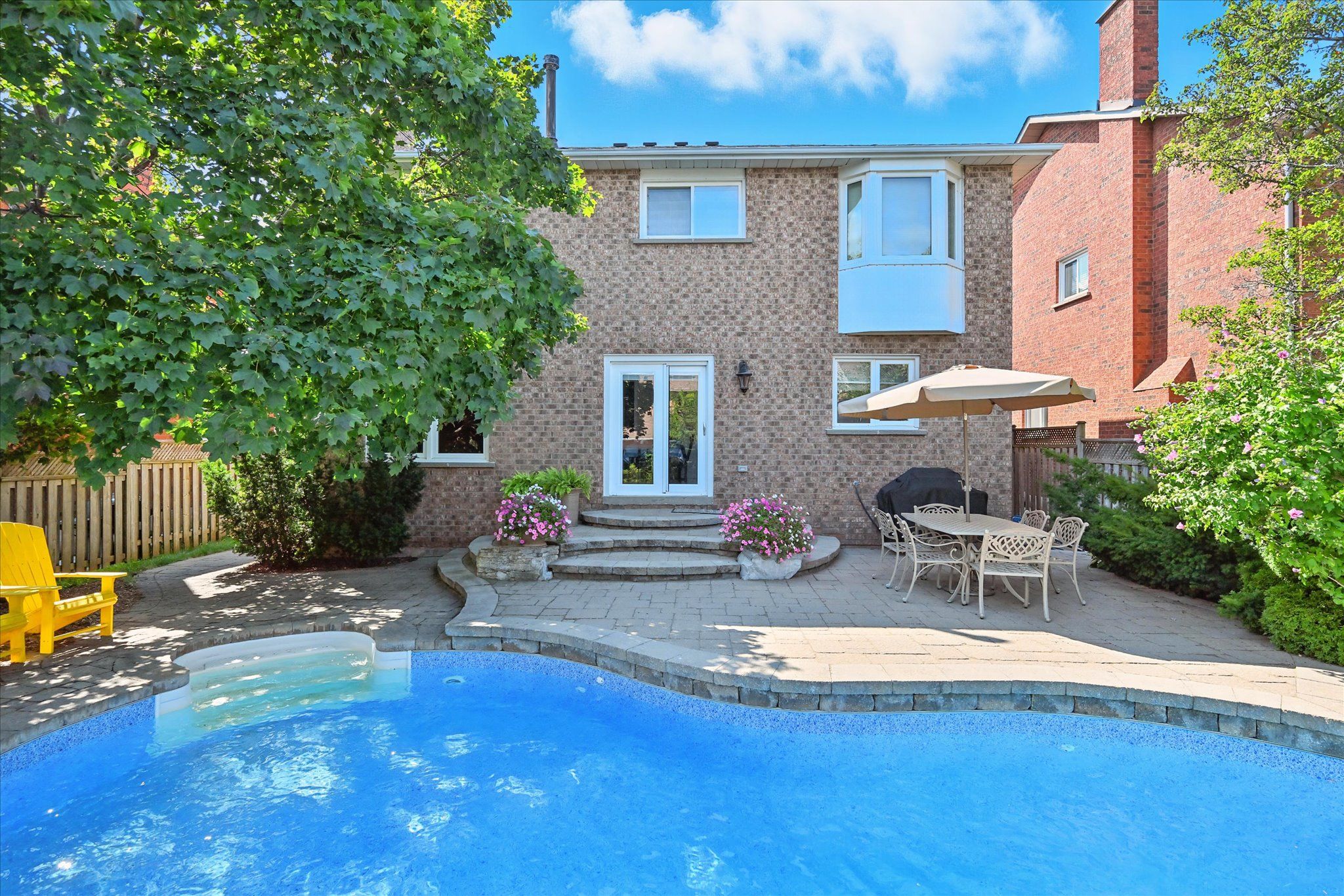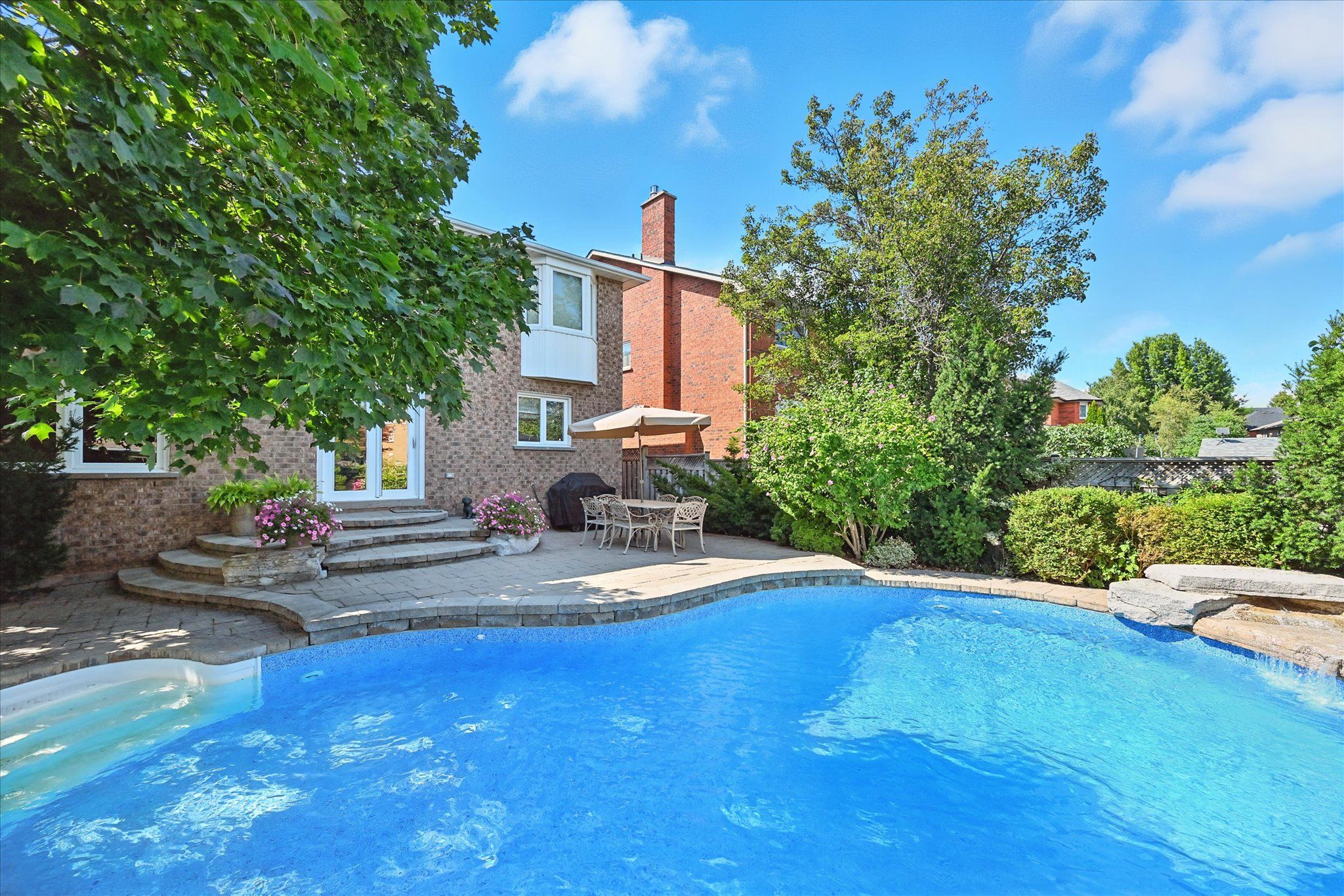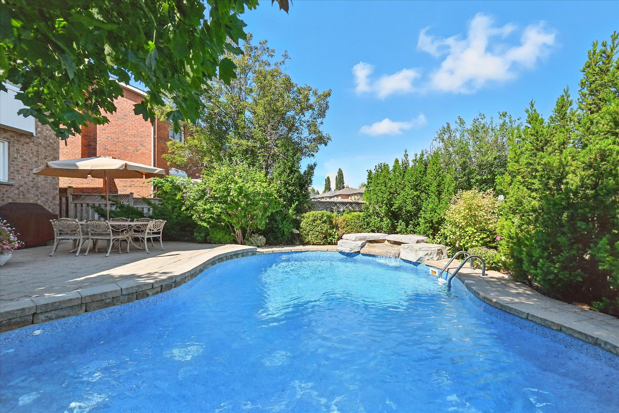 Sought-after river oaks! Quiet, family-friendly street! Welcome to 44 inverhuron trail - an exceptionally well-maintained greenpark-built five-bedroom executive residence thoughtfully designed for comfortable, modern family living. The main level offers elegant open-concept living and dining areas, an inviting family room with a classic brick woodburning fireplace, powder room, and convenient laundry room with direct garage access. The renovated kitchen features granite countertops and flows seamlessly into the bright breakfast area with a large pantry and walkout to the patio. Upstairs, the oversized primary retreat boasts maple hardwood flooring, a walk-in closet plus secondary closet, and a spa-inspired five-piece ensuite complete with double sinks and a relaxing soaker tub. Four additional bedrooms and a well-appointed four-piece bathroom complete the upper level, offering ample space for growing families. The partially finished basement further expands your living space with a versatile recreation area featuring a cozy gas fireplace, three-piece bathroom, and plenty of storage. Additional highlights include extensive maple hardwood flooring, crown moldings throughout the main level, beautifully updated kitchen and bathrooms, two fireplaces, and a two-car attached garage with newer doors and convenient backyard access. Step outside to an incredibly private, low-maintenance backyard oasis, showcasing a 22' x 29' inground heated pioneer saltwater pool with waterfall, stunning natural stone patios, and beautifully landscaped gardens - an exceptional setting for summer entertaining and family enjoyment. Ideally located just steps to holy trinity catholic secondary school and river oaks community centre, and close to parks, extensive trail network, top-ranked schools, shopping, dining, hospital, and everyday amenities. A rare opportunity to own a truly turnkey family home in one of river oaks most desirable locations. This is the lifestyle you've been waiting for!