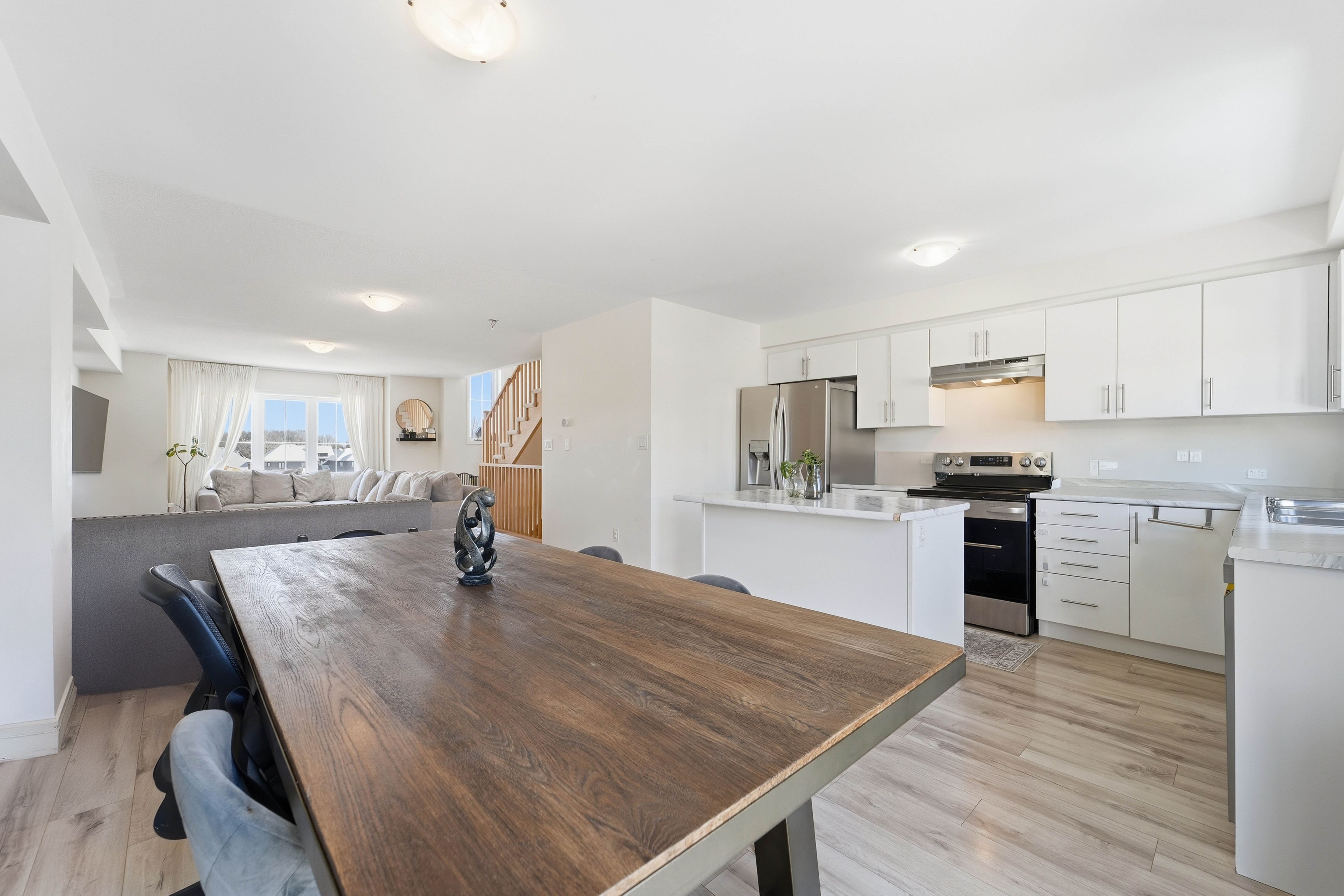 Spacious end unit townhouse loaded with multiple smart features on a cul de sac with attached garage and parking for 4 vehicles. Entering from the front door monitored by a google home doorbell takes you into your at home office or family room or guest/in law bedroom. On the second floor is an open concept living, dining and kitchen with walk out to a large deck for bbqing and outdoor entertaining in the summer months. The parking/rear area has a smart wifi camera too. Kitchen boasts ample cupboards and counter space with a centre island. Appliances include a smart fridge, smart stove and smart dishwasher you can control from your cell phone anywhere. The home has multiple storage closets and large windows throughout to let in lots of light. The bedrooms are spacious and the primary includes plenty of closet space and an updated ensuite. Two bedrooms have smart light switches. The main bath has a light up mirror on the 3rd floor and the powder bathroom is conveniently located on the second floor. This is a sought after neighbourhood close to schools, parks, shopping and recreation. The garage even has charging station for an electric vehicle and a smart/wifi enabled garage door opener with a camera and remote open/close feature. Includes all stainless steel smart appliances, washer and dryer, electric light fixtures and window coverings. The tarion warranty is included with this home giving you peace of mind for years to come. Remember if you love it, you better put an offer on it!!