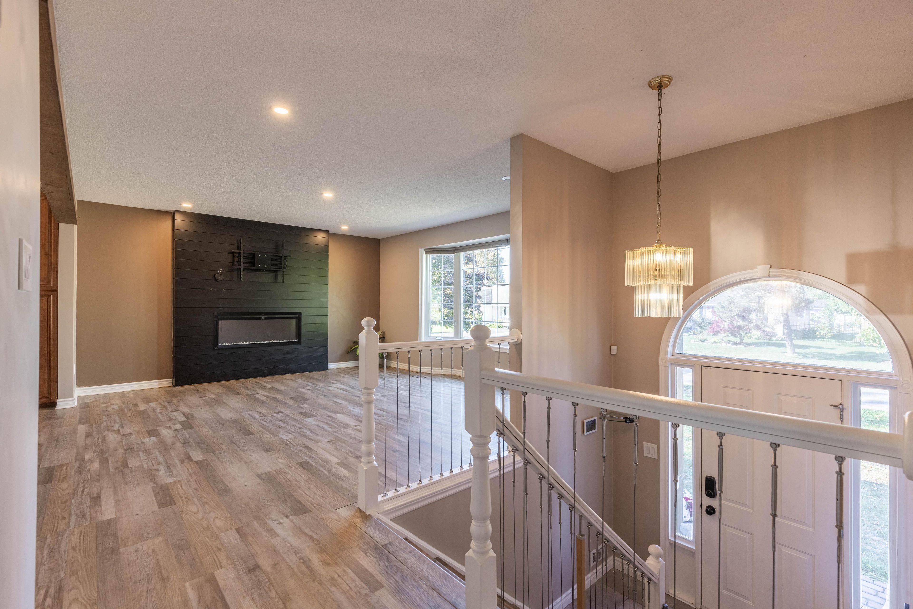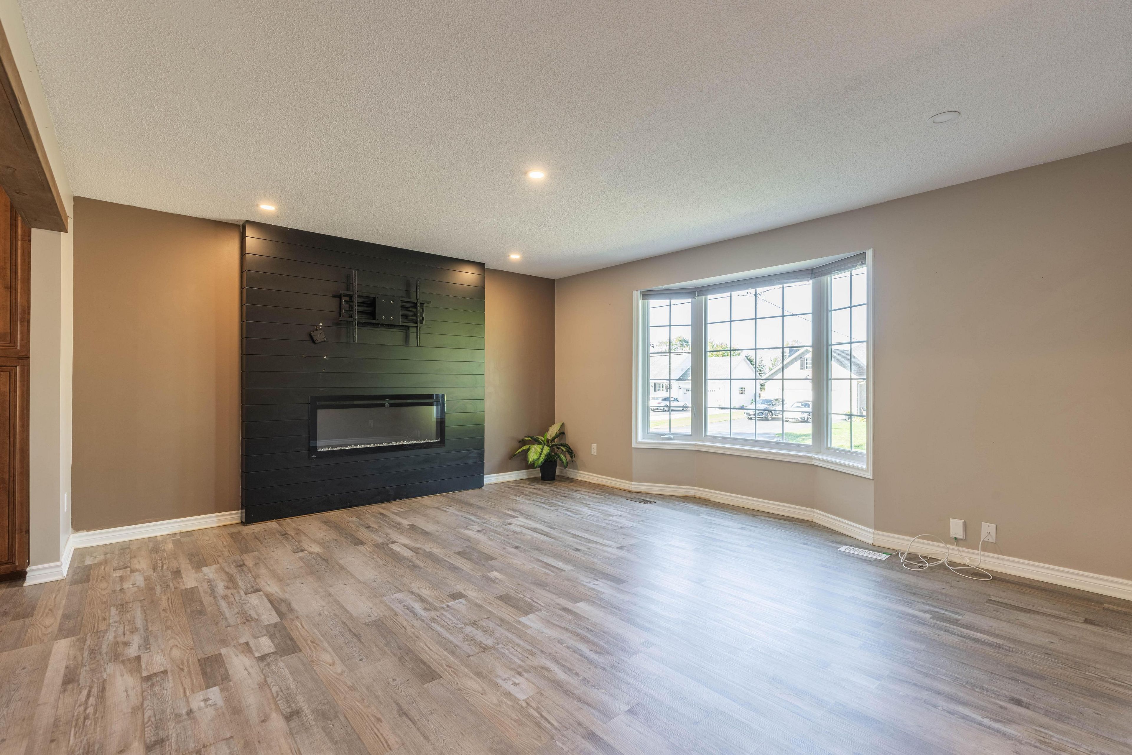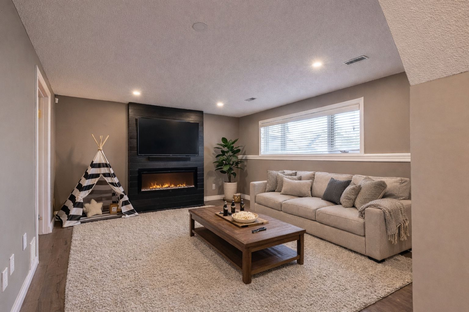 • Bright open-concept living area with electric fireplace and stylish kitchen.