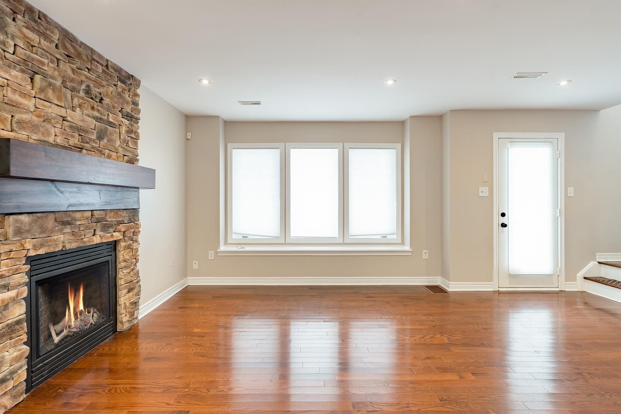 • Bright open-concept main level with natural light and cozy gas fireplace.