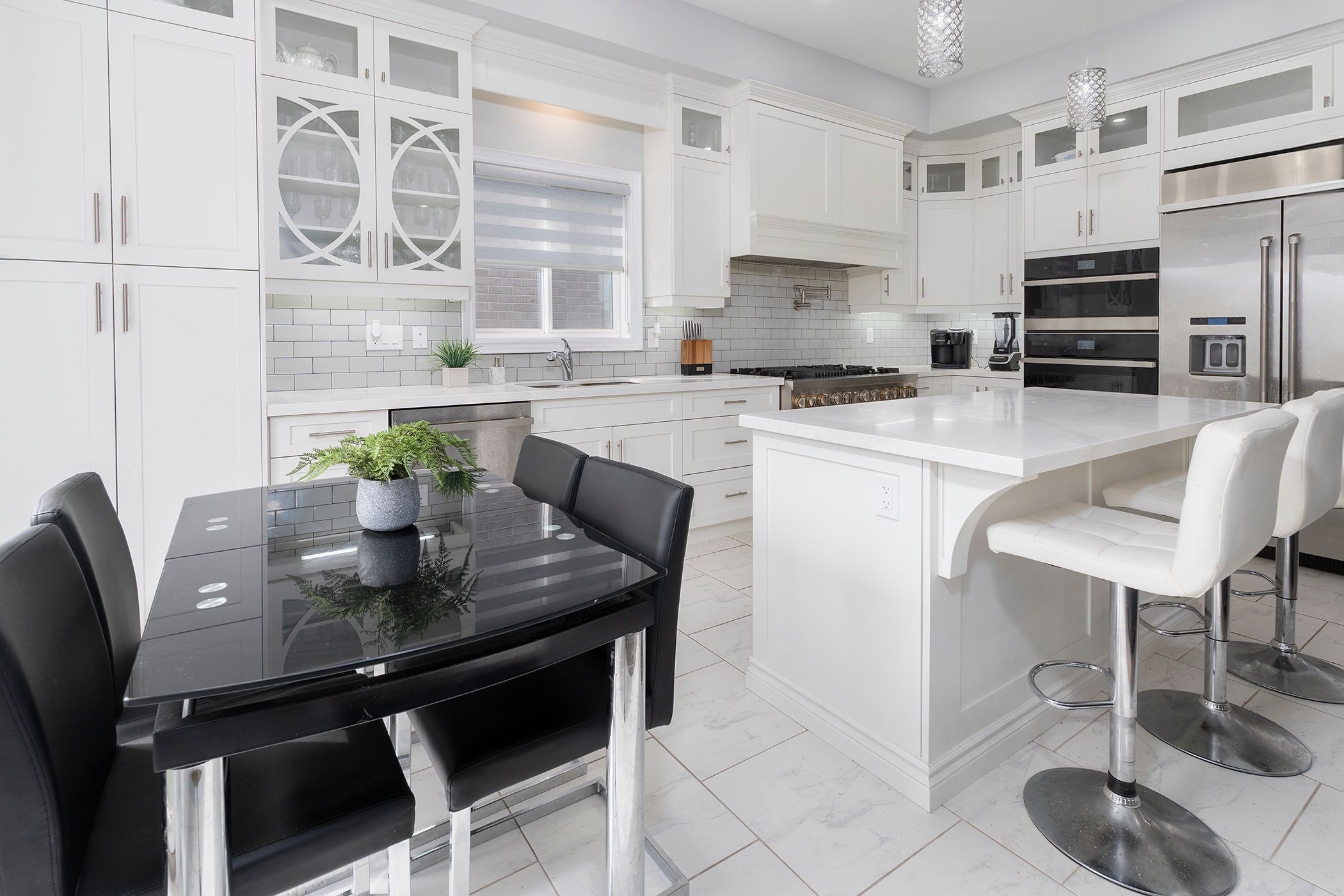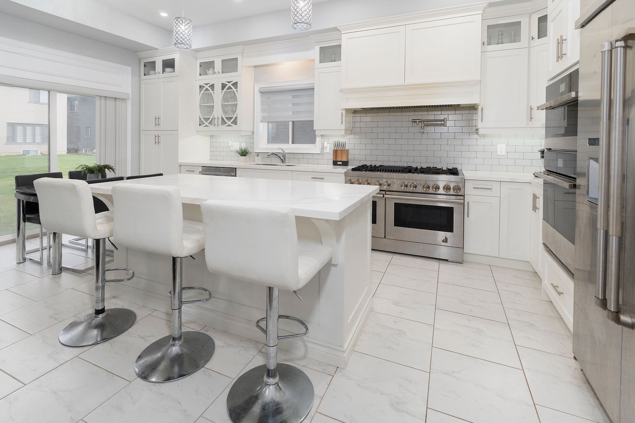 • Chef's kitchen with high-end stainless steel appliances and large island.