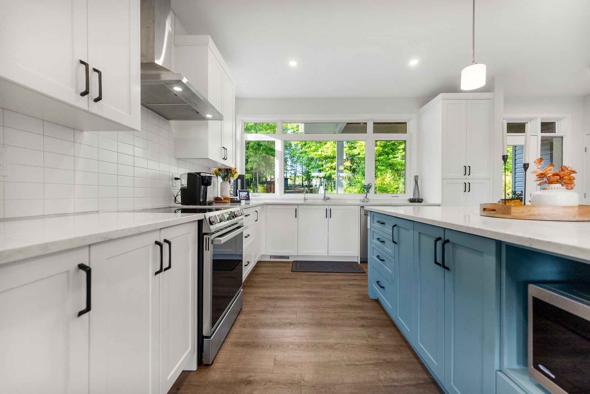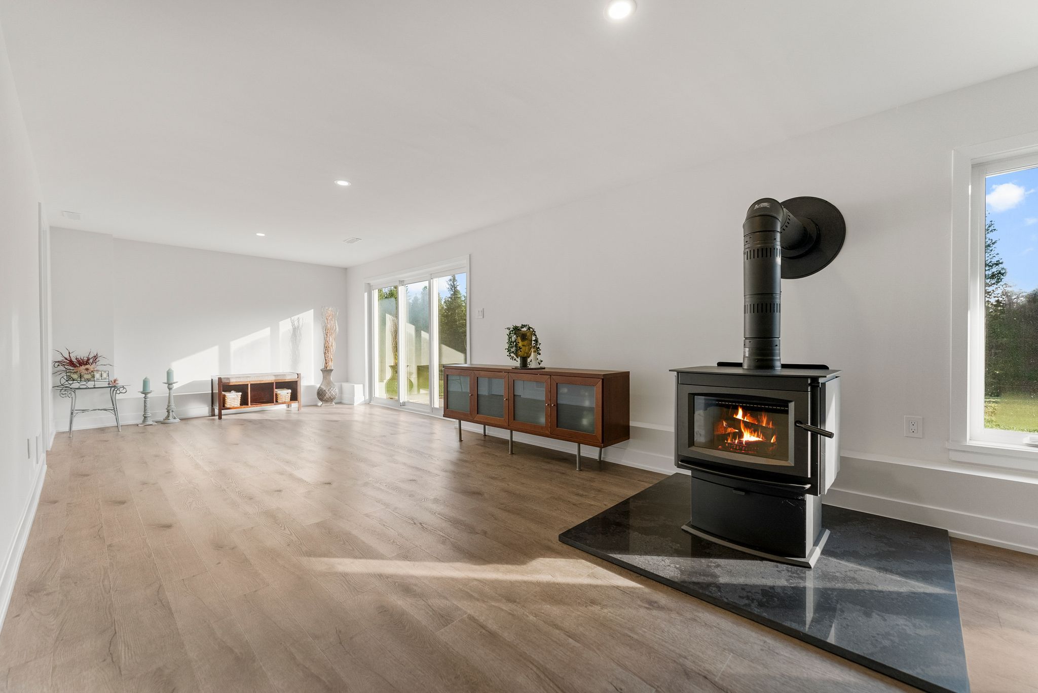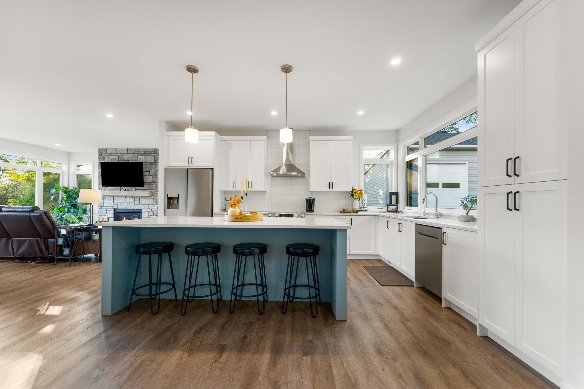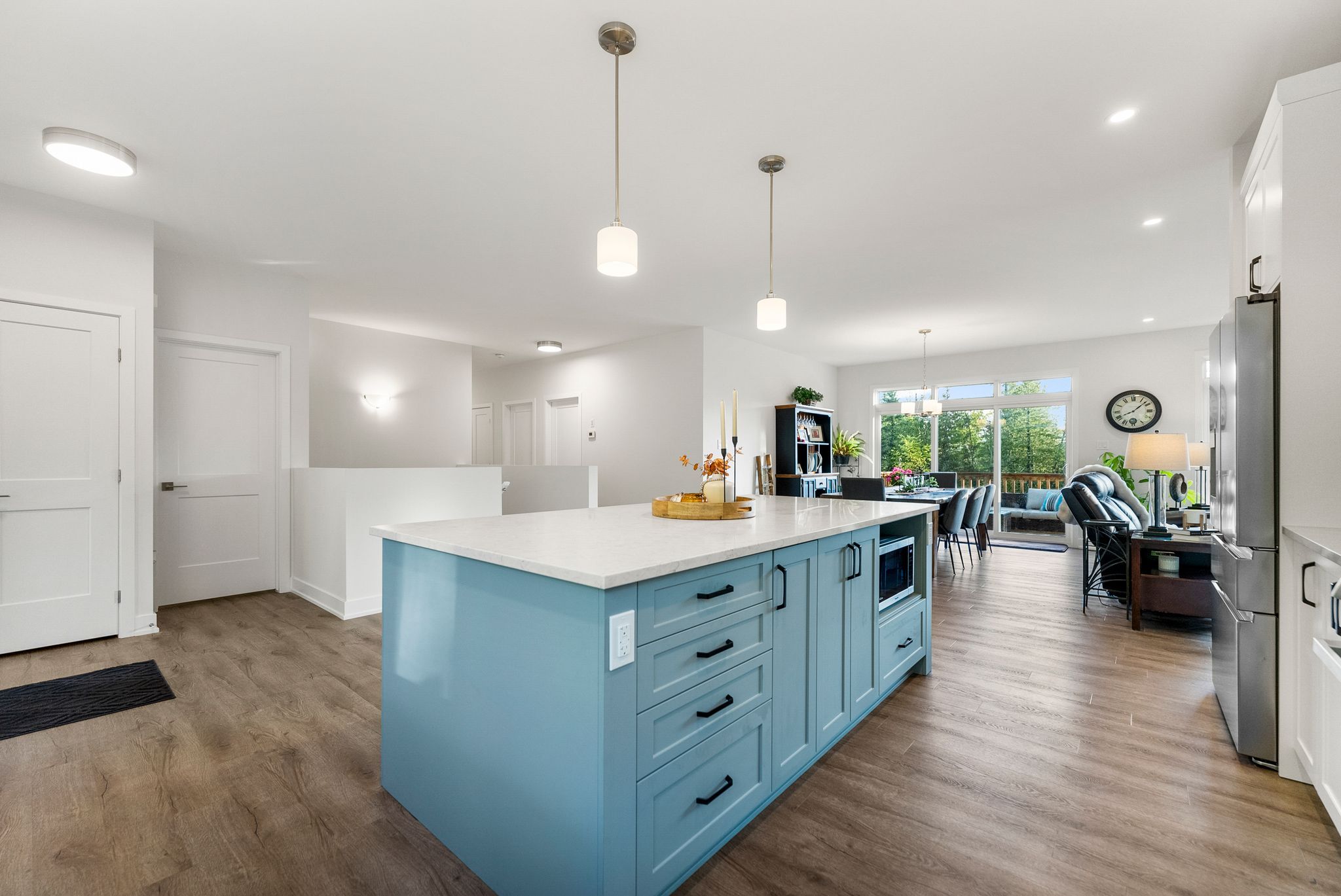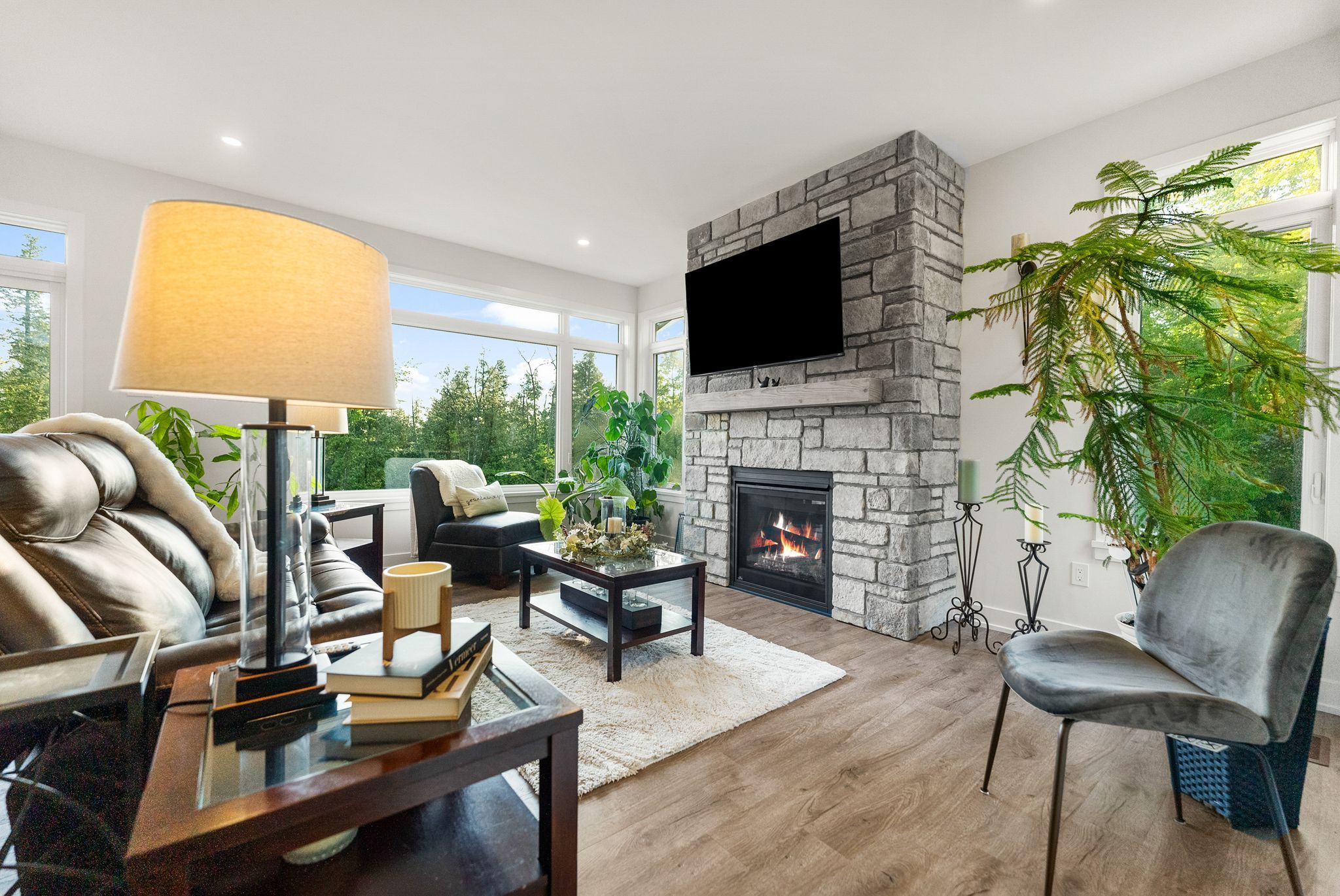 • Open-concept kitchen with quartz countertops and a cozy fireplace.