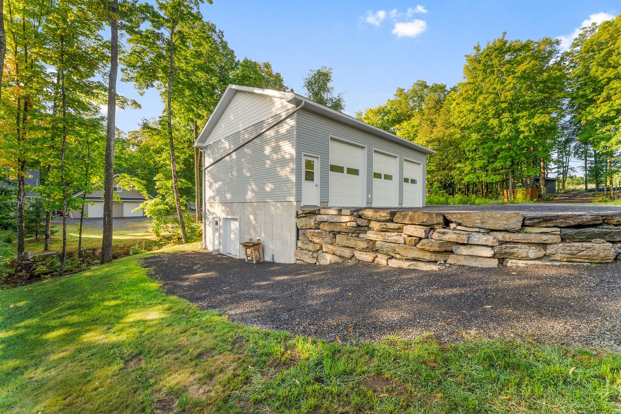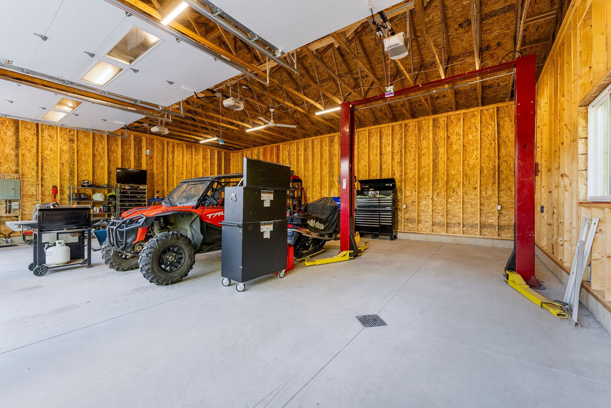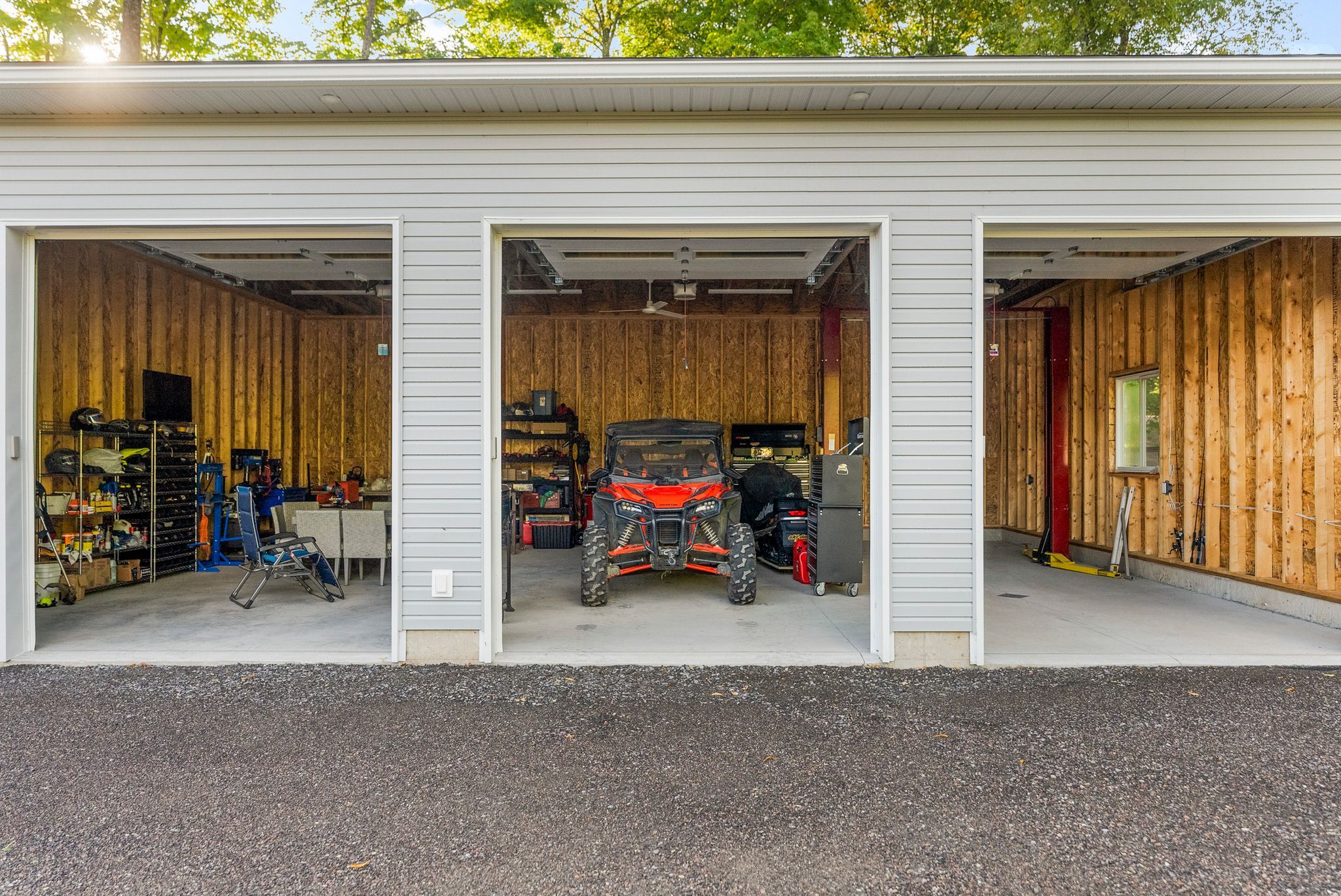 • Detached 3-car garage with high doors and included hoist for vehicles.