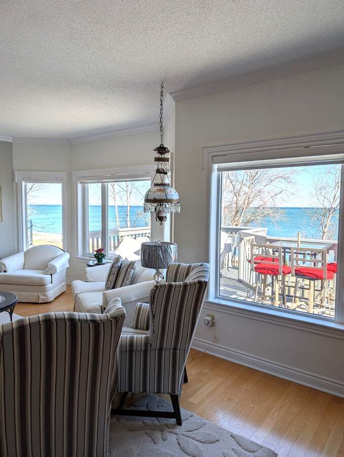 For more info on this property, please click the brochure button. Luxury lakefront, spacious freehold end unit townhome, bungaloft 1. 5 stories, in very desirable enclave. A panorama of lakeshore views of the golden horseshoe from toronto to niagara-on-the-lake. Sunrise and sunset views over lake ontario from your home, garden and beach. 3 bedrooms with ensuite, walk in closet, 1 powder room, 2 gas fireplaces, large great room with bright all glass fronting to the lake. Granite counters throughout with cook's delight kitchen, stainless steel appliances, eat-in dinette with sliding doors to the large deck (al fresco dining) and the lake. Hardwood floors, high ceilings (cathedral in great room to loft), separate dining room. Staircase to bright large lower level family room with fireplace and walk out w panoramic views of garden and lakefront. Additional bedroom with ensuite and large workroom/office, very large utility room plus separate wine/storage room. Other features include: c/air, c/vac, california shutters, cambridge fiberglass/asphalt shingles w 30 year warranty, garage door opener, video doorbell, anti-critter meshed soffits, leaf filter gutter system, security garden light, nest thermostat and smoke detector, co2 detector, garage ev car charger, inground irrigation system, main floor laundry, inside entrance to garage, direct tv. This truly exceptional home is finished with crown molding on primary ceilings, windows, and wall columns. Short stroll to town, marina and lakefront parks including leash free and tennis, with conservation area and bruce trail. The town offers great shopping, large new hospital, all medical practitioners, library, secular and private elementary and secondary schools, both town and ymca recreation centres and restaurants.