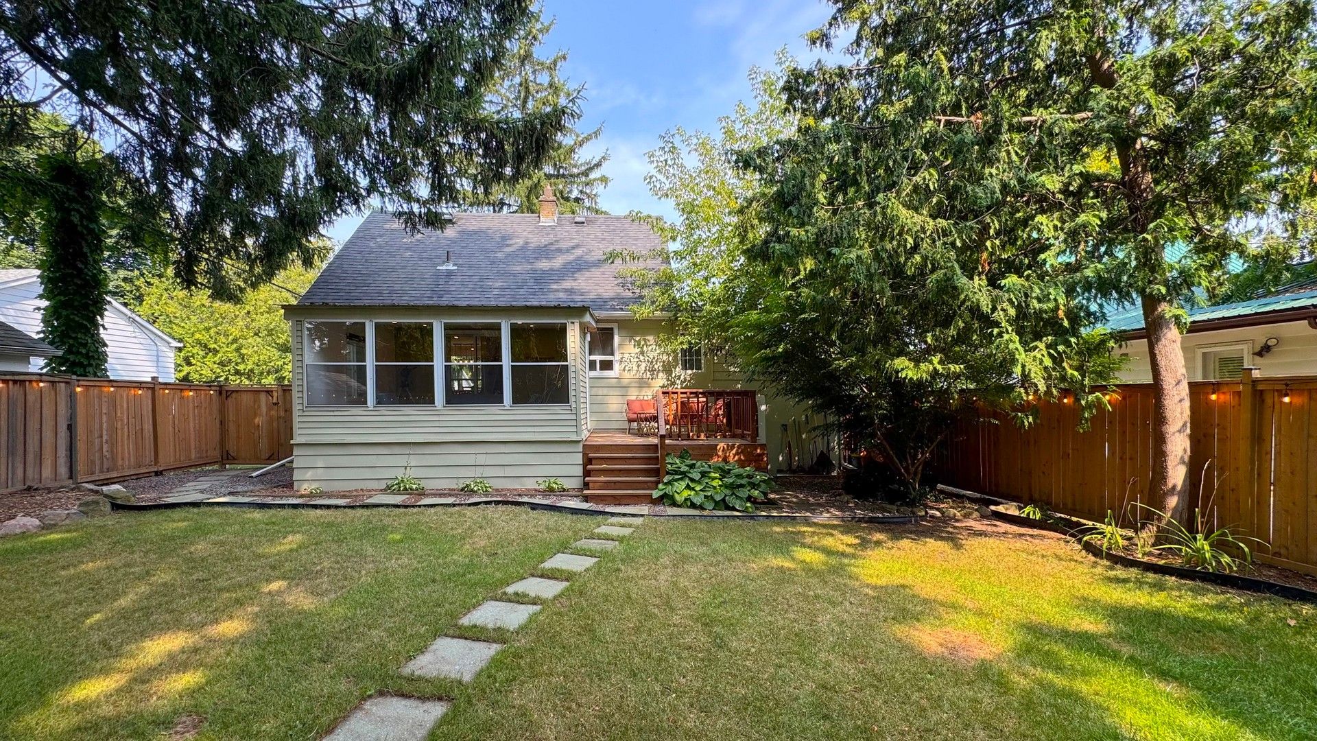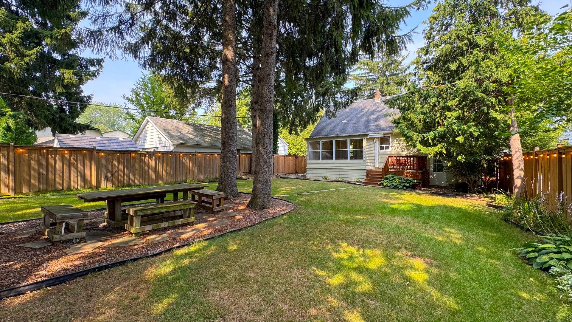 • Private backyard oasis with new deck, fenced yard, and sprinkler system.