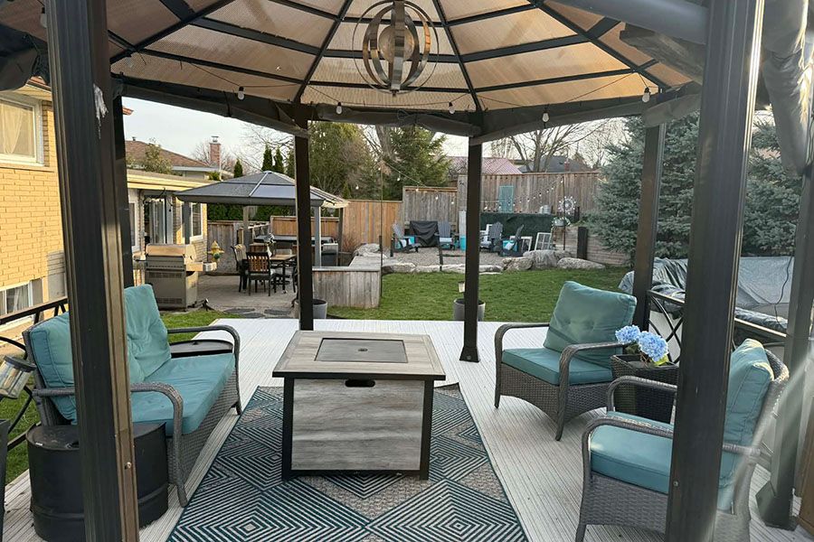 • Fully fenced backyard includes a pool, hot tub, and space for outdoor activities.