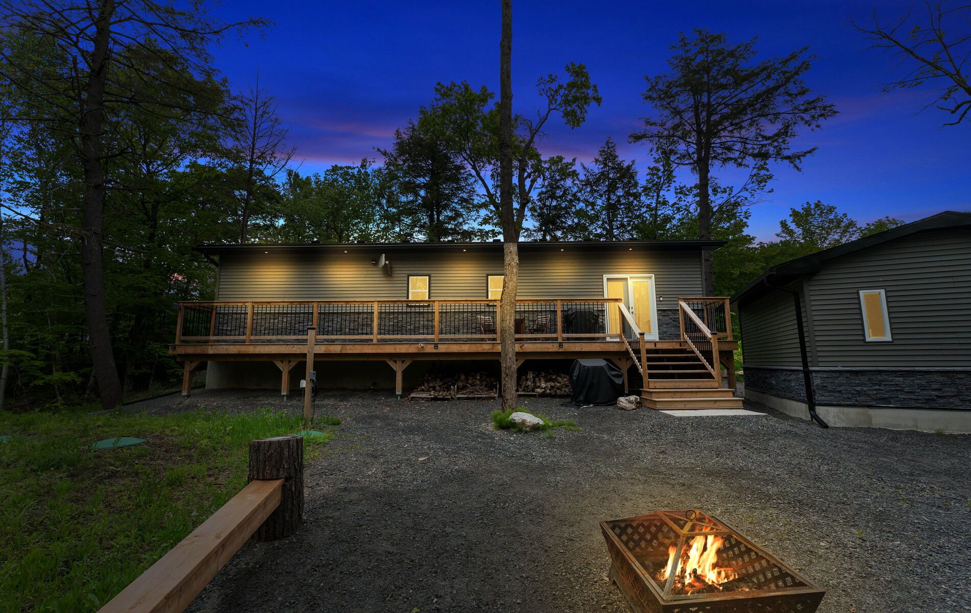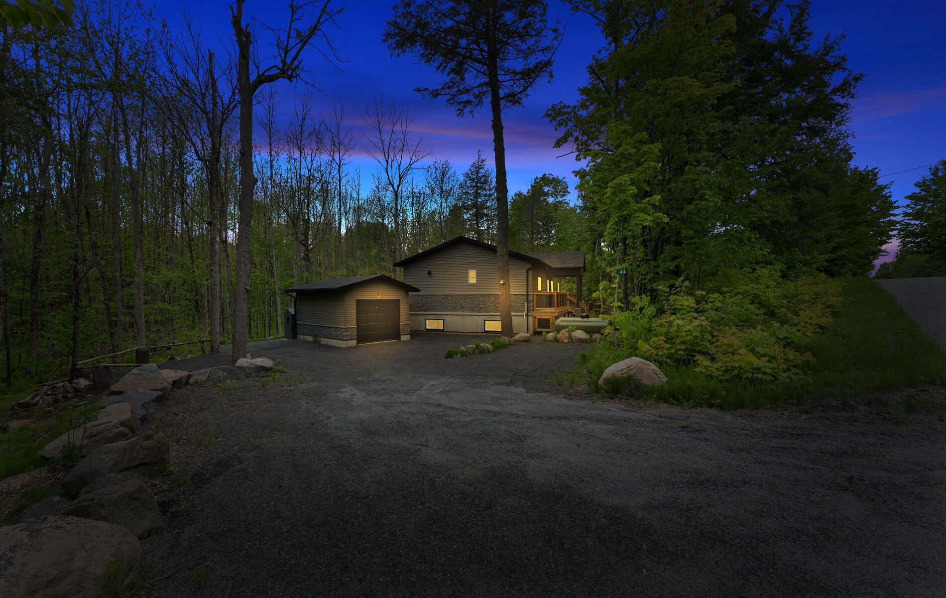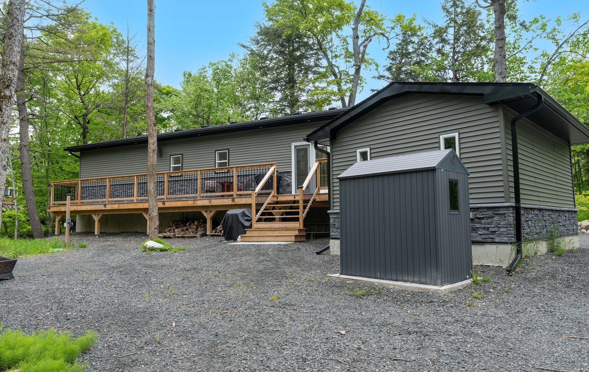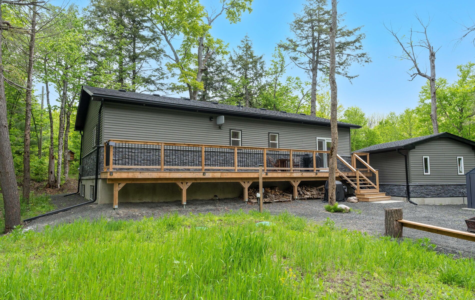 44 sunnyshore park drive - a custom-built home just steps from maplewood beach completed in 2023, this beautiful custom home sits on just over an acre and offers quality, comfort, and energy efficiency throughout. Built with an icf foundation, full waterproofing, and a weeping tile system, the home meets modern construction standards. It features engineered truss roof framing, spray-foam insulation in the main floor and rim joists, and an r60-rated attic. A heat recovery ventilation (hrv) system ensures clean, fresh air year-round. The exterior boasts stone skirting and a spacious ranch-style front deck with a welcoming overhang. Inside, the foyer features large-format european porcelain tiles. The open-concept kitchen is a showstopper with custom lacquered shaker cabinets to the ceiling, crown molding, under-cabinet led lighting, quartz countertops, an island with undermount sink, and a stylish italian herringbone backsplash. Soft-close, solid wood dovetail drawers and smart stainless-steel appliances-including fridge, stove, and dishwasher-complete the space. A custom live edge elm dining table is also included. Modern shaker interior doors and matte black hardware continue the high-end feel throughout. Everything is brand new (2023): septic, hvac, siding, electrical, plumbing, and framing. Located minutes from lake manitouwabing, you're close to boat launches at the manitouwabing outpost and tait's landing marina, where boat slips are also available. This is the perfect blend of lakeside living and modern luxury.