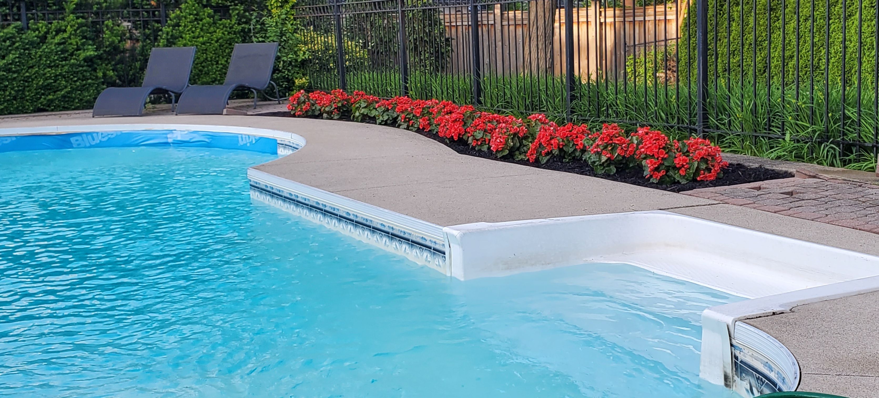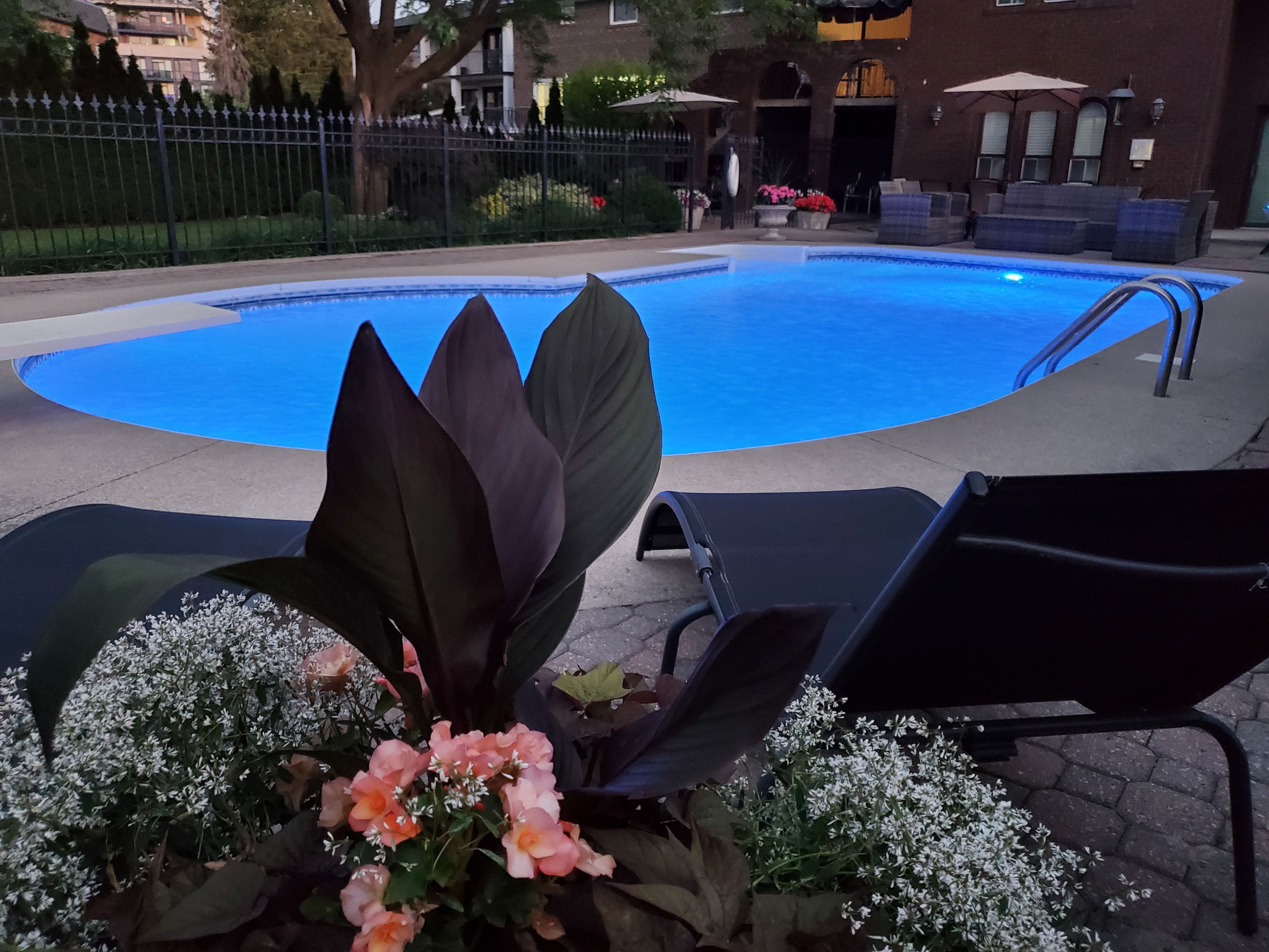 • Beautifully landscaped lot with flowers and a relaxing pool area.