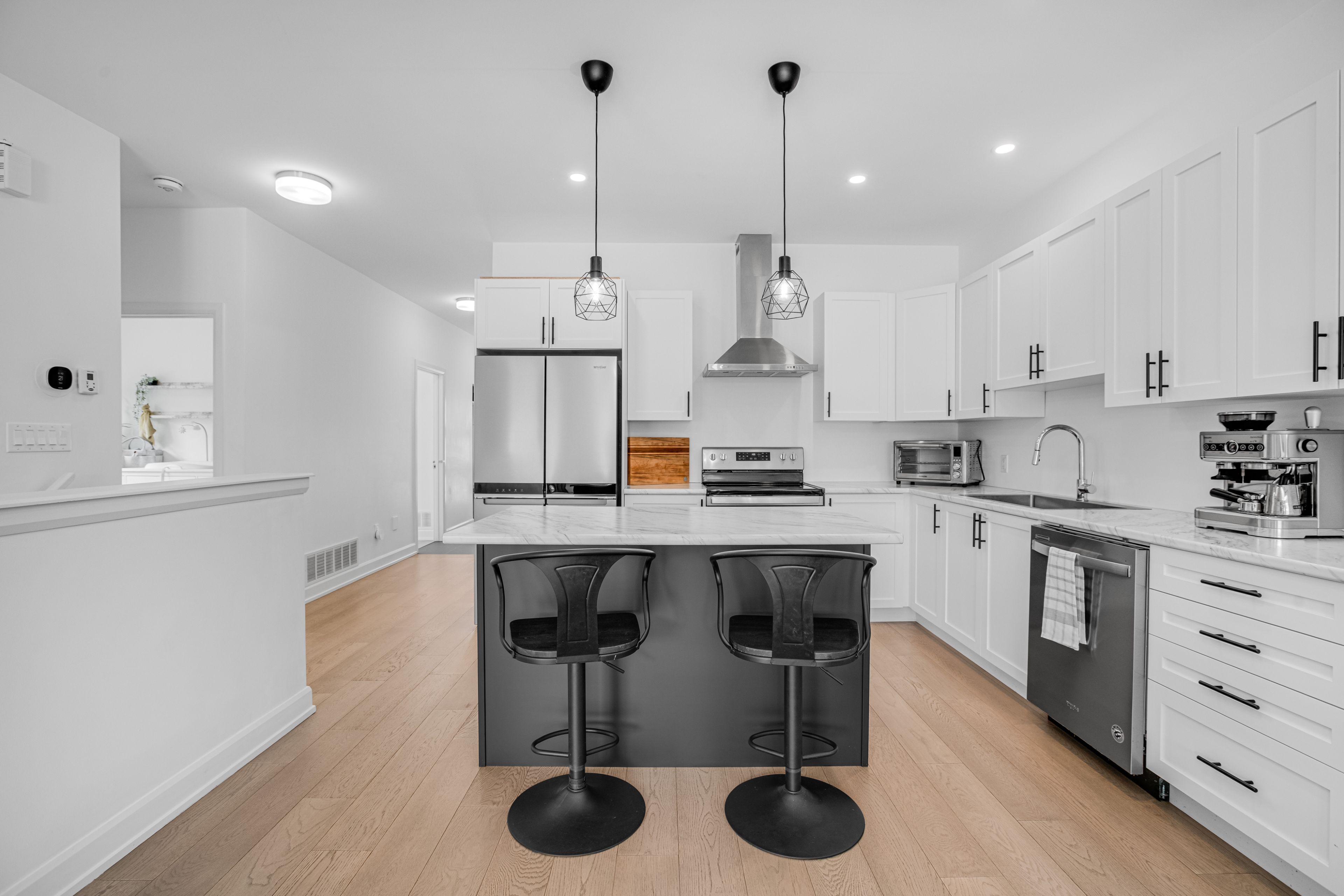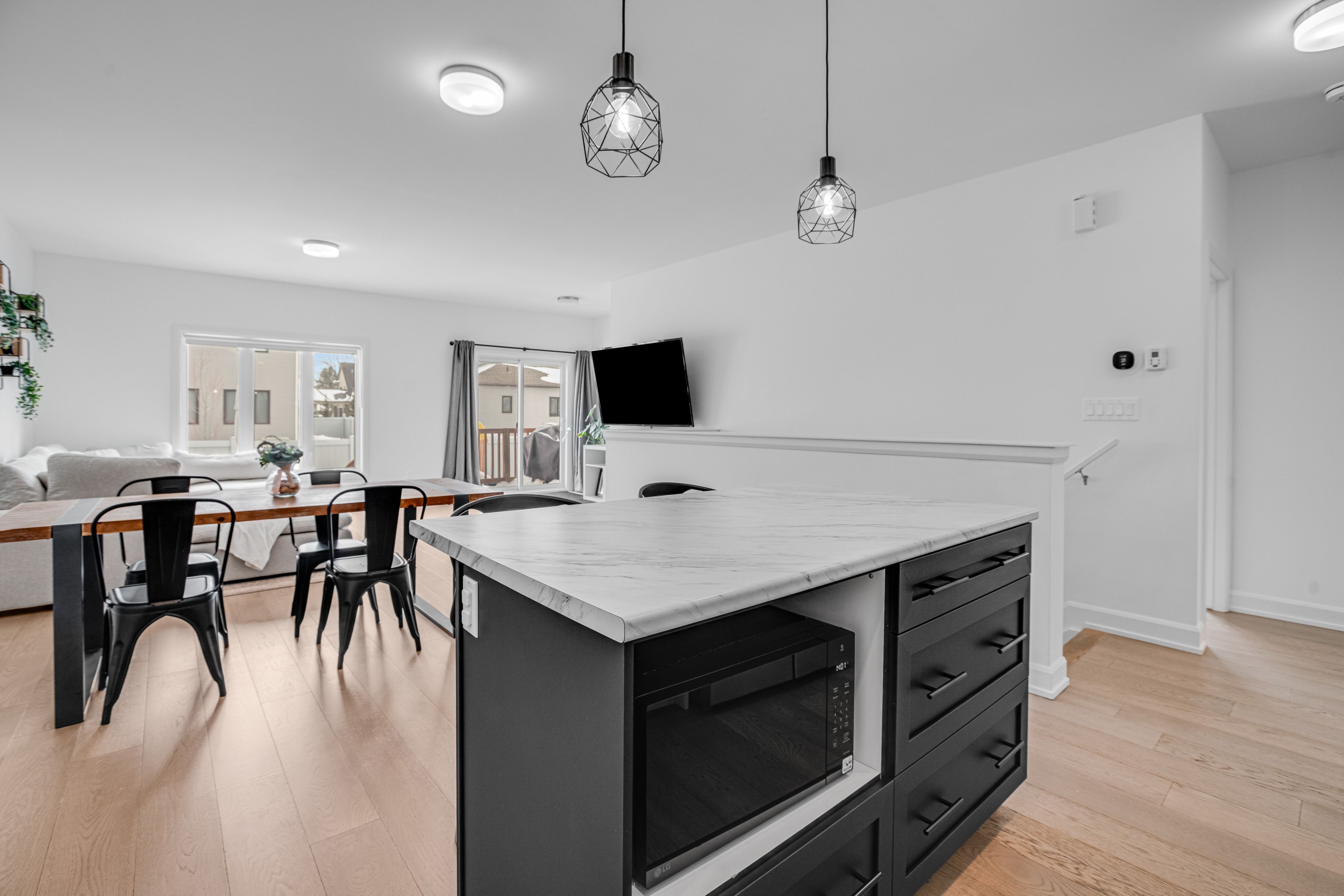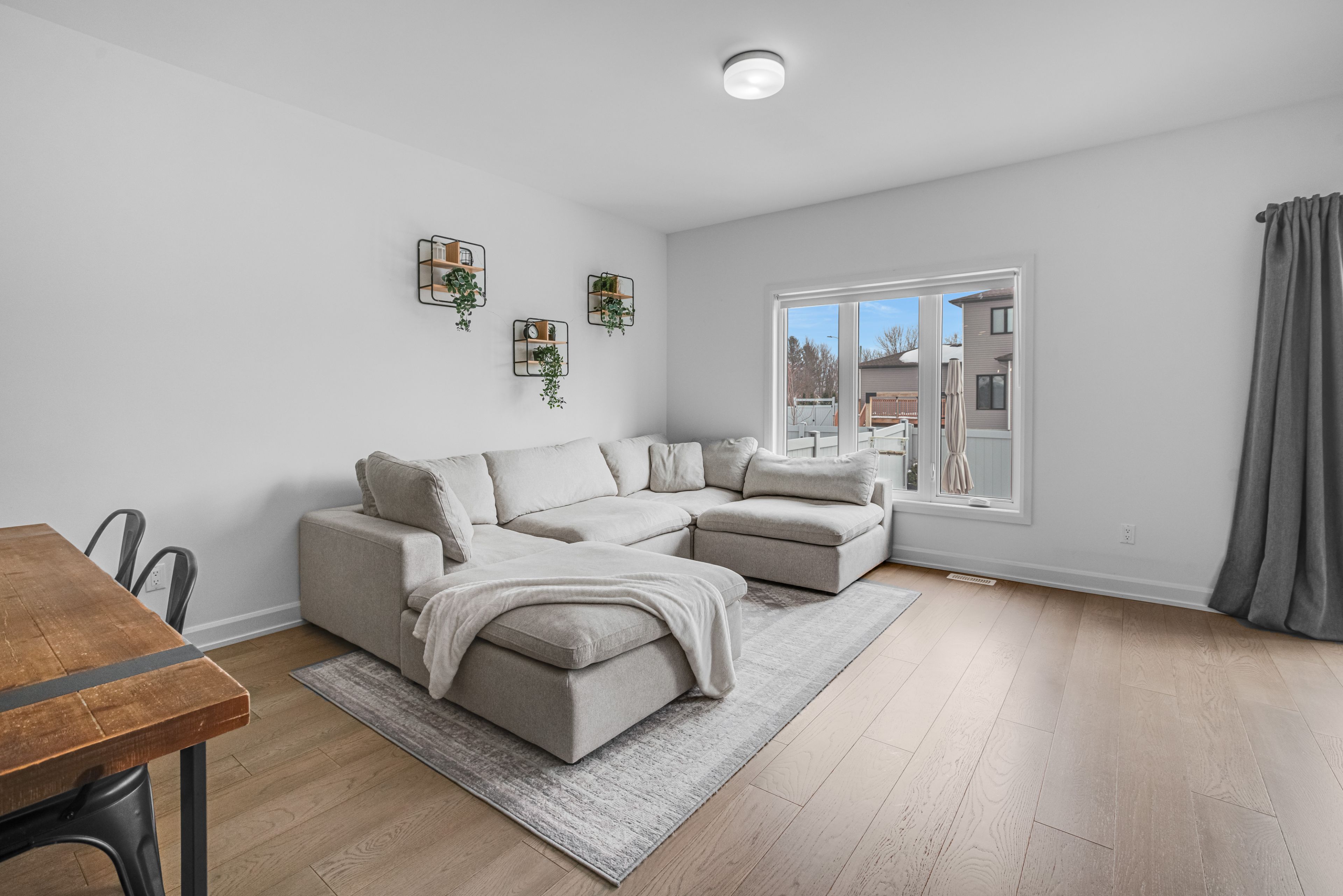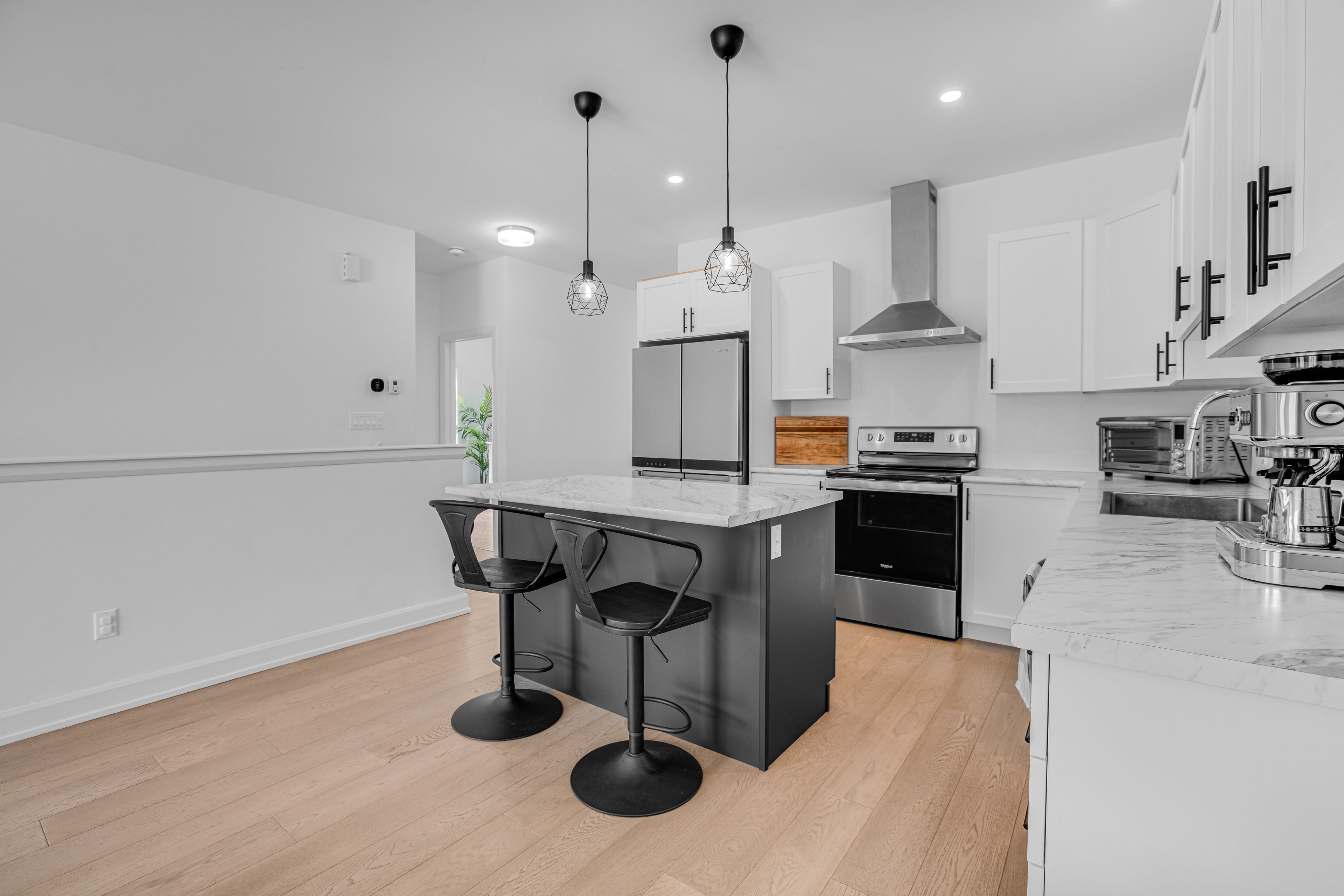 • Bright living area with 9-foot ceilings and engineered hardwood flooring.