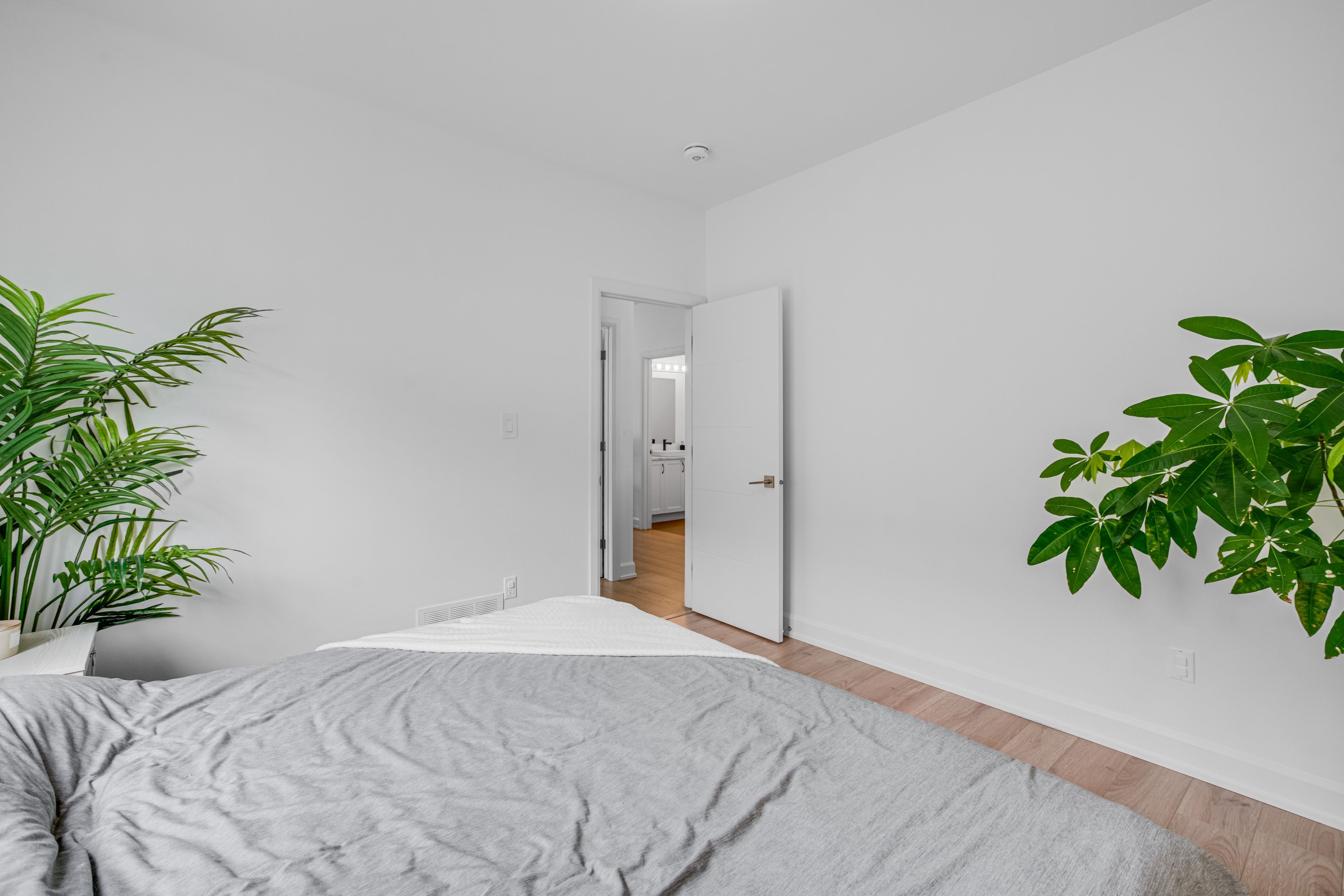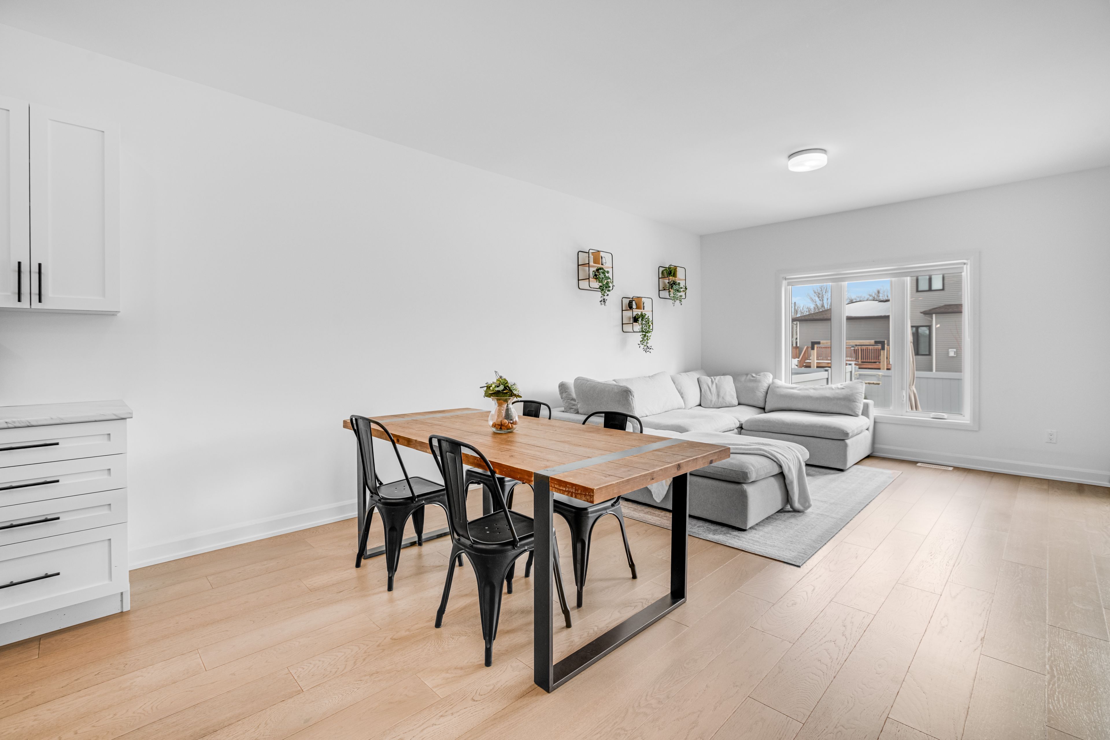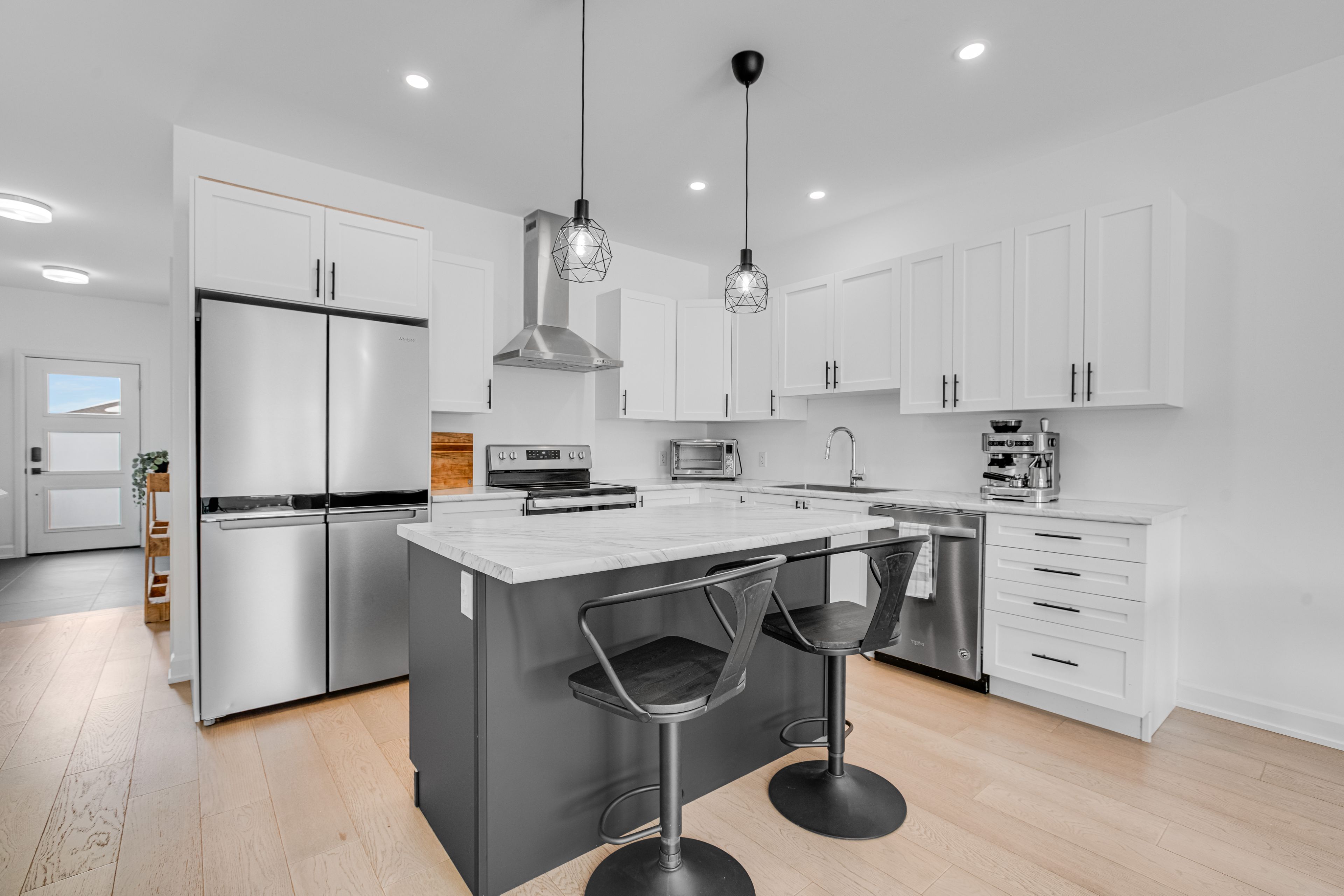 • Bright living area with 9-foot ceilings and engineered hardwood flooring.