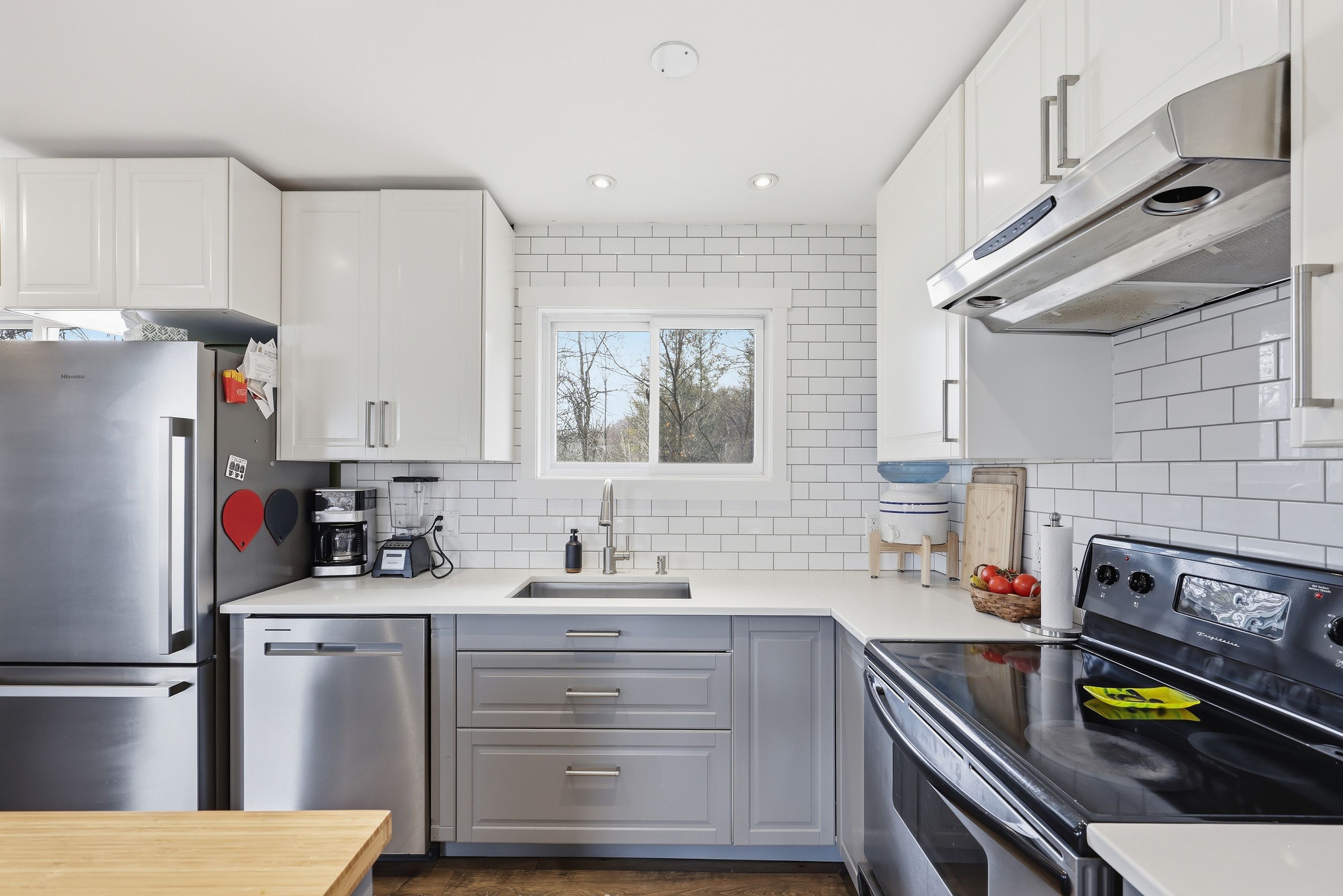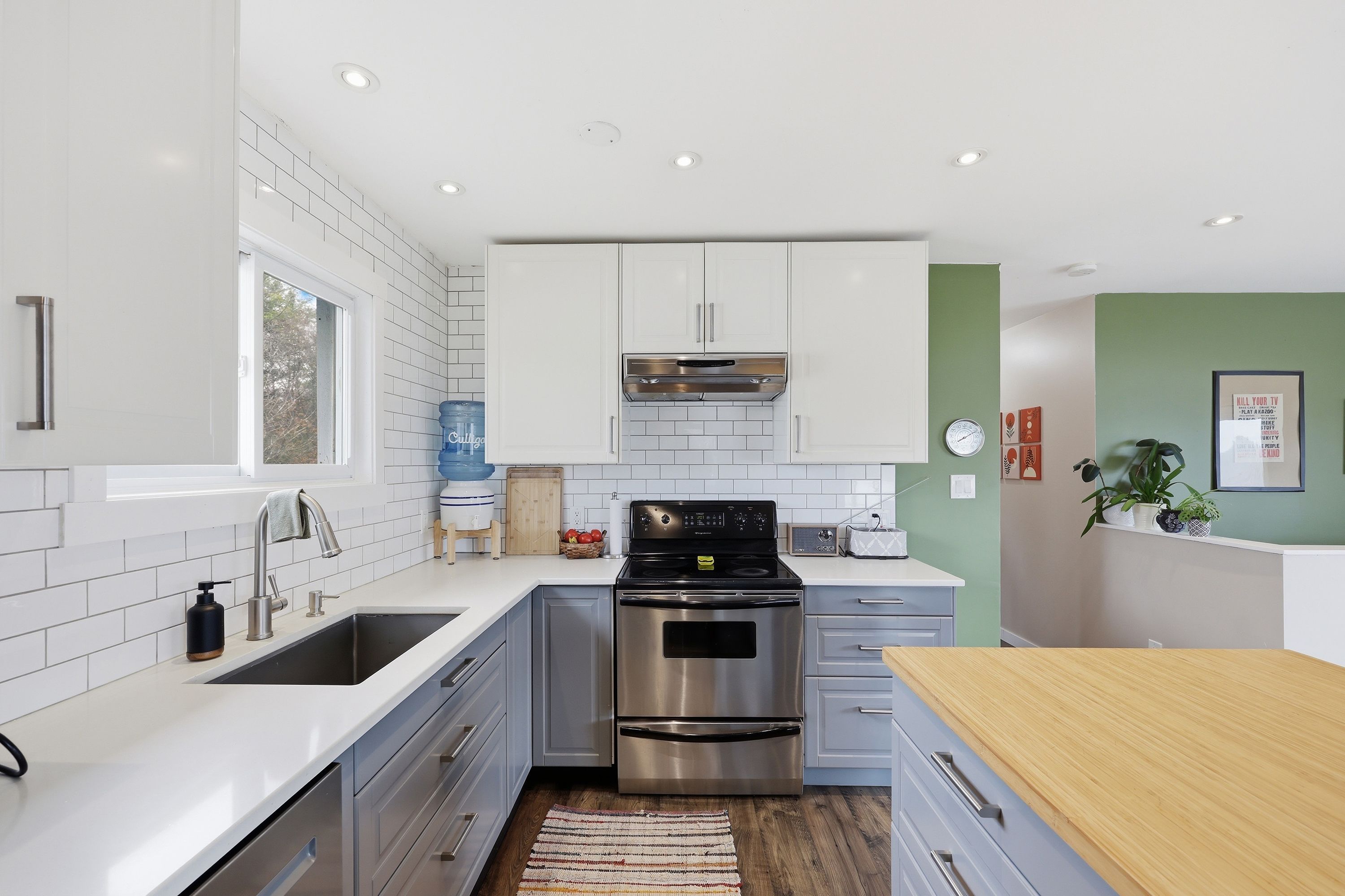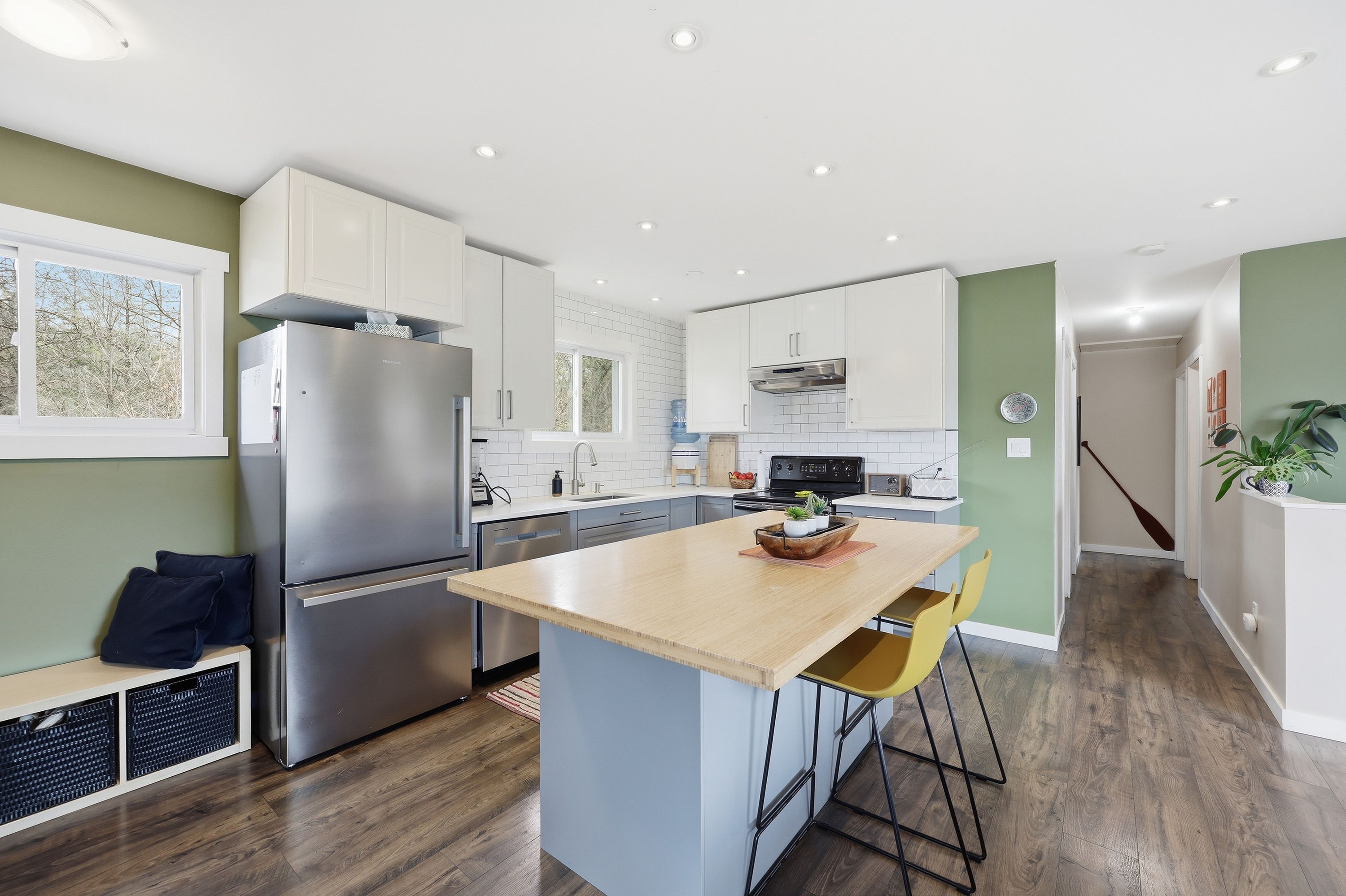 • Modern kitchen with stainless steel appliances and generous island seating.