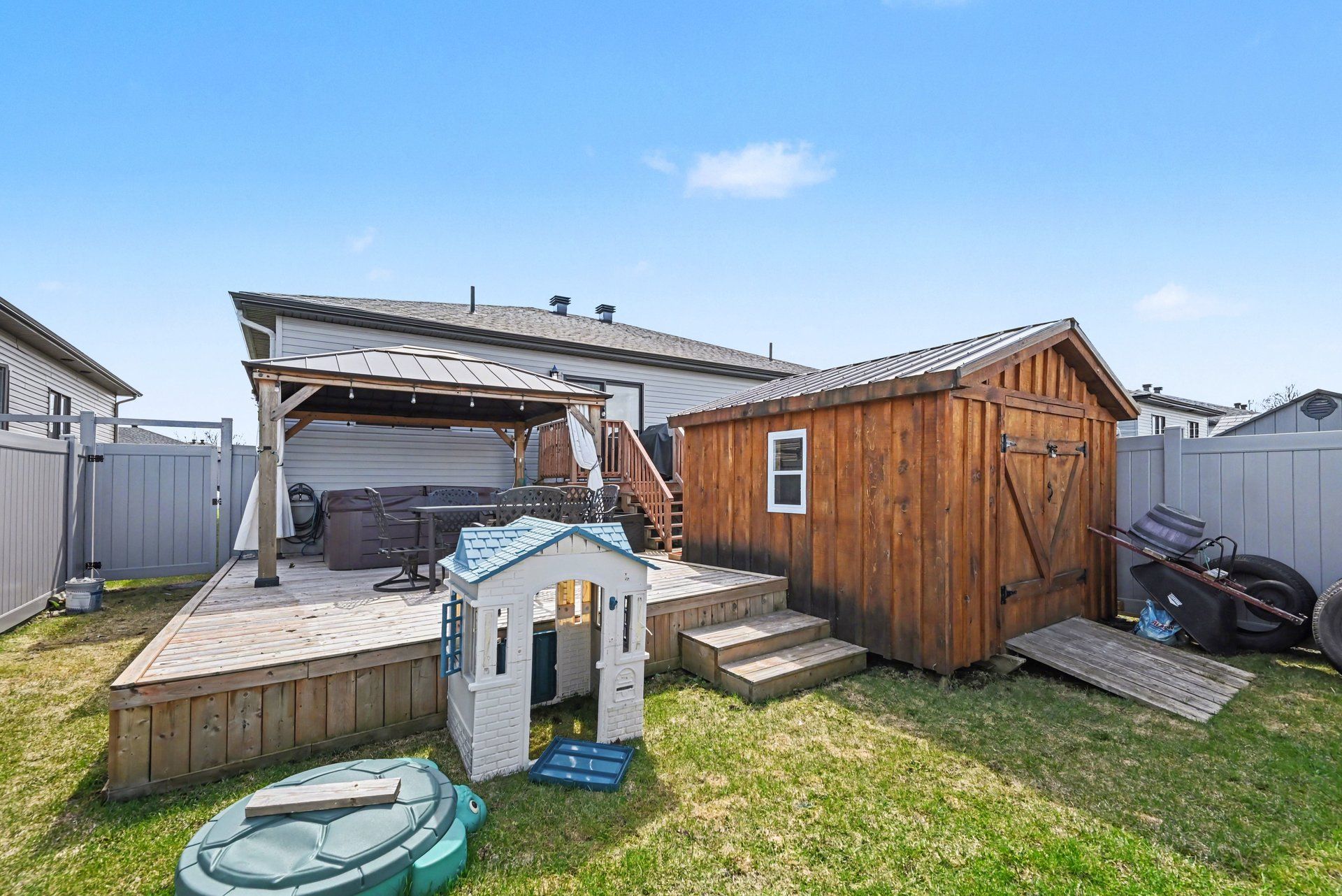• Private fenced backyard with a deck and hot tub for relaxation.