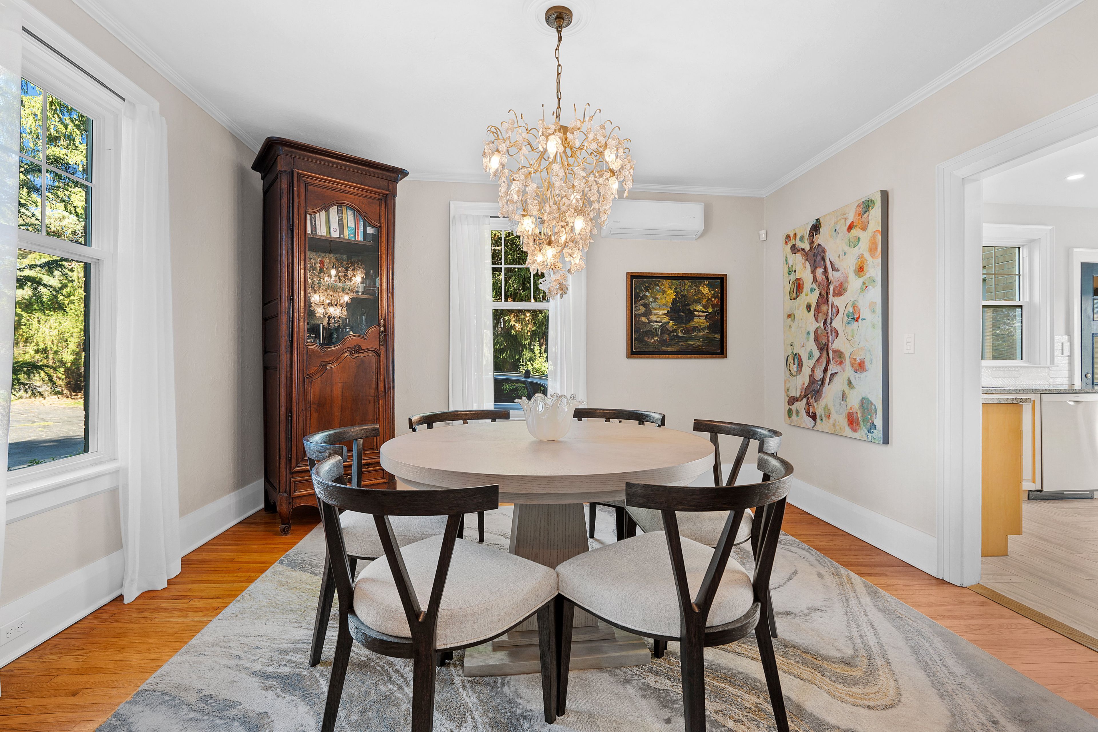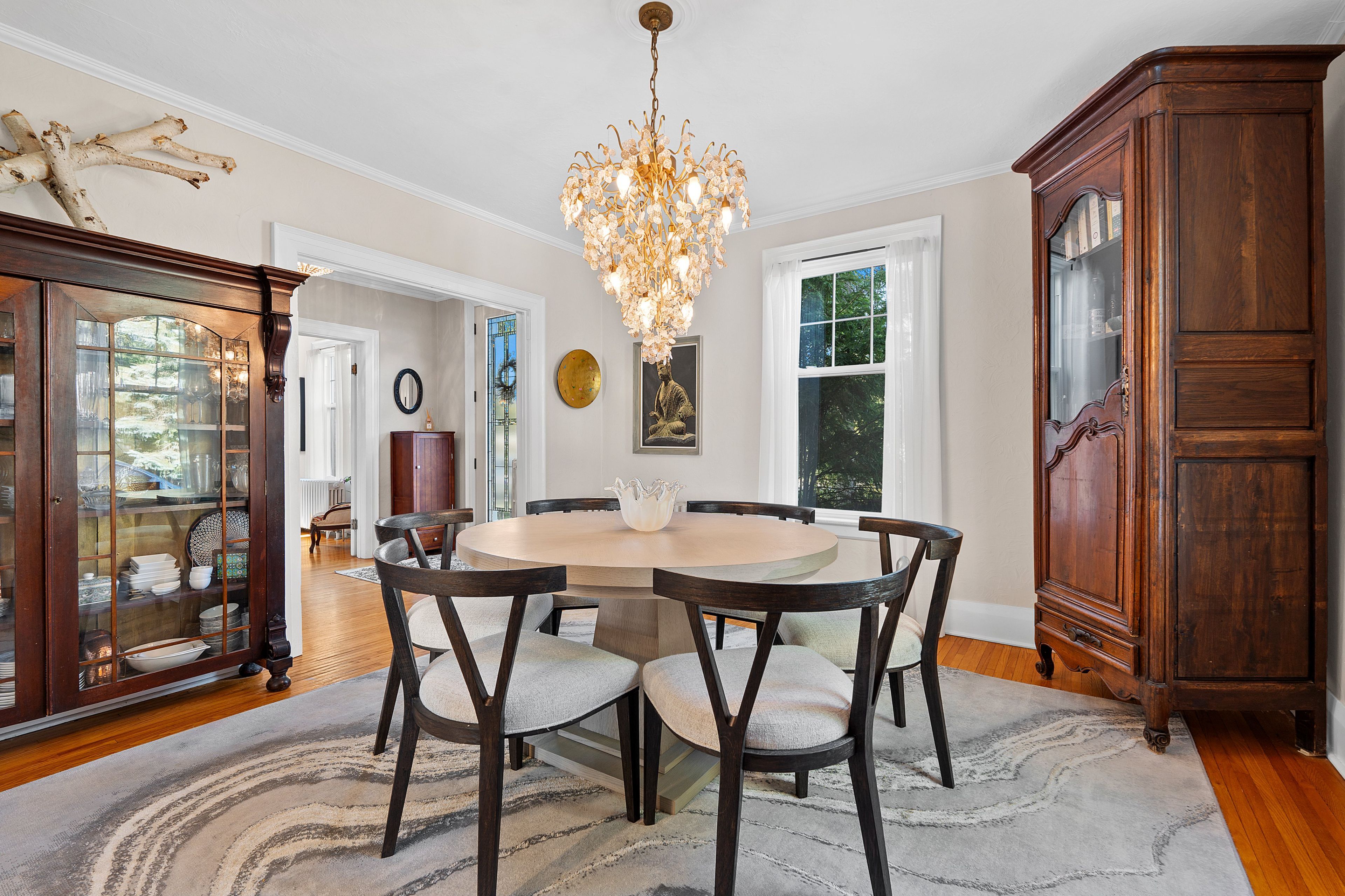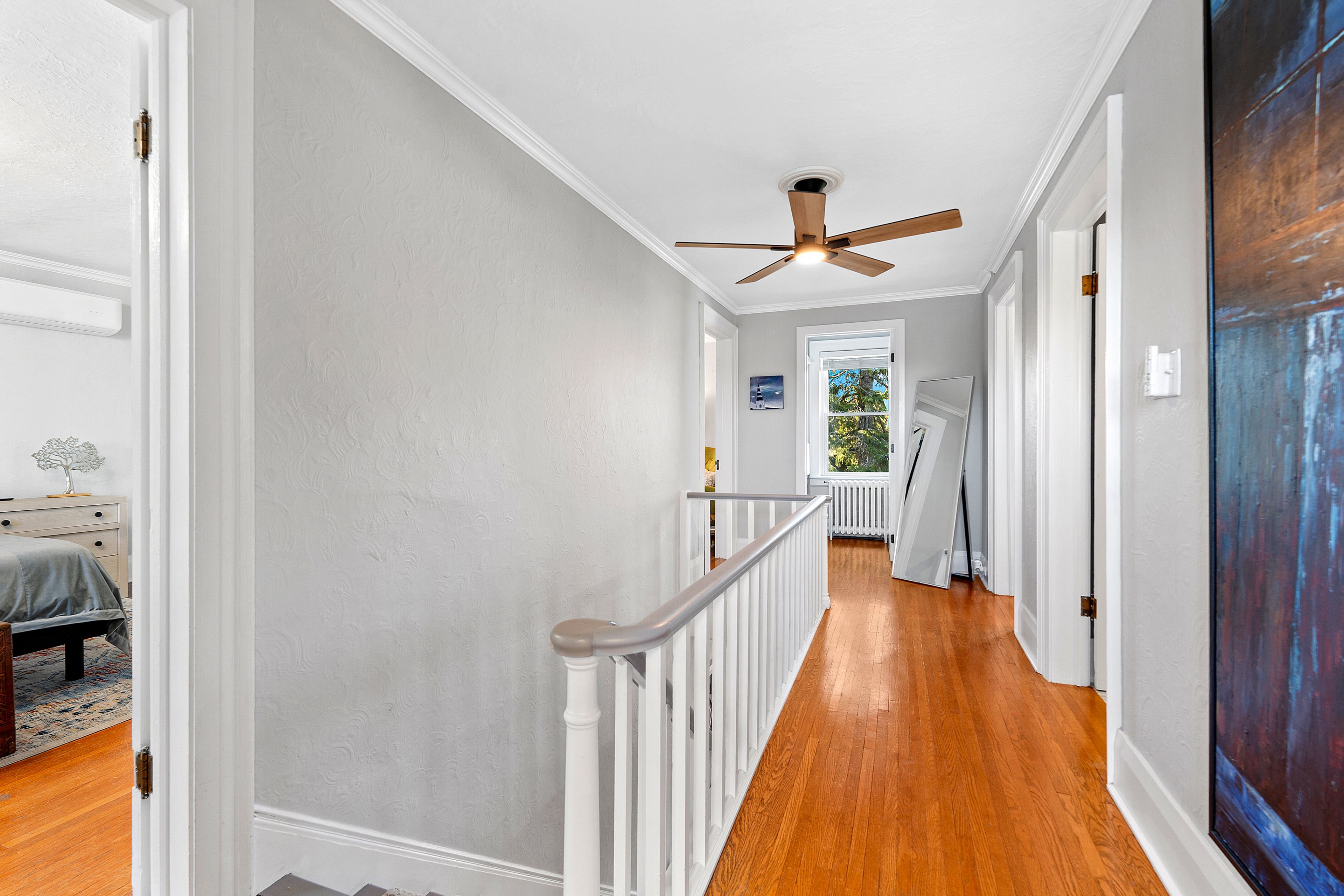• Welcoming foyer with a sweeping wood staircase and unique plaster walls.