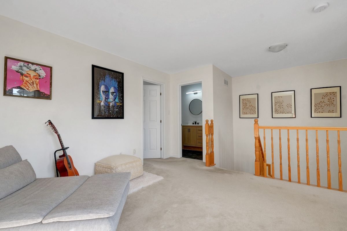 Tucked away on a peaceful crescent and steps to the park, this 2 bedroom + loft home offers style, space and convenience. A private and spacious front porch welcomes you, with plenty of space for a shaded seating area. The light and bright main floor features hardwood floors, an open layout, and large windows bring in lots of natural light. The focal point of the living room is the fireplace, with floor to ceiling windows on either side. Convenient access to the back yard and a large wooden deck - no rear neighbours overlooking your space! The kitchen is bright and functional, featuring stainless steel appliances, modern subway tile backsplash, loads of counter space, and plenty of cabinetry to keep everything organized. Upstairs, the floor plan offers a spacious loft area (ideal for a home office or a cozy lounge), two bedrooms, and a fresh main bath with recently updated double sink vanity and modern lighting. The finished basement adds even more living space, with a rec room featuring barn doors and a built-in desk area. You'll also love the attached garage with inside entry - especially in the winter. Come and see for yourself what this home has to offer!